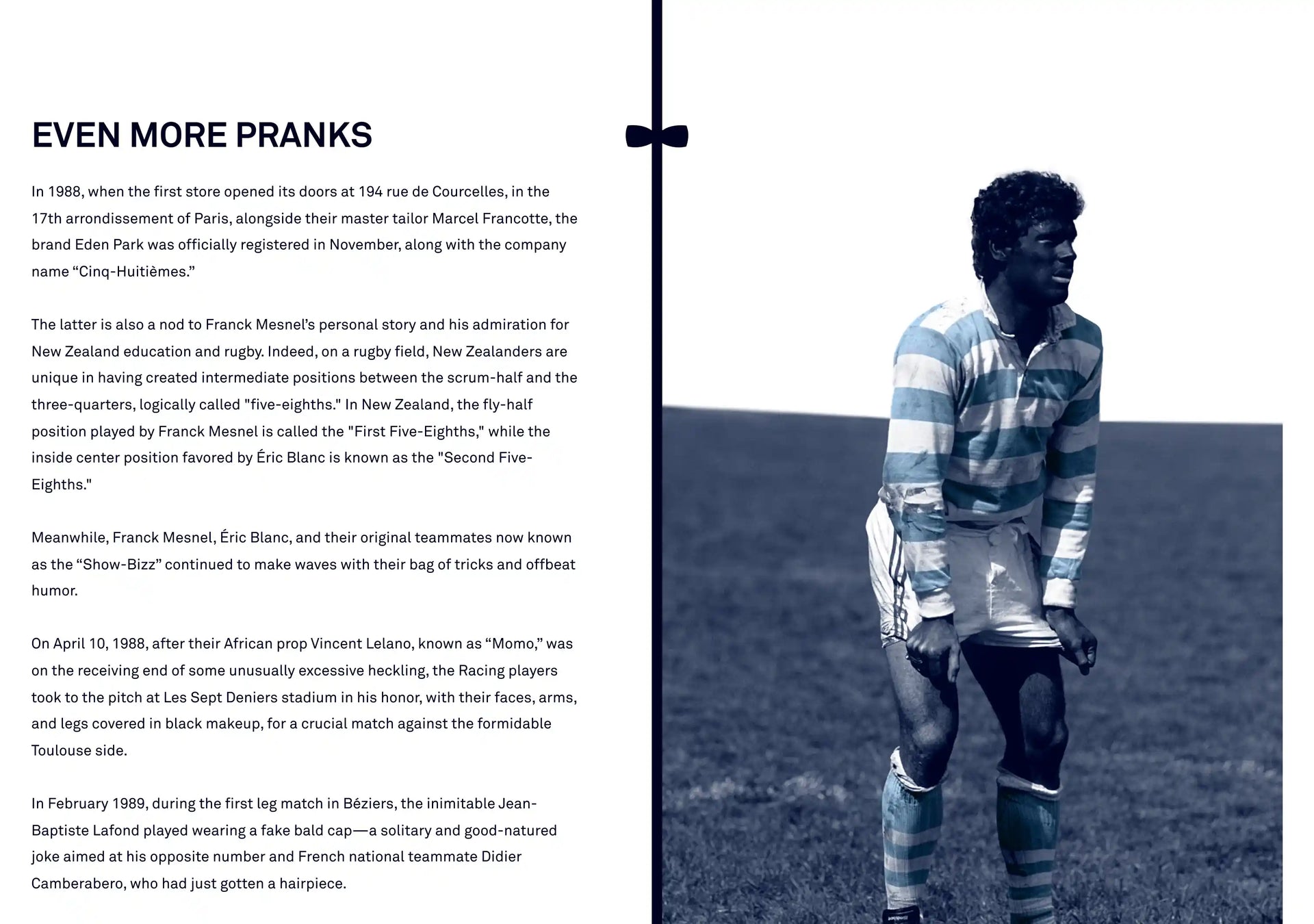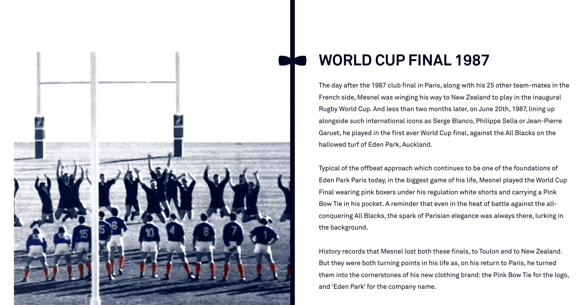 Eden Park. The name itself, as we shall see, is synonymous with the game of Rugby. But over the past 37 years, the brand of clothing, and its iconic Pink Bow Tie logo have also become synonymous with a certain style. Stylish but never stuffy, chic but always comfortable, respectful of tradition, but always pushing the boundaries of innovation. In France it’s known as the Eden Park look, an uncompromising search for elegance and meticulous attention to detail. Combined with high-quality ethically sourced fabrics, the brand boasts a unique fusion of contemporary Parisian chic with Eden Park’s own authentic, and unmistakable, identity.
