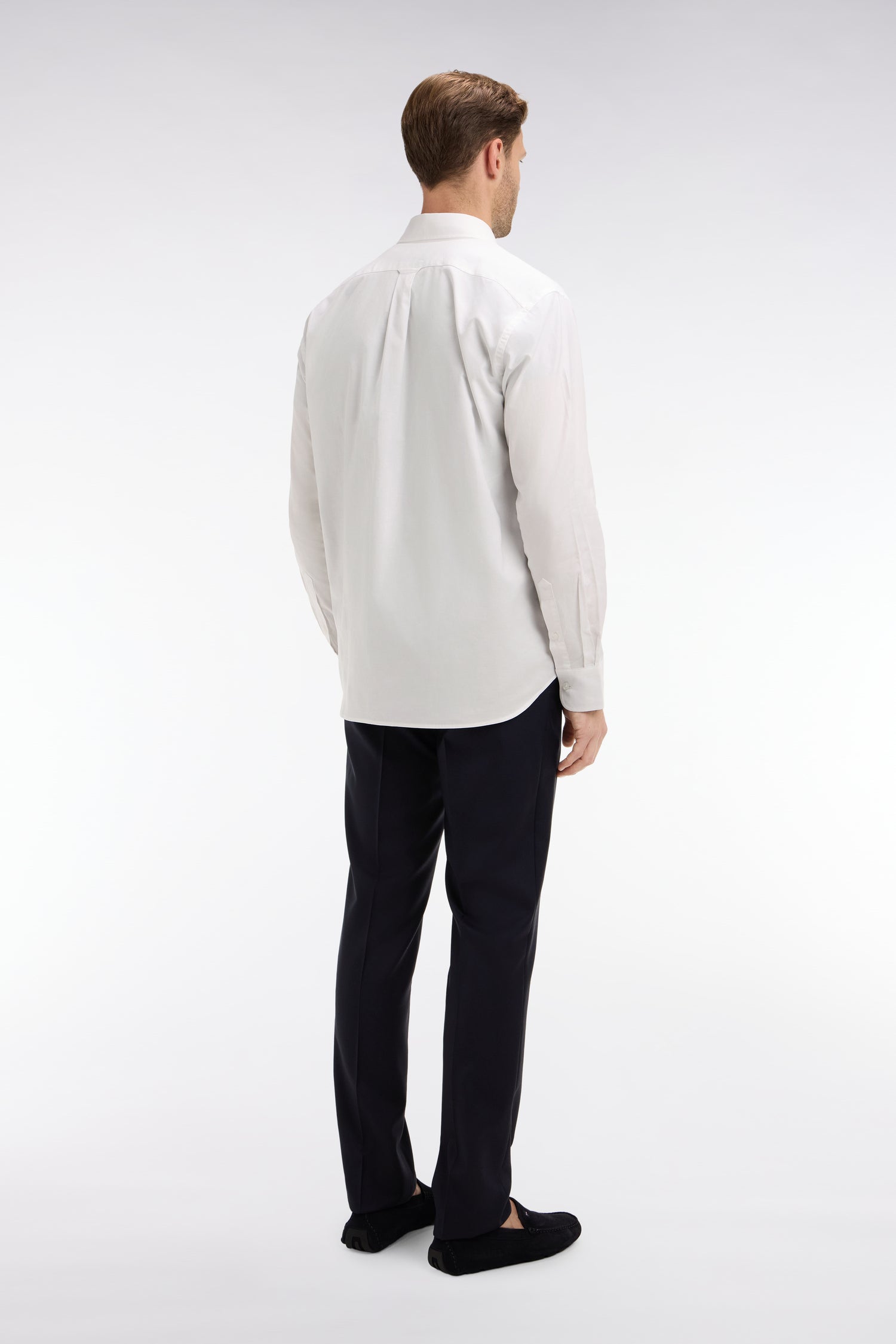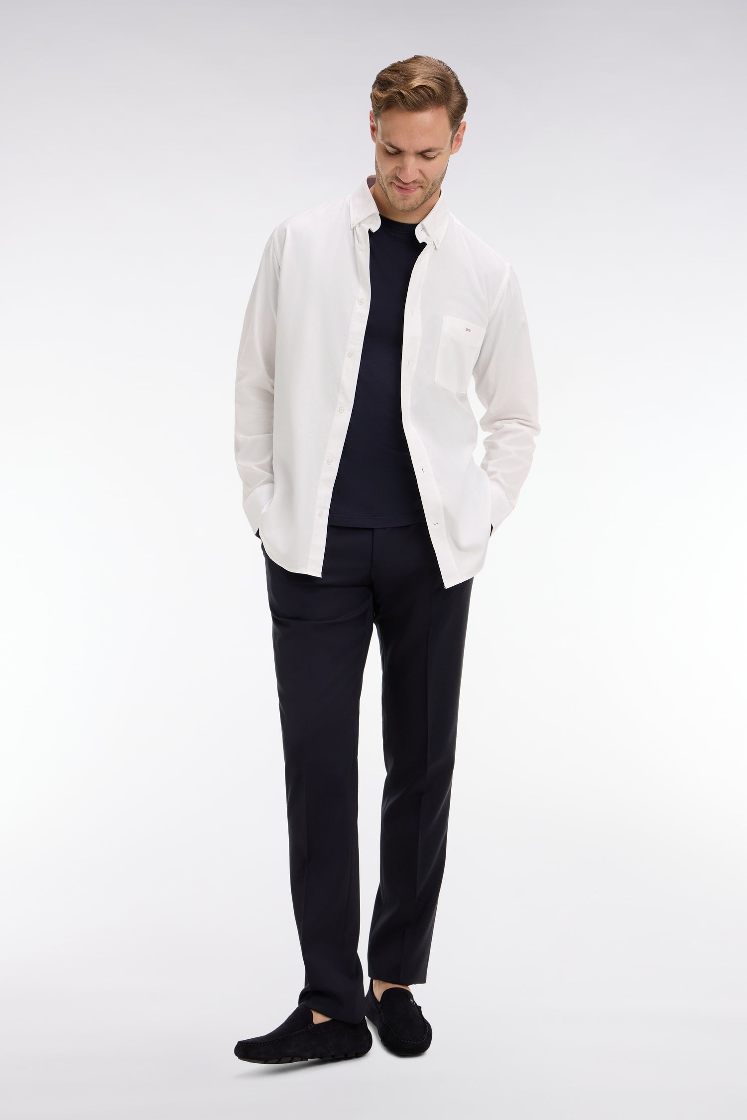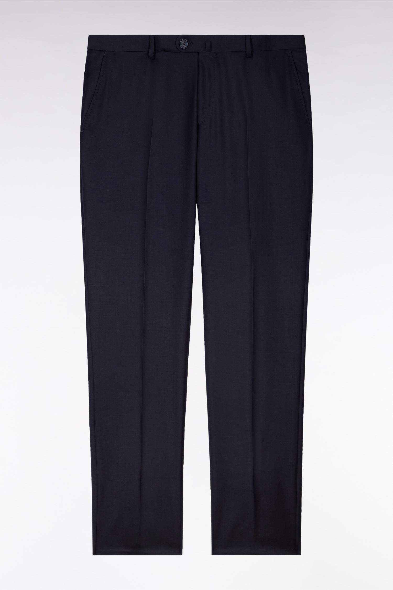 Slim dark blue wool trousers with broken fold