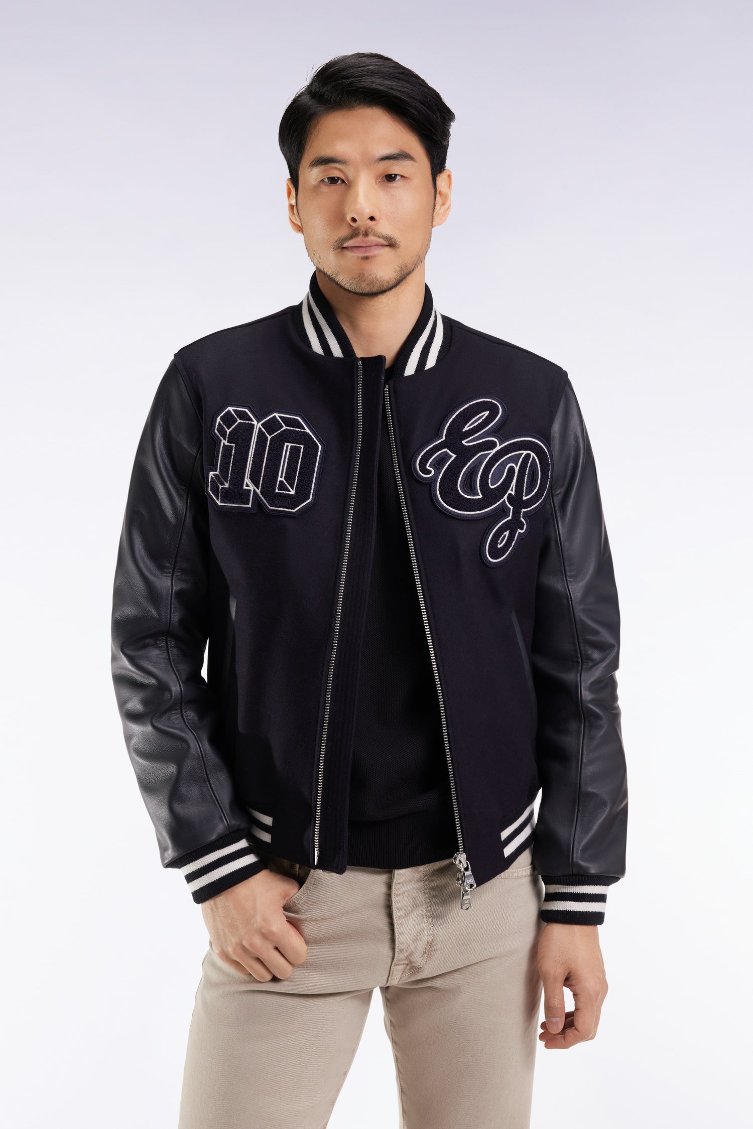 Fall for the revisited varsity spirit of this assertively styled navy Teddy jacket. With its wool-blend flannel body, genuine leather sleeves and striped ribbed trim, every detail embodies Eden Park's expertise and the sporty inspirations of our fashion collections. Emblematic embroidery, cameo hooped inner lining and leather trim on the pockets make this Teddy jacket a bold twist on a men's wardrobe classic. A nod to our company's sporting heritage, revisited with elegance. Silver metal double-slider zip closure