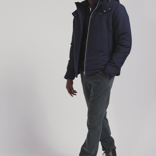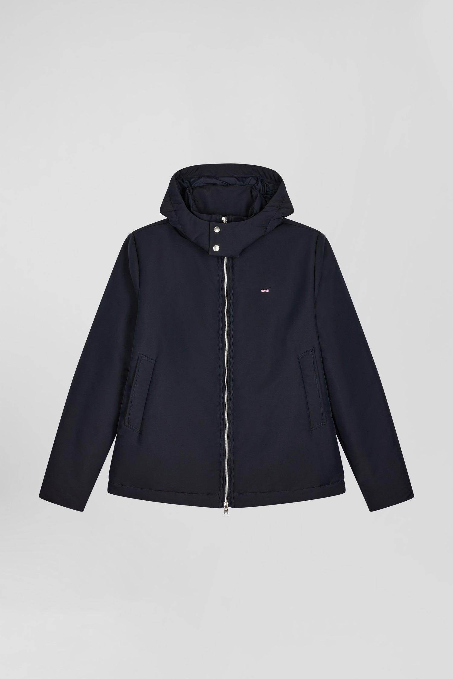 Discover the perfect blend of functionality and style with this peach-skin-touch nylon jacket. Complete with a fixed snap-fastening hood and plain nylon lining, this men's jacket offers comfort and protection. Its signature two-way zip and piped pockets combine with two zipped inside pockets for maximum practicality. The sleeves are trimmed with knitted ribbing.