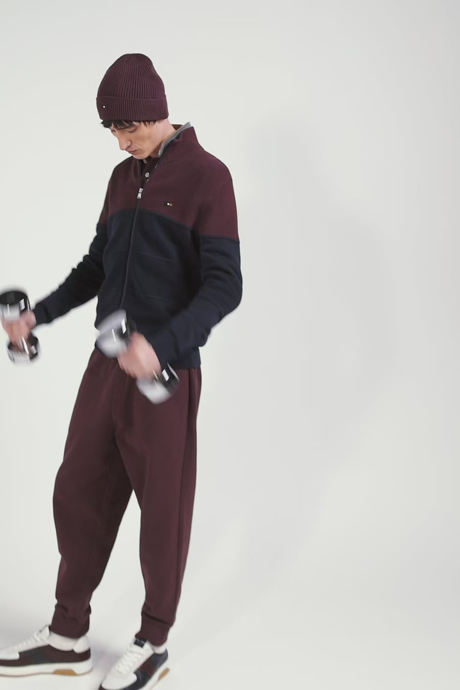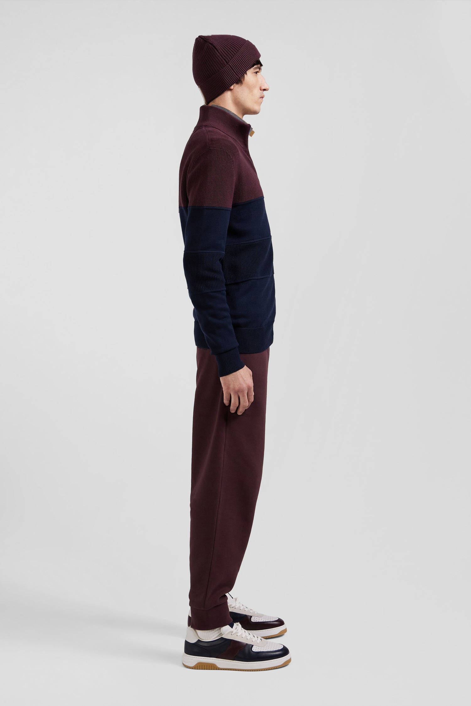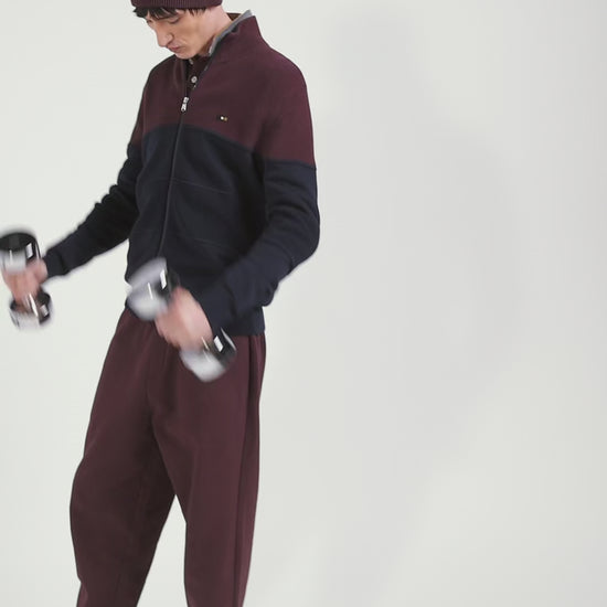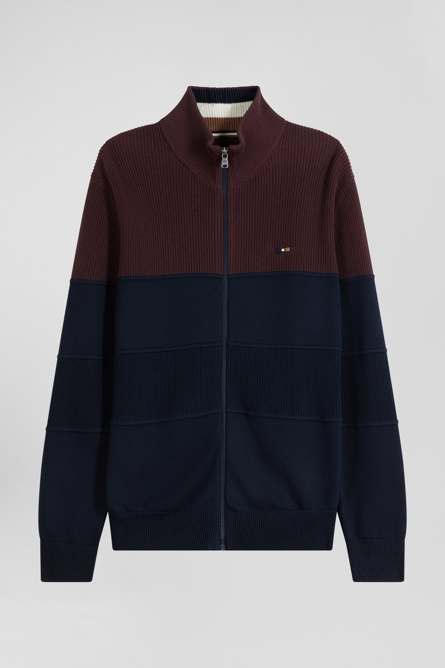 Regular navy blue and burgundy cotton high collar zipped cardigan