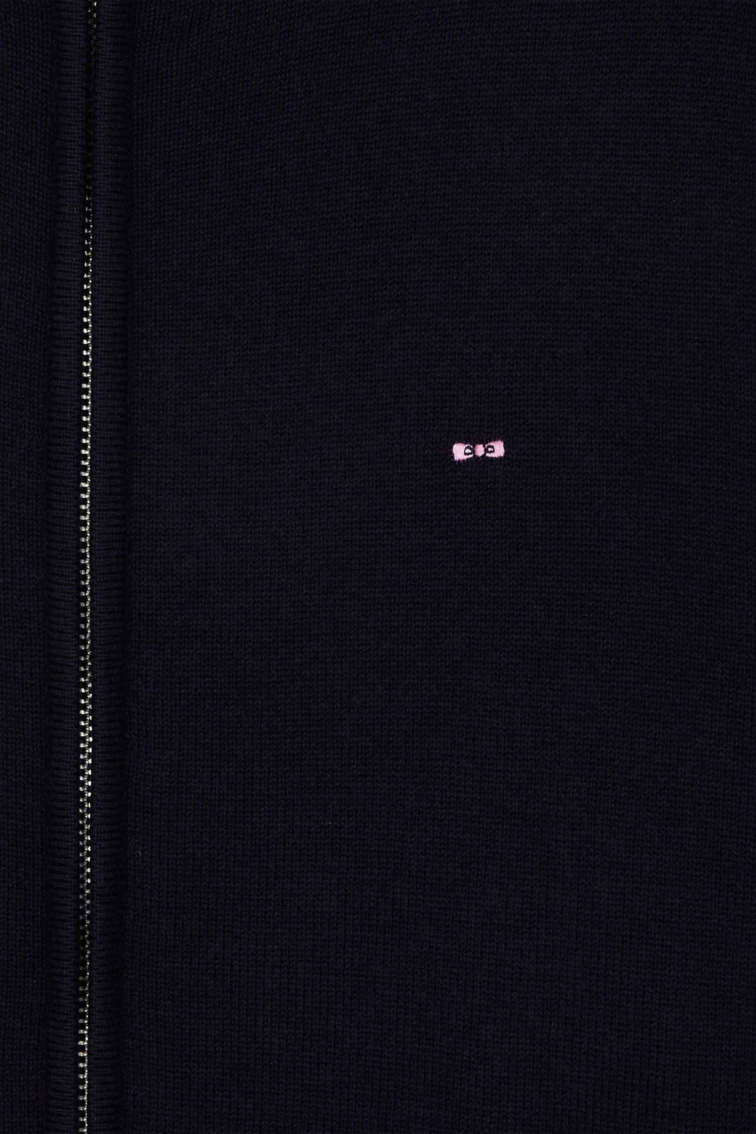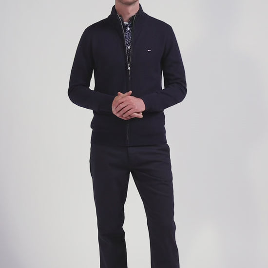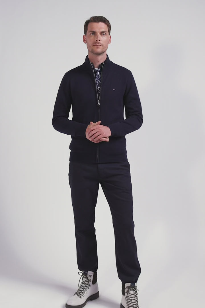 Regular navy blue plain wool and cotton zipped cardigan