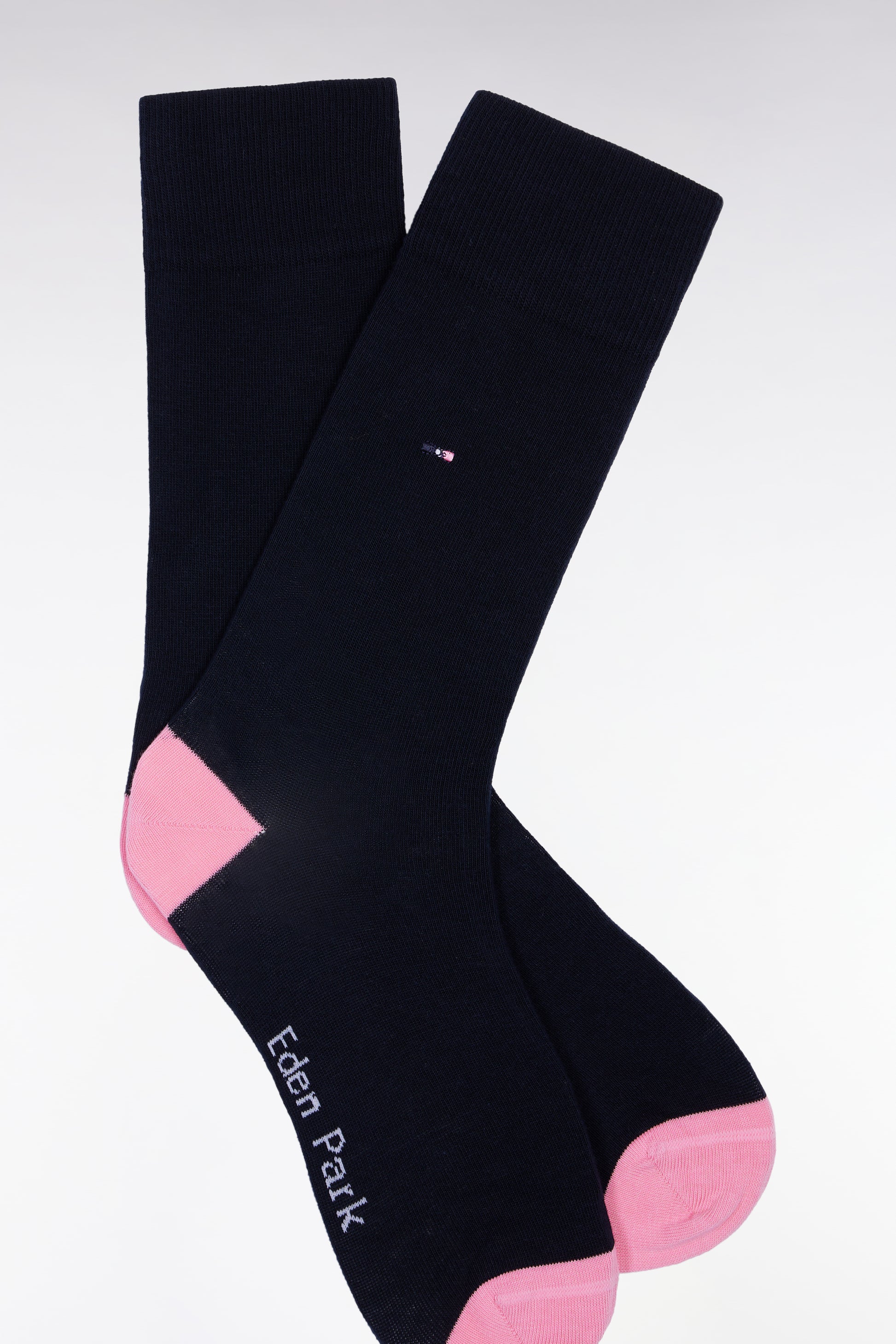Behind their sobriety, these plain men's socks hide a colorful toe and heel. A contrasting note that brings a touch of controlled audacity to a classic model. On the ankle, a small bowtie embroidery in pink thread underlines this accessory's place in the Eden Park wardrobe.