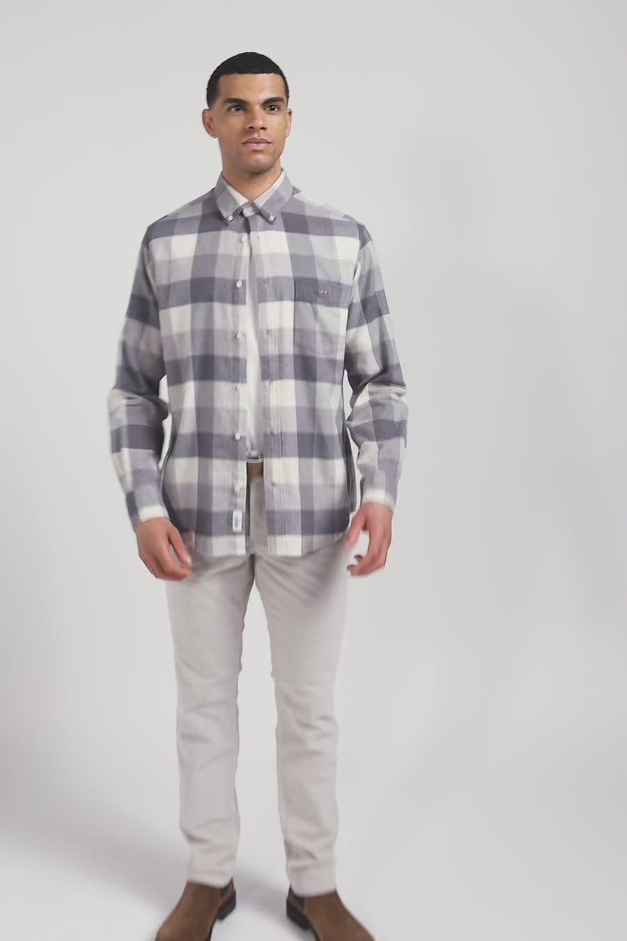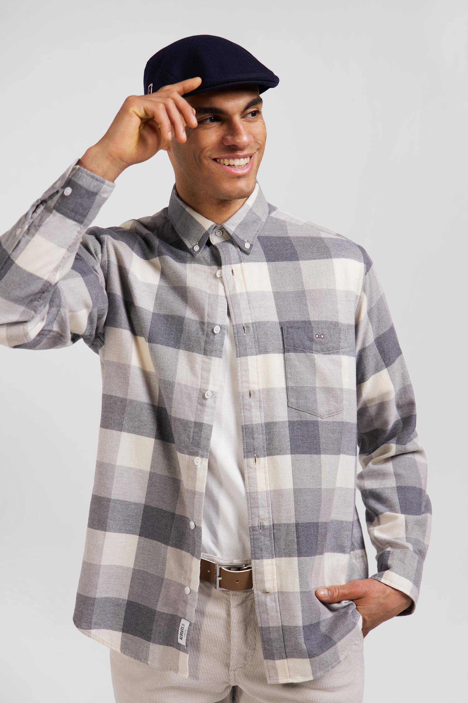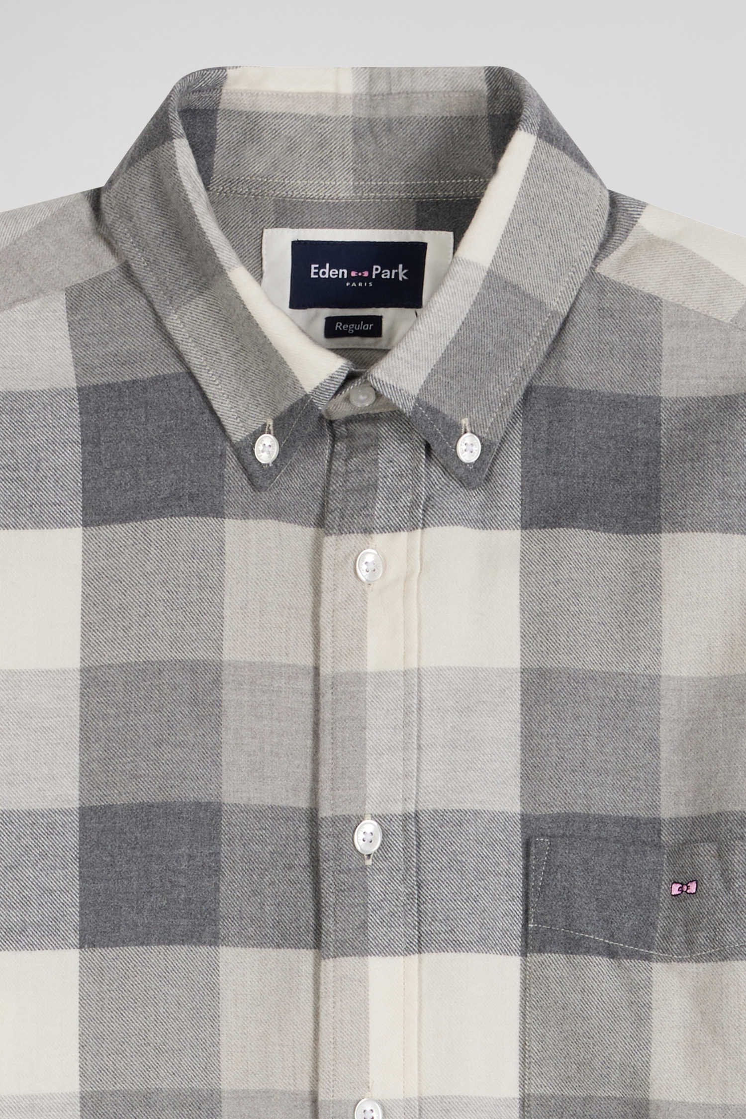 In gray or pink, discover the casual charm of our soft cotton plaid shirt, a fall-winter wardrobe essential. With its straight cut and button-down collar, this men's shirt with patch pocket offers comfort and elegance. The embroidered pink bow tie on the chest adds a distinctive touch, perfect for a trendy, casual overshirt.