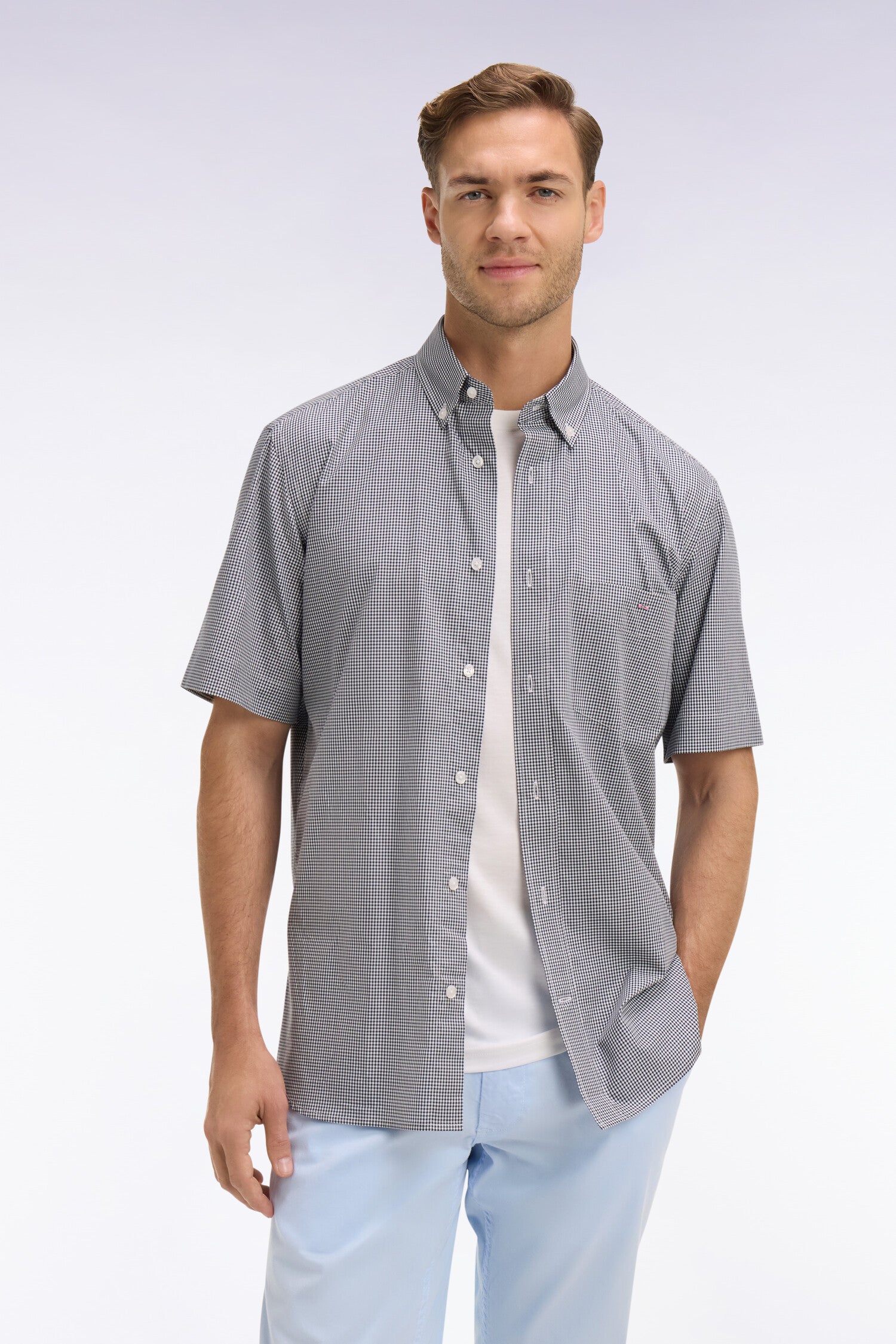 Cette chemise à manches courtes rend hommage au motif Vichy, revisité dans une palette fraîche et masculine. La popeline de coton pure offre confort et résistance, tandis que la coupe droite aux bas de pièce arrondis flatte la silhouette. Un essentiel estival qui incarne à la perfection l’équilibre entre tradition française et modernité.