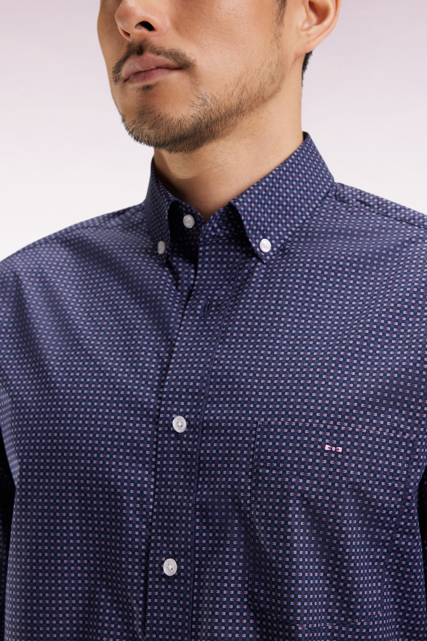 Elegant and subtly graphic, this men's shirt in Pima cotton is distinguished by the finesse of its exclusive micro-print, featuring the emblem of the house: the bow tie. Available in a classic navy hue, it features a straight cut for comfort and impeccable fit. The natural softness of Pima cotton, selected for its superior quality and ecological commitment (its cultivation is more water-efficient), is combined with meticulous finishing touches, from the button-down collar to the signature pink-thread embroidery on the chest. An easy-to-wear piece that captivates without overdoing it.