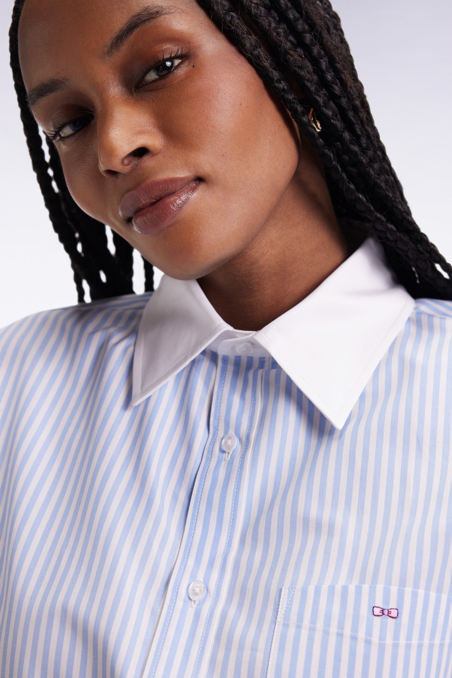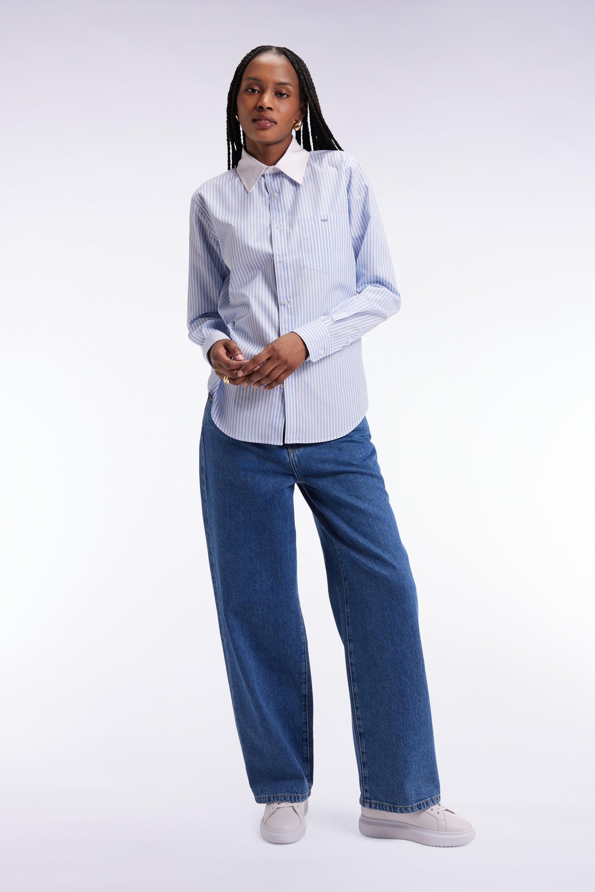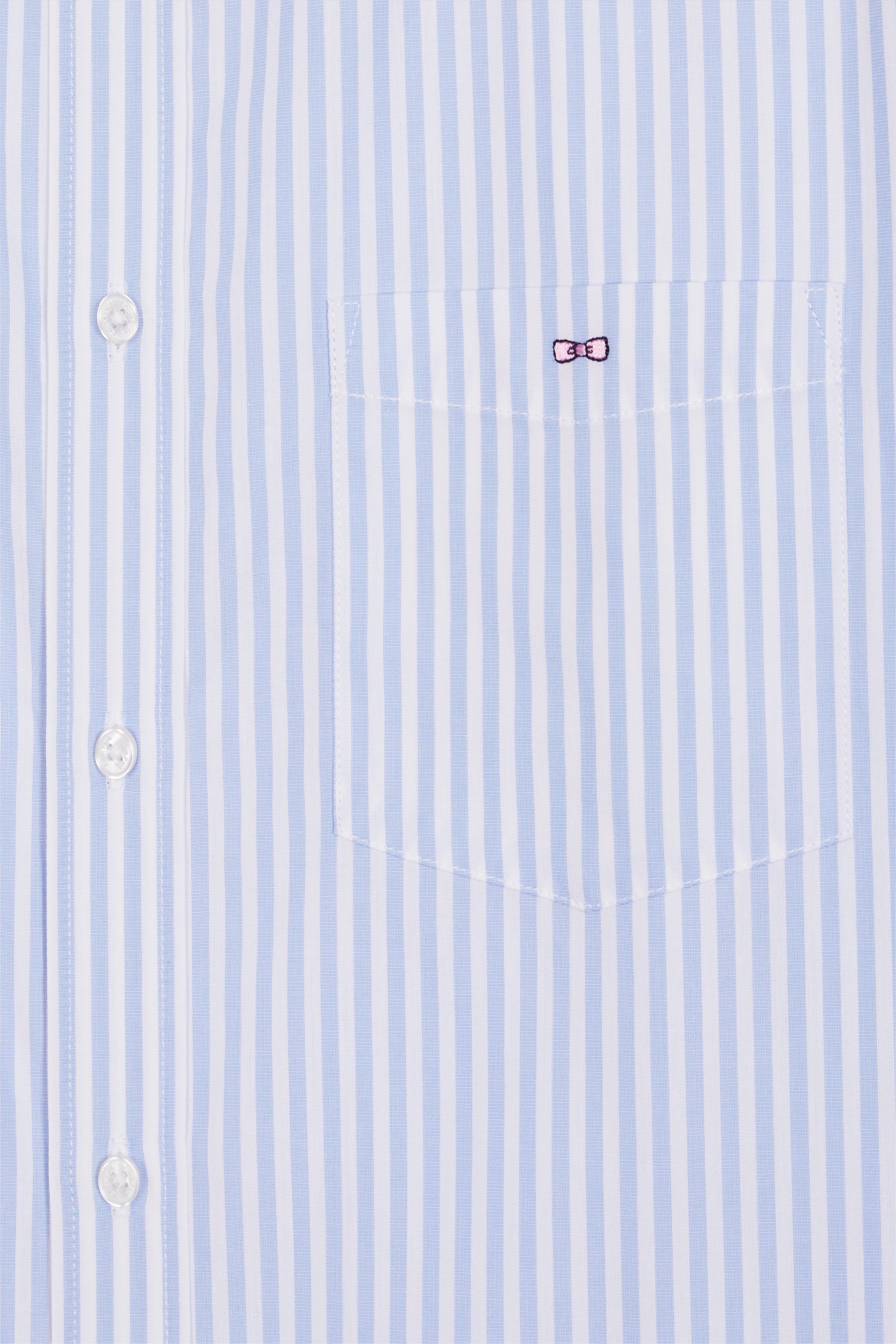 This blue and white striped shirt features a slim fit for a slimmer silhouette. Its graphic look is softened by a patch pocket and classic white collar. An easy-to-divert piece, from the office to the weekend.
