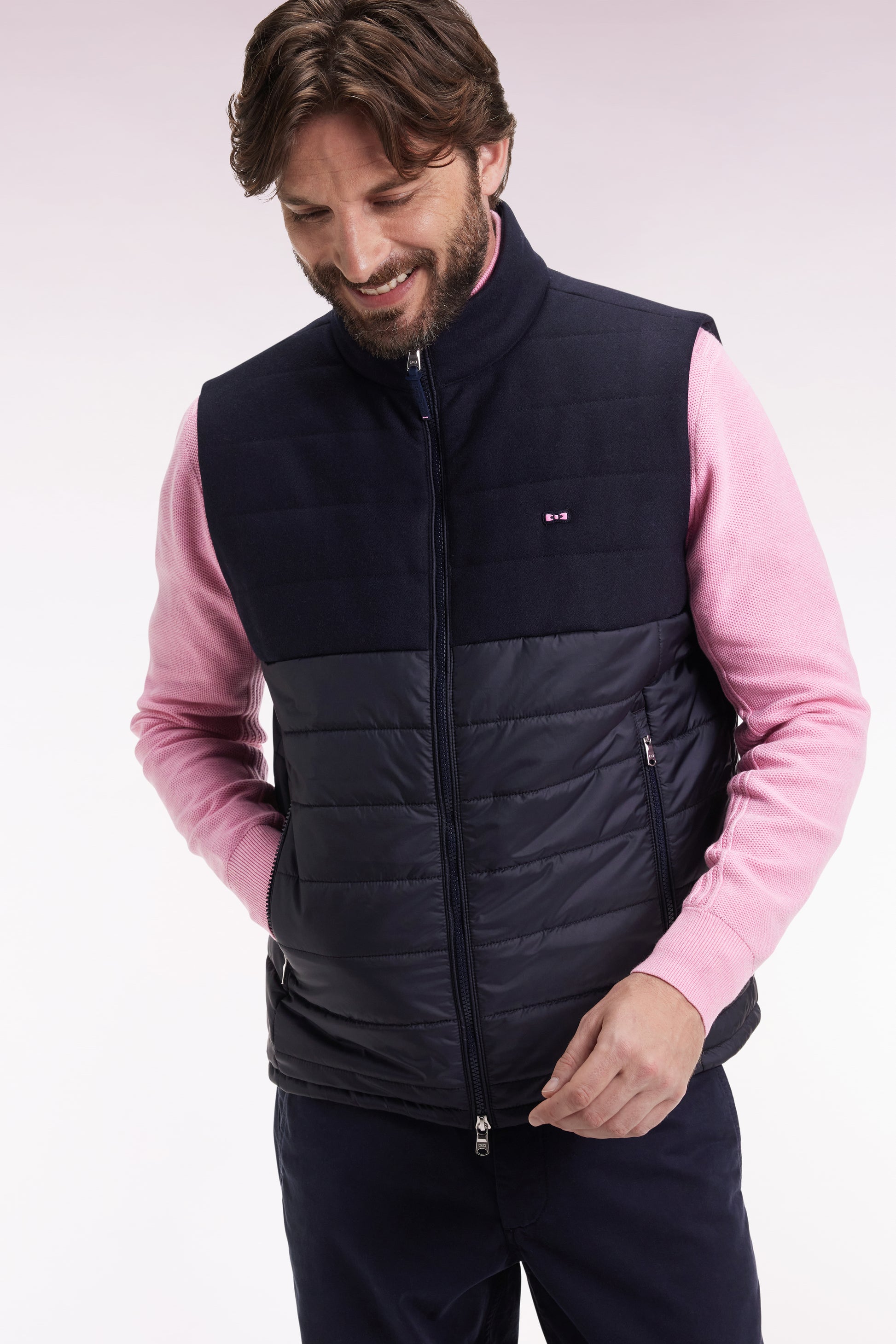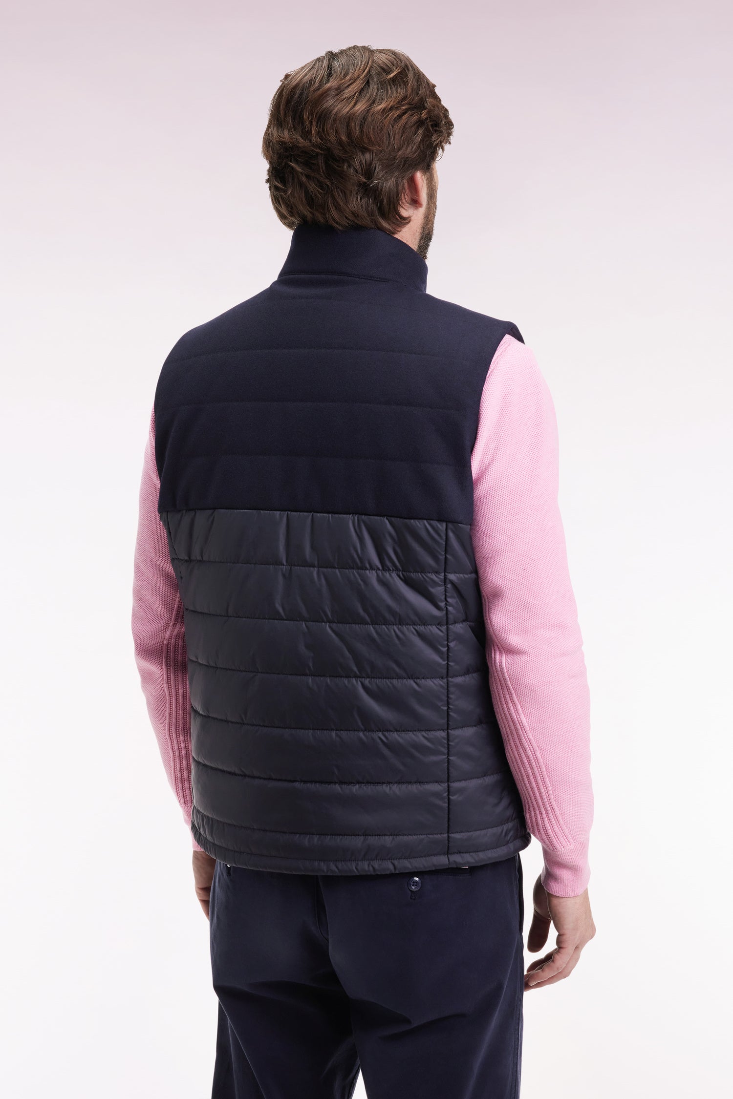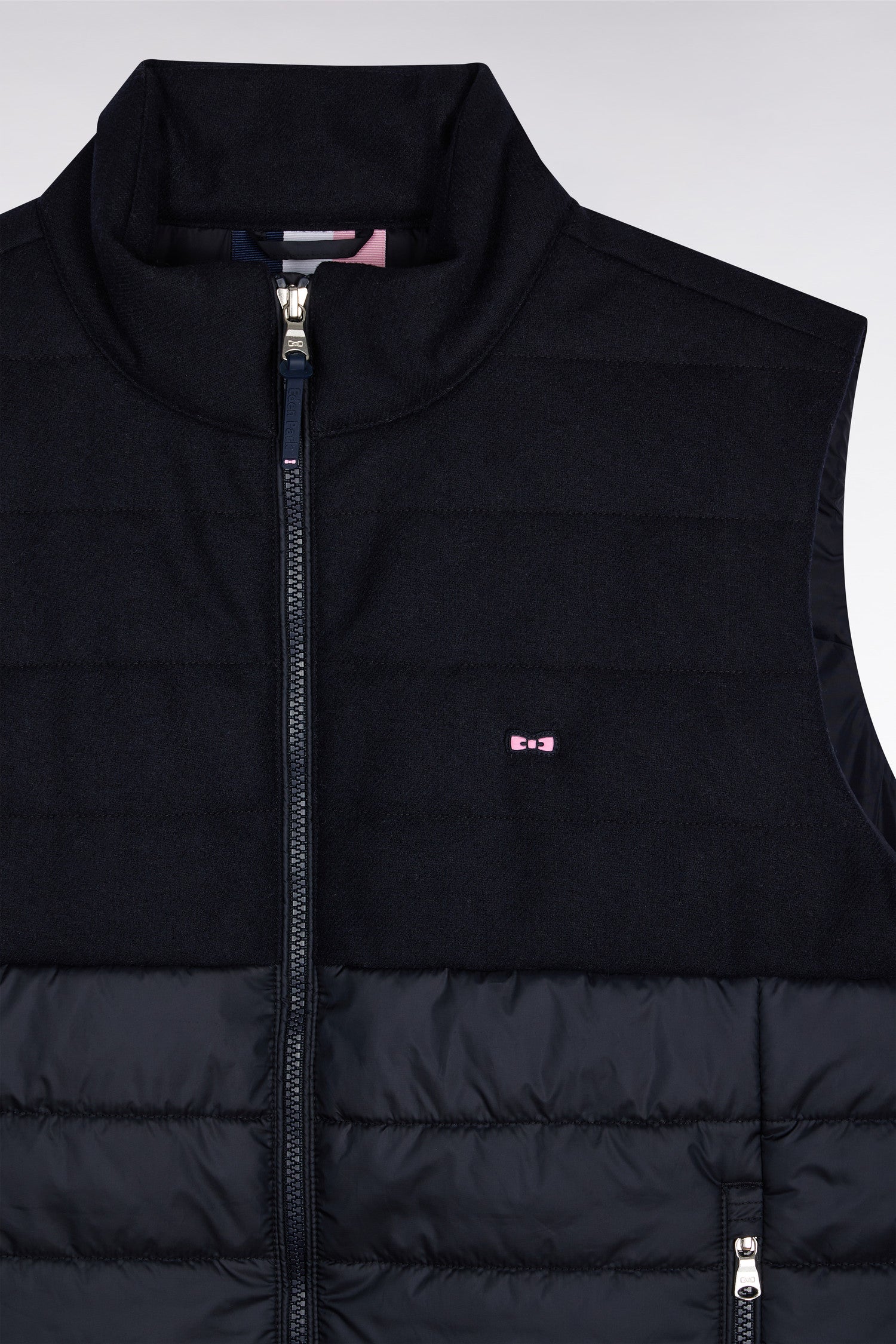 Two-material sleeveless down jacket in nylon and navy flannel