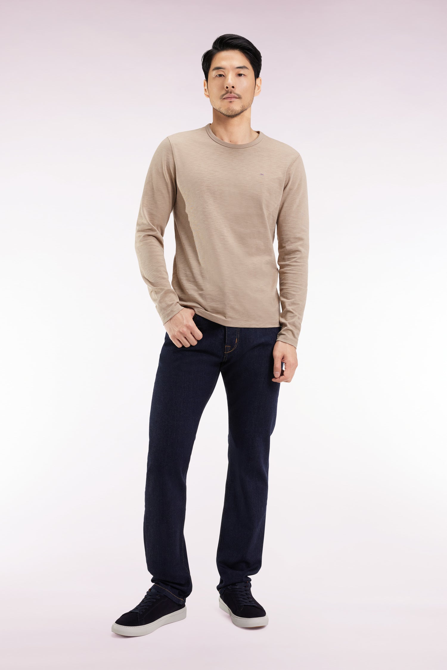 These men's jeans in raw stretch denim feature a deep, almost black hue for an elegant, assertive look in all circumstances. The straight Regular cut combines comfort and fit, for structured everyday wear. A basic with character, perfect with a white shirt or turtleneck. Stretch denim