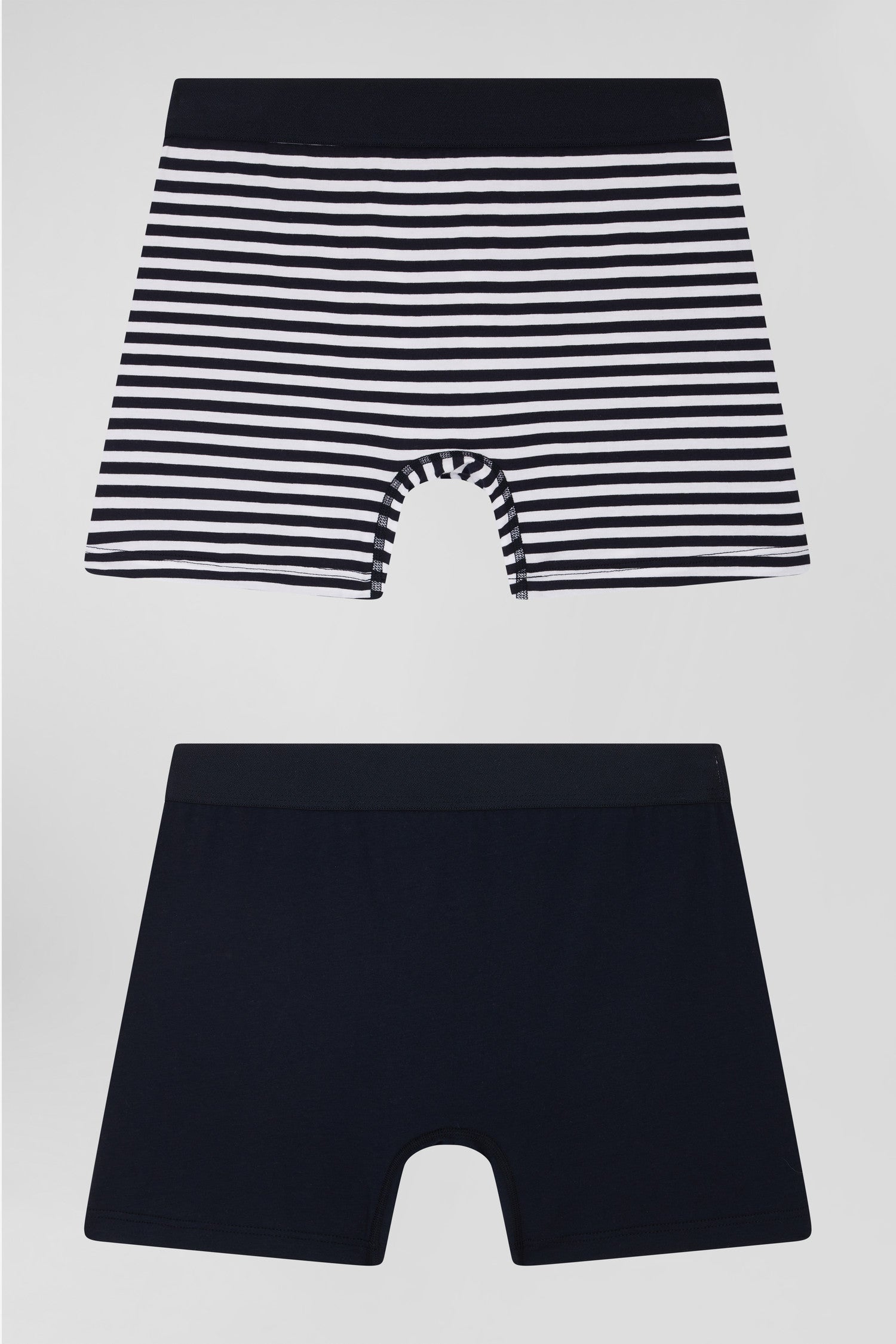 This set of two 100% cotton boxer shorts includes one plain and one striped model. Add these trendy, comfortable models to your underwear collection, promising softness and support.