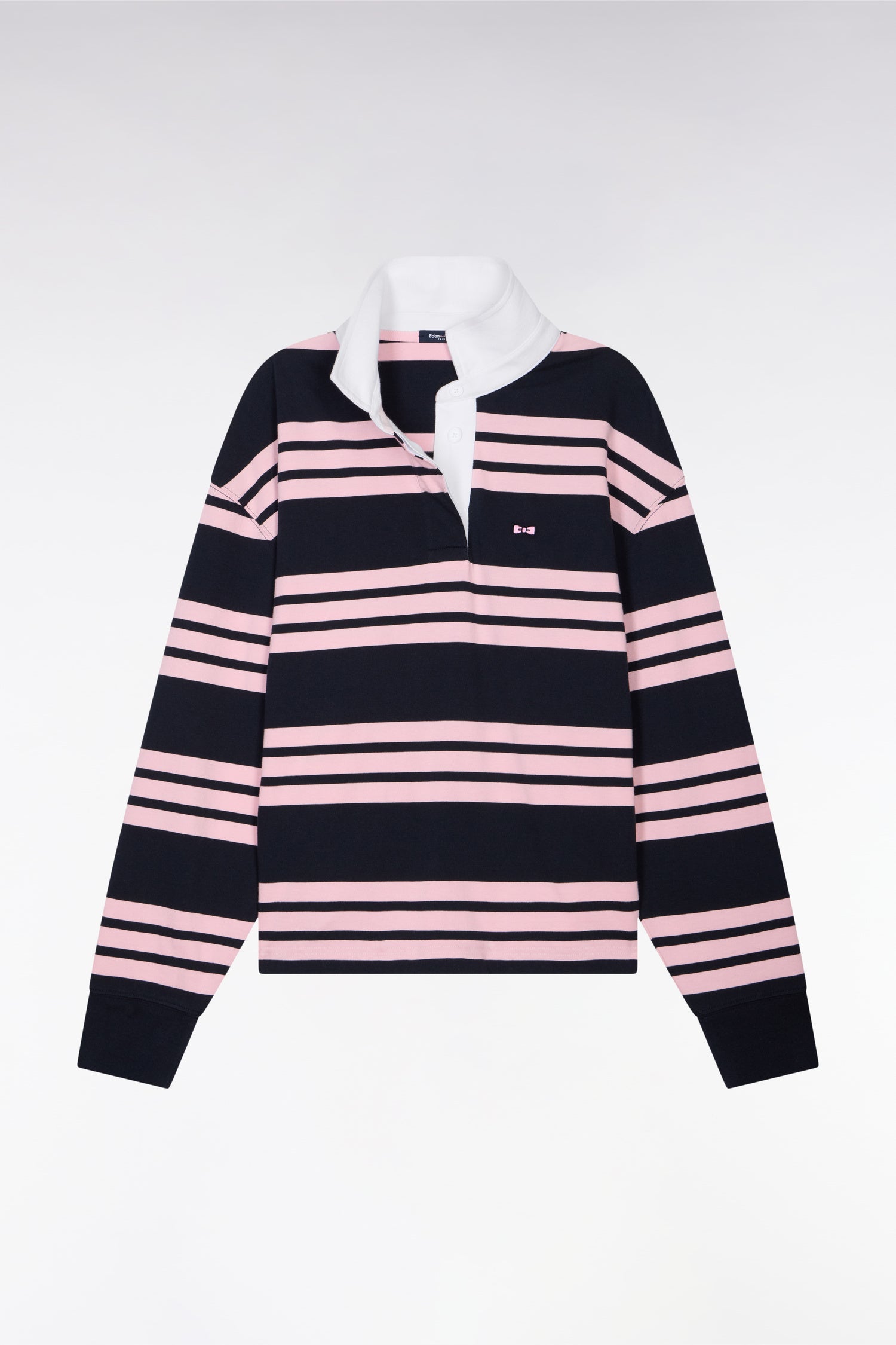 Iconique, le maillot de rugby Eden Park pensé pour la ville investit le vestiaire femme. Ce maillot oversized à rayures revisite l’esthétique rugby dans une version féminine des plus contemporaines. Confectionné en pur coton, il séduit par son volume généreux, sa plaquette de boutonnage en ruban chevron et son nœud papillon brodé pour un style à la fois authentique et tendance. Idéal avec notre jean flare ou un bermuda en denim pour casser les codes, il peut aussi se porter avec notre jean barrel blanc, rappel de son col contrasté, pour une allure preppy revisitée. Une pièce sport-chic, confortable et irrésistiblement mode.