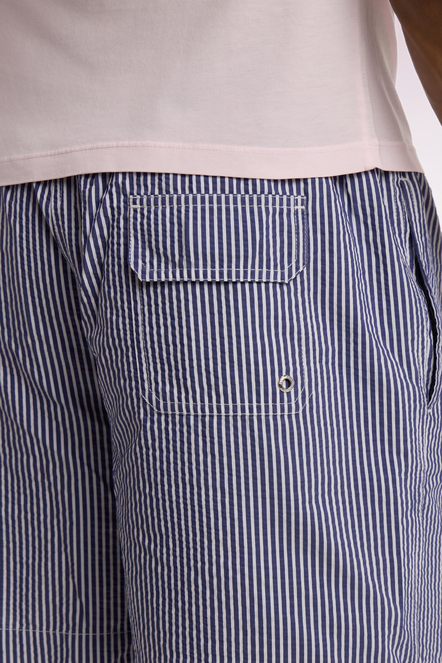 Ce short de bain pour homme, rehaussé de fines rayures bicolores verticales apportera à vos tenues de plage une touche balnéaire aussi chic que décontractée. Réalisé dans un tissu seersucker légèrement gaufré, il présente un effet de texture authentique et élégant. Doté d’un cordon de serrage pour un ajustement parfait, il allie confort et style, idéal pour des journées en bord de mer ou à la piscine. Un modèle tendance et intemporel à la fois décliné en coloris blanc et rouge ou en bleu et blanc. De retour de la plage un tee-shirt suffit pour composer une tenue de vacances décontractée.