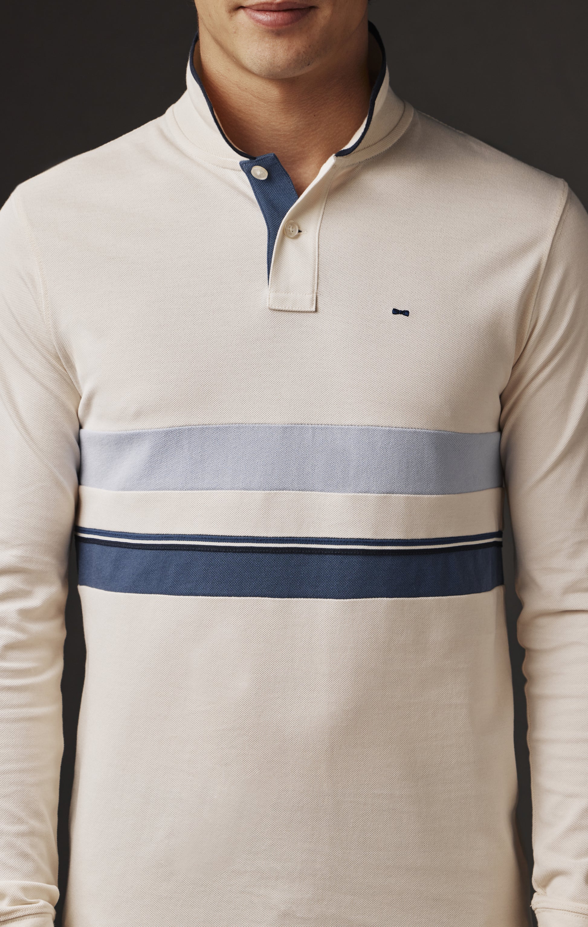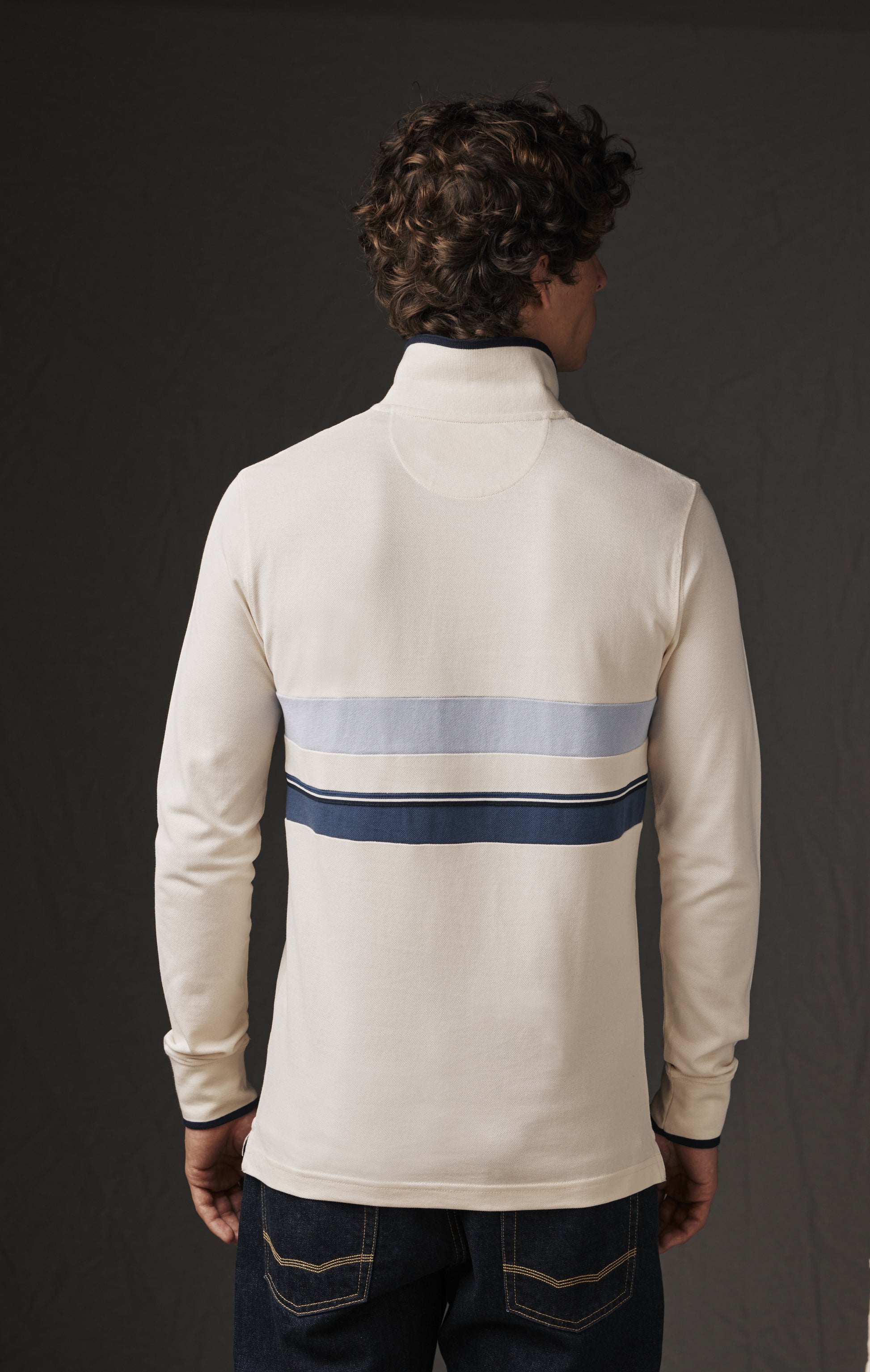 Pap'Atelier capsule collections are made up of unique pieces from our archives, upcycled thanks to the know-how of our Parisian workshop. Only one of each model is available on our website for a limited time. Committed to more responsible fashion that values every resource, this new Pap'Atelier edition features this long-sleeved jersey in white. To sublimate the effect, our atelier manager has added blue and sky stripes taken from Eden Park's dormant stock, as well as white braid to underline the patchwork effect, which is as graphic as it is modern. This upcycled men's jersey is only available in size small. Like all our men's jerseys, it features a contrasting button placket, here as a reminder of its collar edges, oval rugby buttons and our iconic bowtie embroidery.