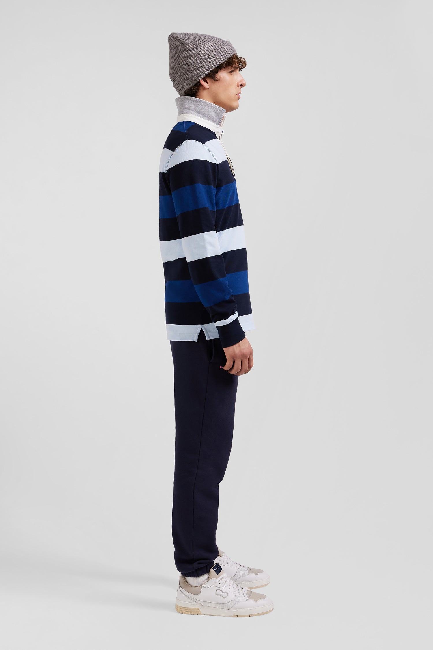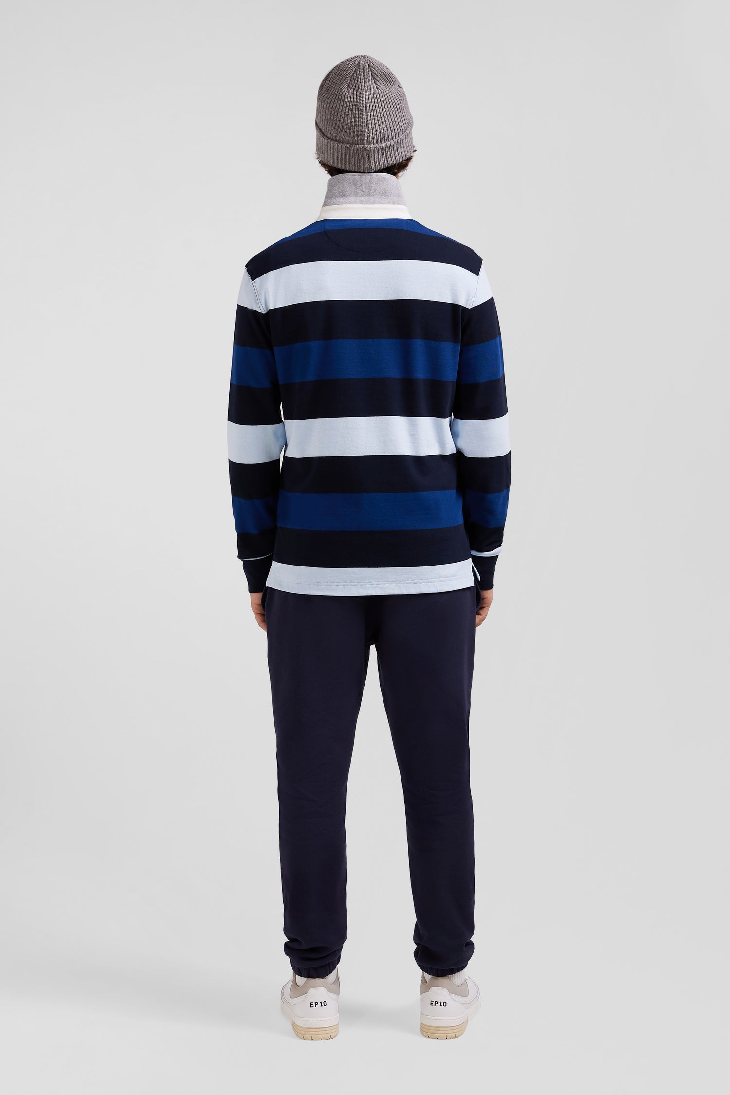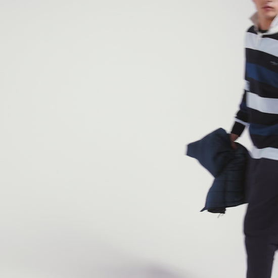 Our iconic cotton jersey hooped jersey is inspired by rugby, offering unique styling with its wide stripes and signature oval buttons. Perfect for those looking to combine a passion for rugby with a sense of fashion, this hooped jersey brings a sporty elegance to any wardrobe. This model is also distinguished by its bowtie embroidery enhanced by striped tie fabric.