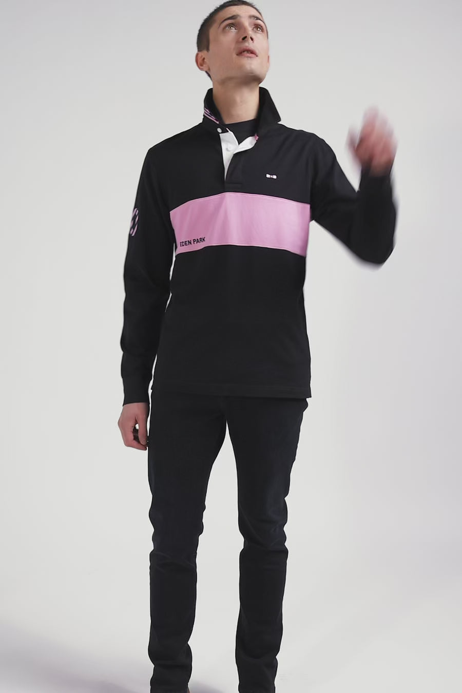 Regular long-sleeved cotton rugby shirt with navy and pink stripes