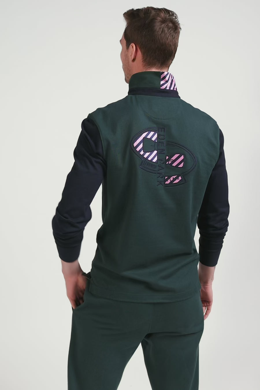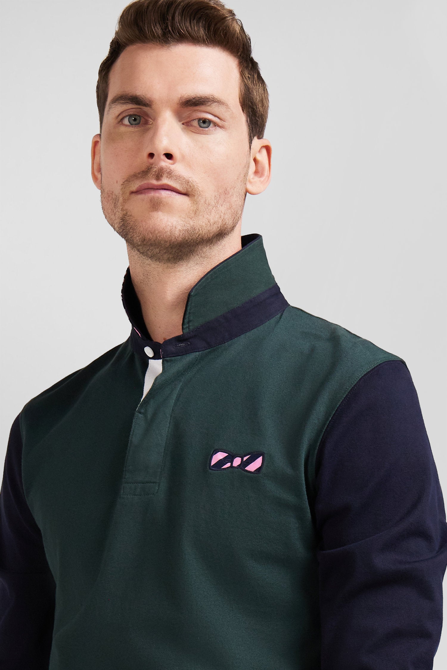 This men's jersey, with its long sleeves and straight regular fit, combines comfort and style in soft cotton jersey. The polo collar, half of which is lined with a hooped tie fabric, and its emblematic embroidery on the back embody the DNA and French Flair of the Eden Park wardrobe. A subtle reminder, the bowtie embroidery on the chest is slightly more visible and also features the navy and pink stripes so characteristic of the spirit of our collections.
