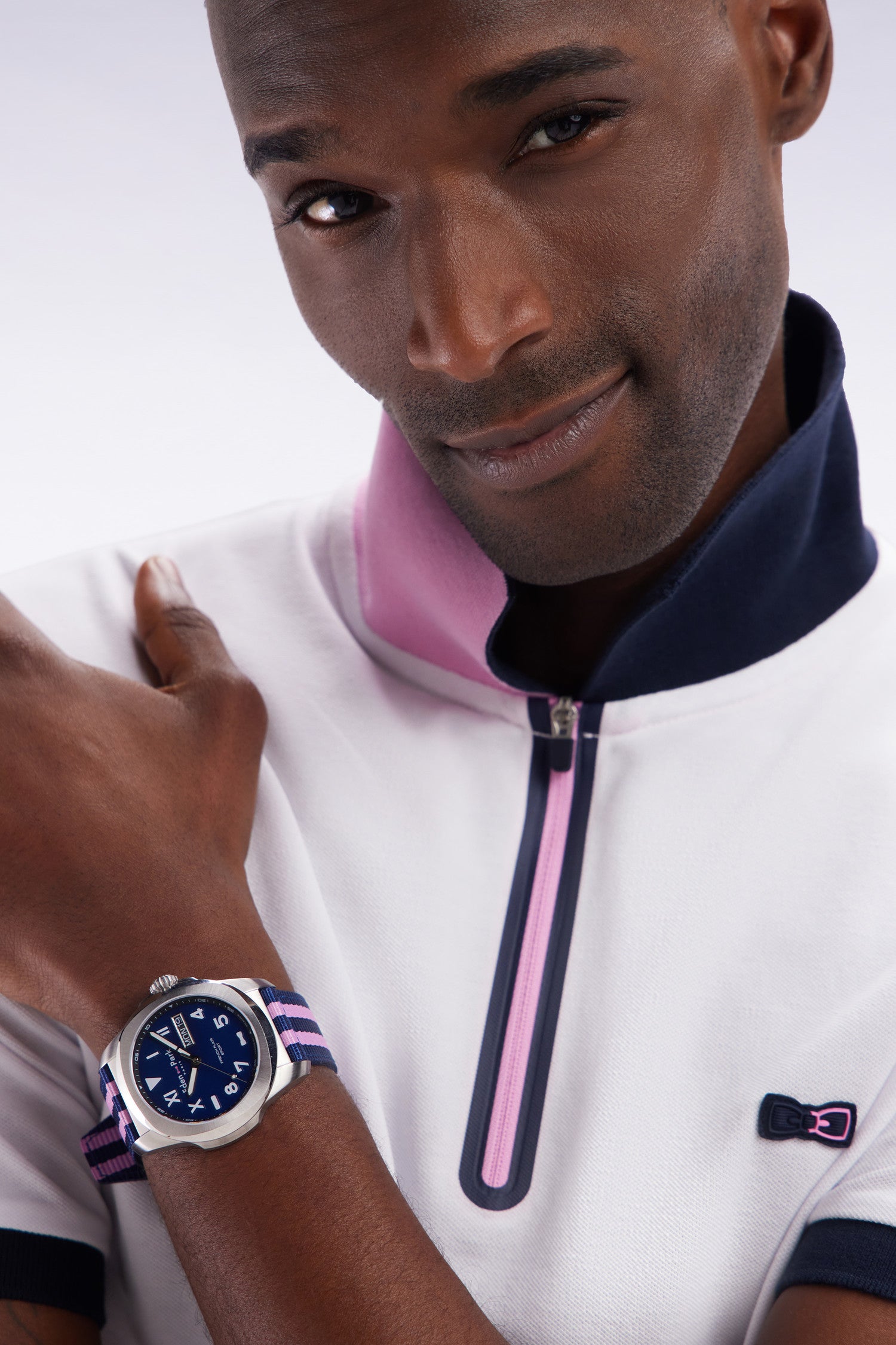 Reprenant les codes emblématiques du rugby, cette montre masculine arbore un boîtier en acier argenté associé à un cadran bleu profond. L'affichage de l'heure, par index bâtons, se divise en deux zones : chiffres romains en haut et chiffres arabes en bas, rappelant l’organisation stratégique d’un plan de match. Le cadran intègre également un affichage de la date et le célèbre logo nœud papillon, signature de la Maison Eden Park, associé à la mention French Flair Sport. Le bracelet NATO rayé marine et rose ajoute une touche dynamique et sportive à cette montre sportive, idéale pour un style chic et décontracté. Ce modèle a été conçu par la maison horlogère Herbelin.