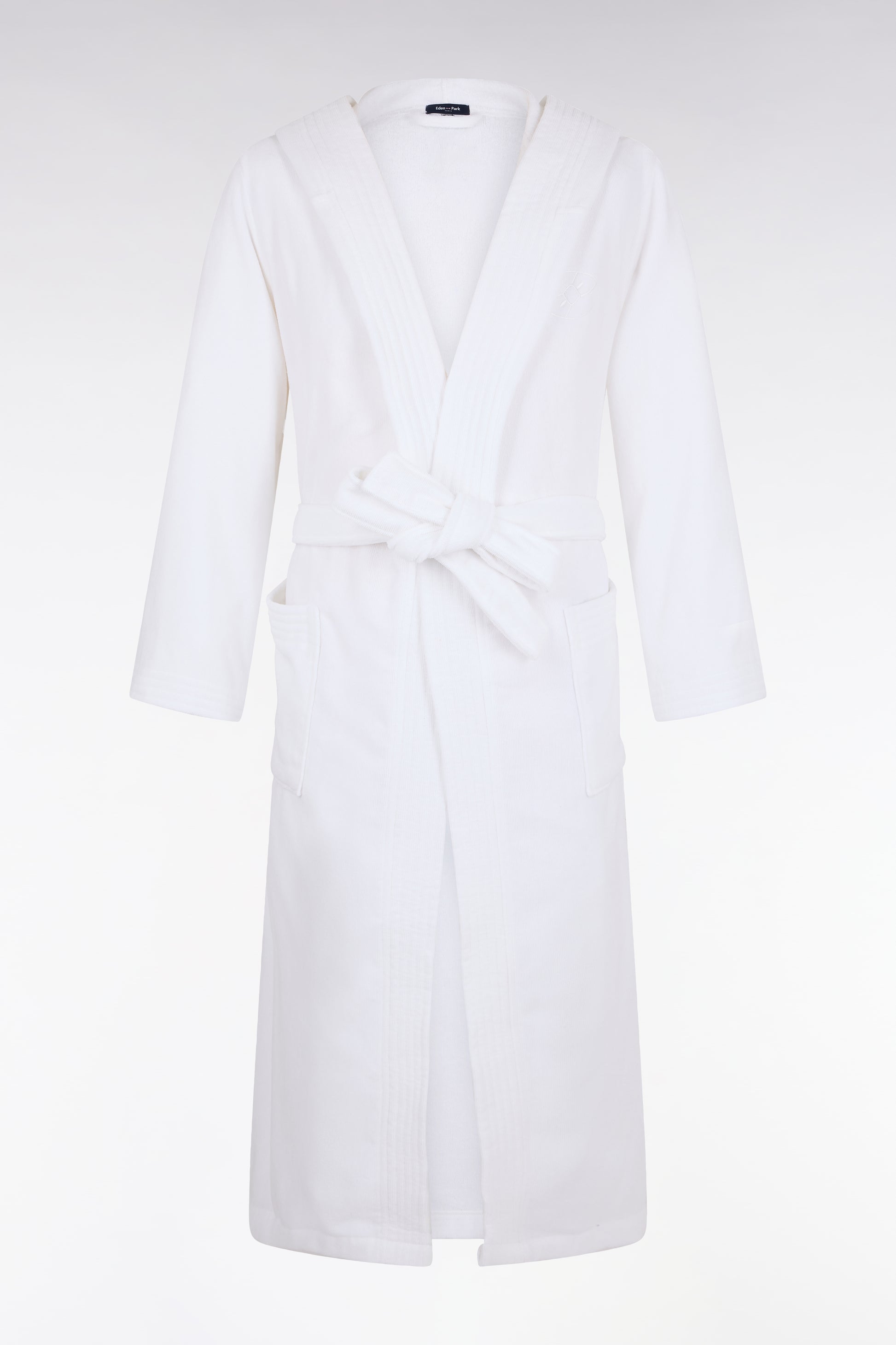 White cotton terry blend hooded bathrobe