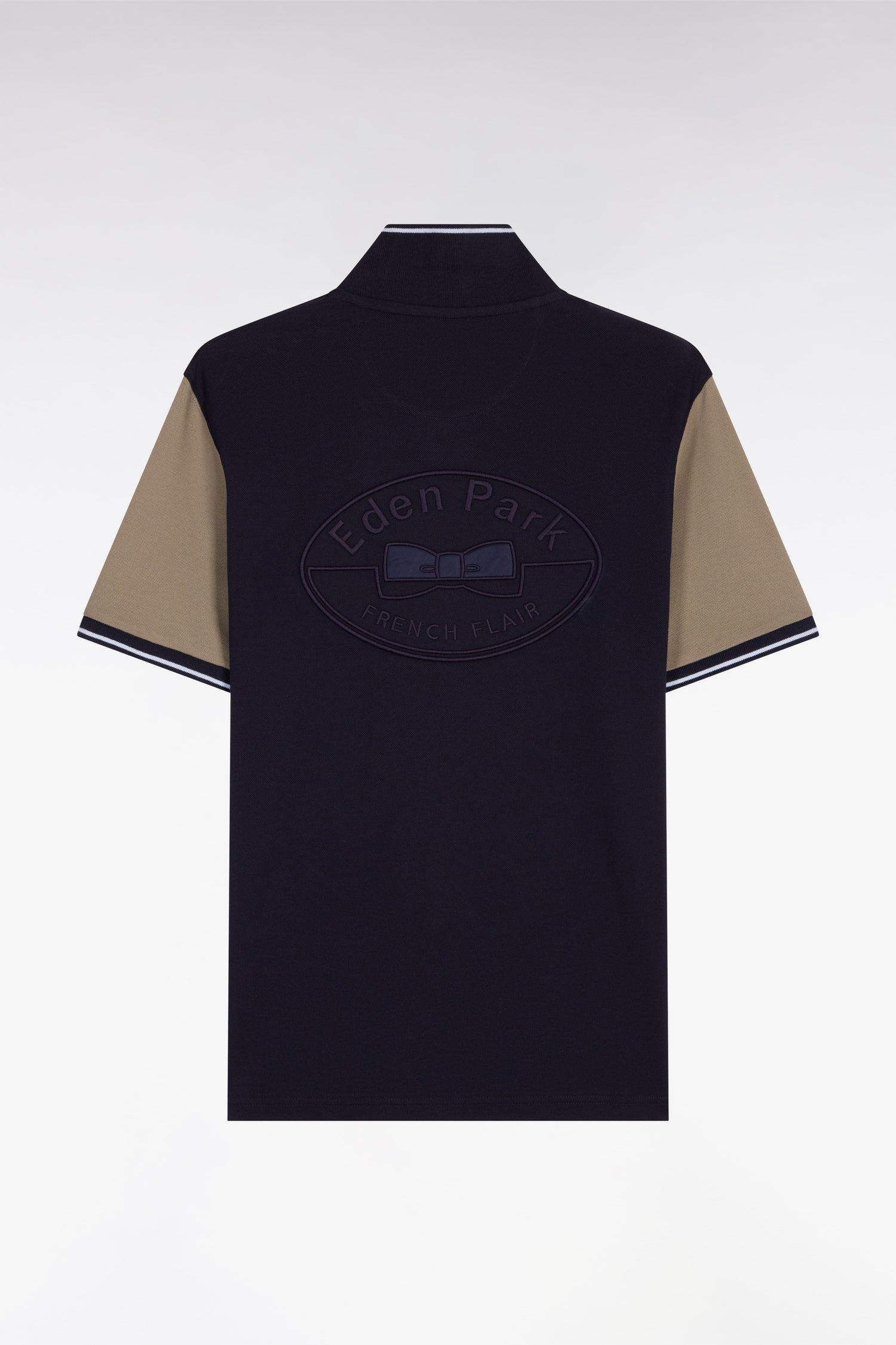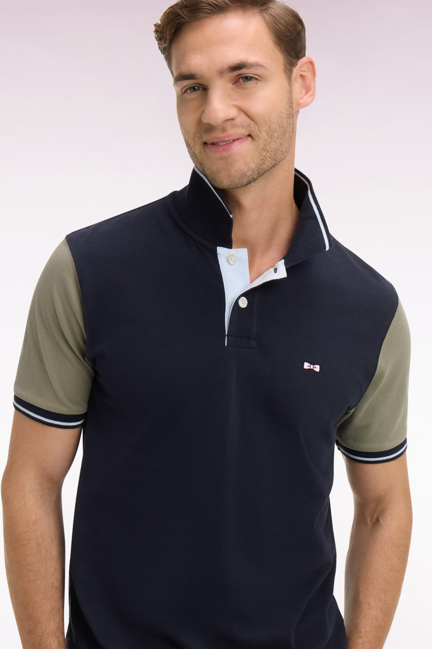 Ce polo marine s’illustre par une maille 100% coton de qualité et ses jeux de contrastes subtils comme ses manches contrastées beige ou kaki. Son liseré contrasté rose ou ciel, selon le coloris choisi, parcourt son col polo, ses bords-côtes manches et se retrouve sur le dessous de sa plaquette de boutonnage contrastée. Une pièce polyvalente destinée à accompagner un vestiaire sport chic de saison et proposé en marine et beige ou marine et kaki.