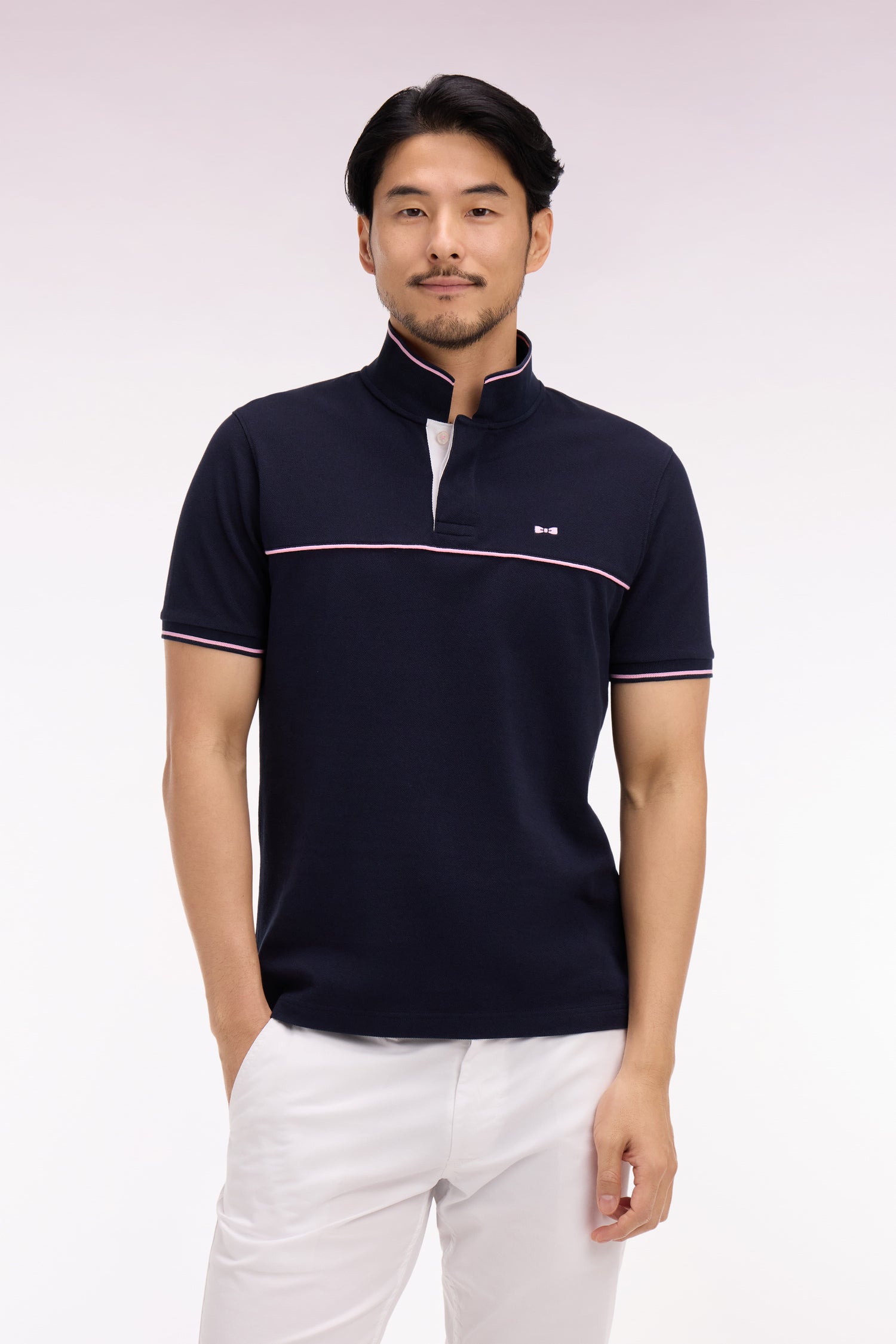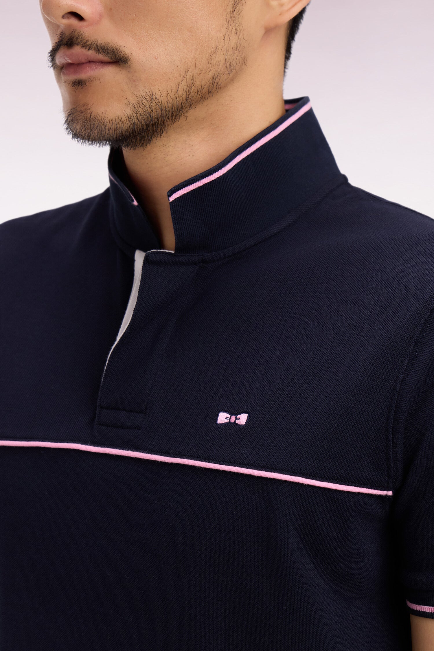Notre polo masculin blanc ou marine se distingue par ses fines rayures roses agrémentant ses bords-côtes manches et col, un détail repris sur le passepoil qui traverse sa poitrine et sur le pourtour de ses fentes d'aisance. Ces finitions en font un modèle emblématique, reflétant l'esprit rugby chic de notre Maison.