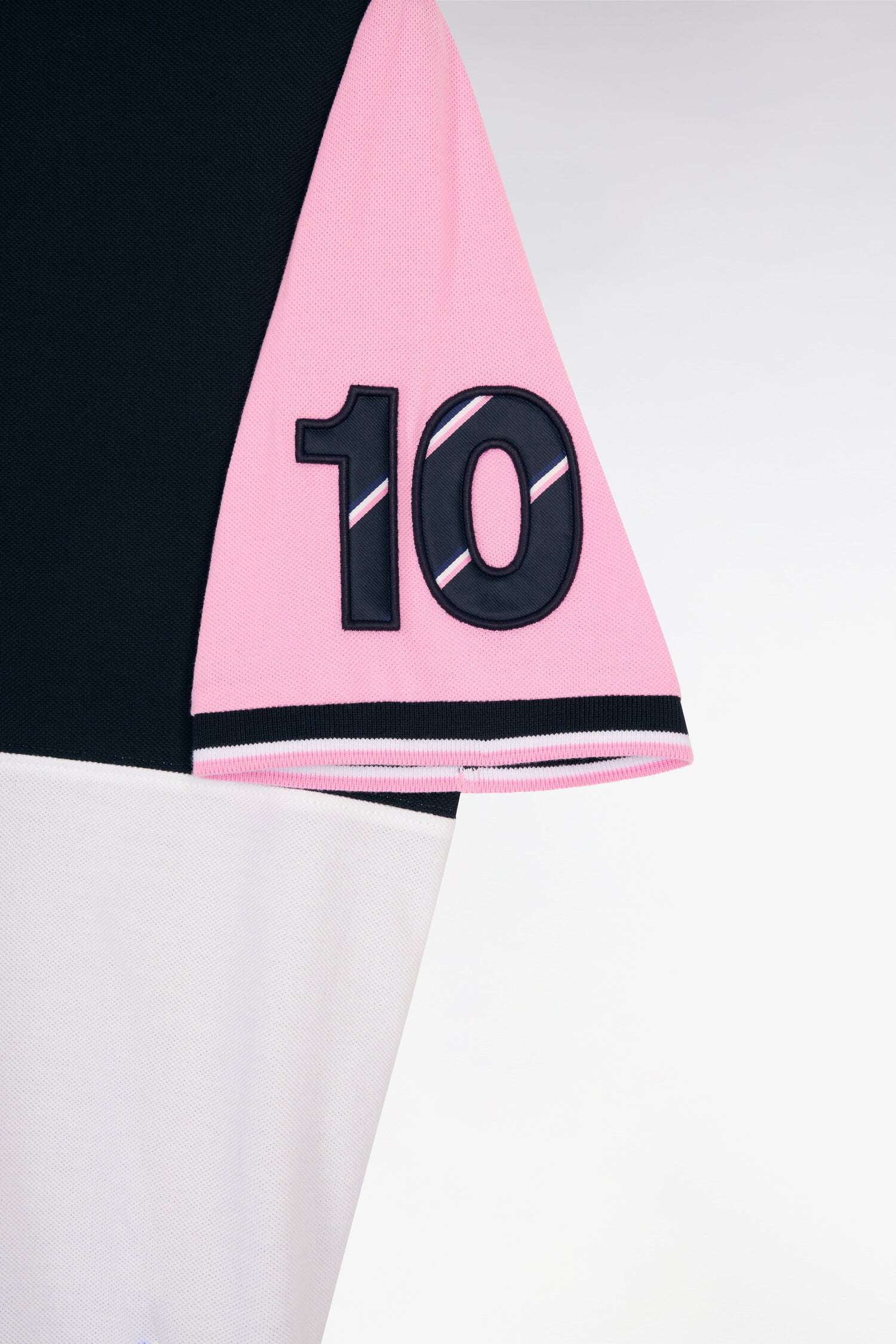 Inspired by historic rugby jerseys, this cotton piqué polo shirt adopts a dial construction with contrasting colored blocks, punctuated by a 10 embroidery on the sleeve enhanced with tie fabric. Its distinctive finishes, striped ribbed collar and cuffs, chest badge, mottled undercollar, reinforce its sporty chic dynamic. The FFR logo embroidered on the back is a strong piece, emblematic of our House's partnership with the French Rugby Federation. A perfect model to support your favorite team from the stands or to roam the city in style!