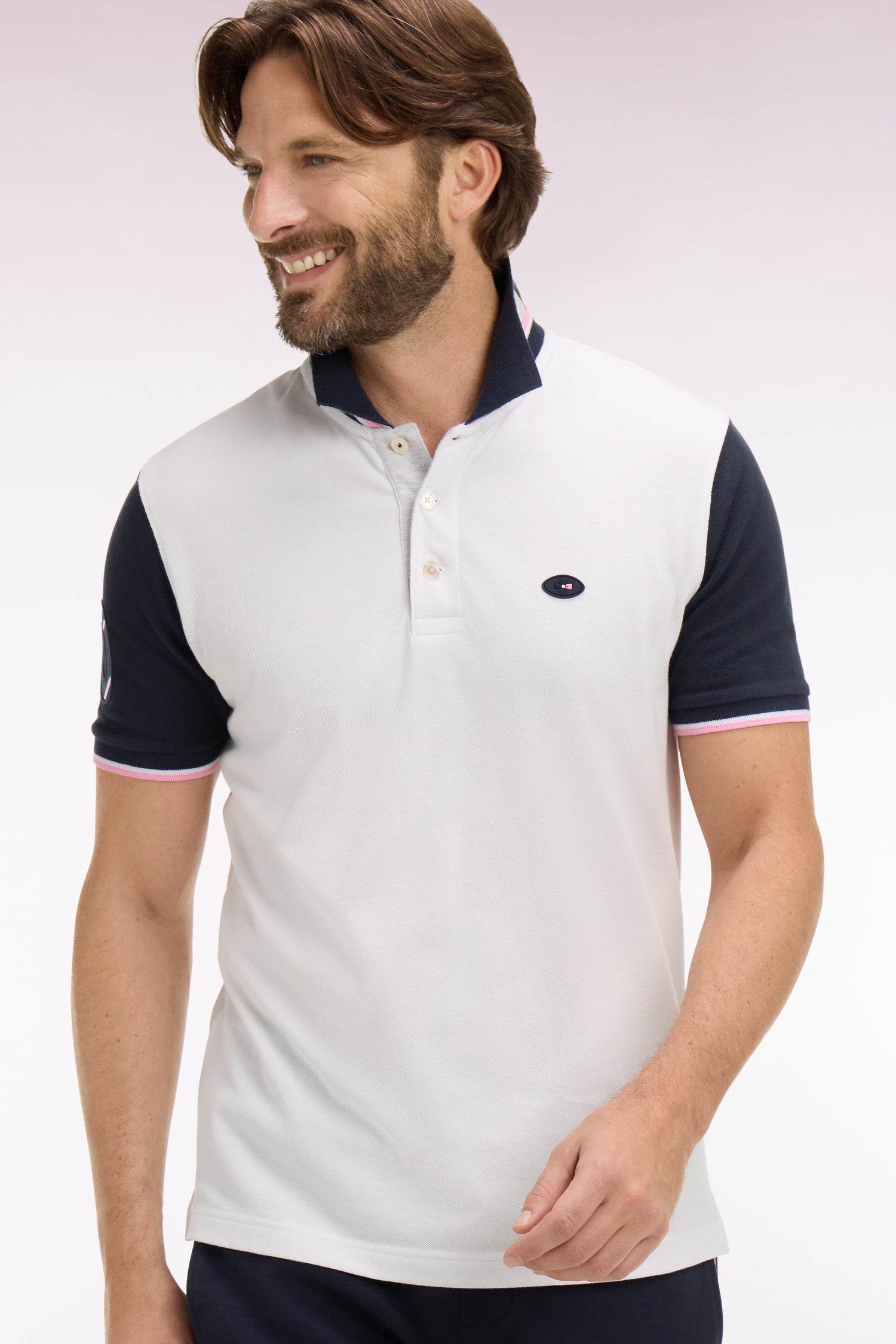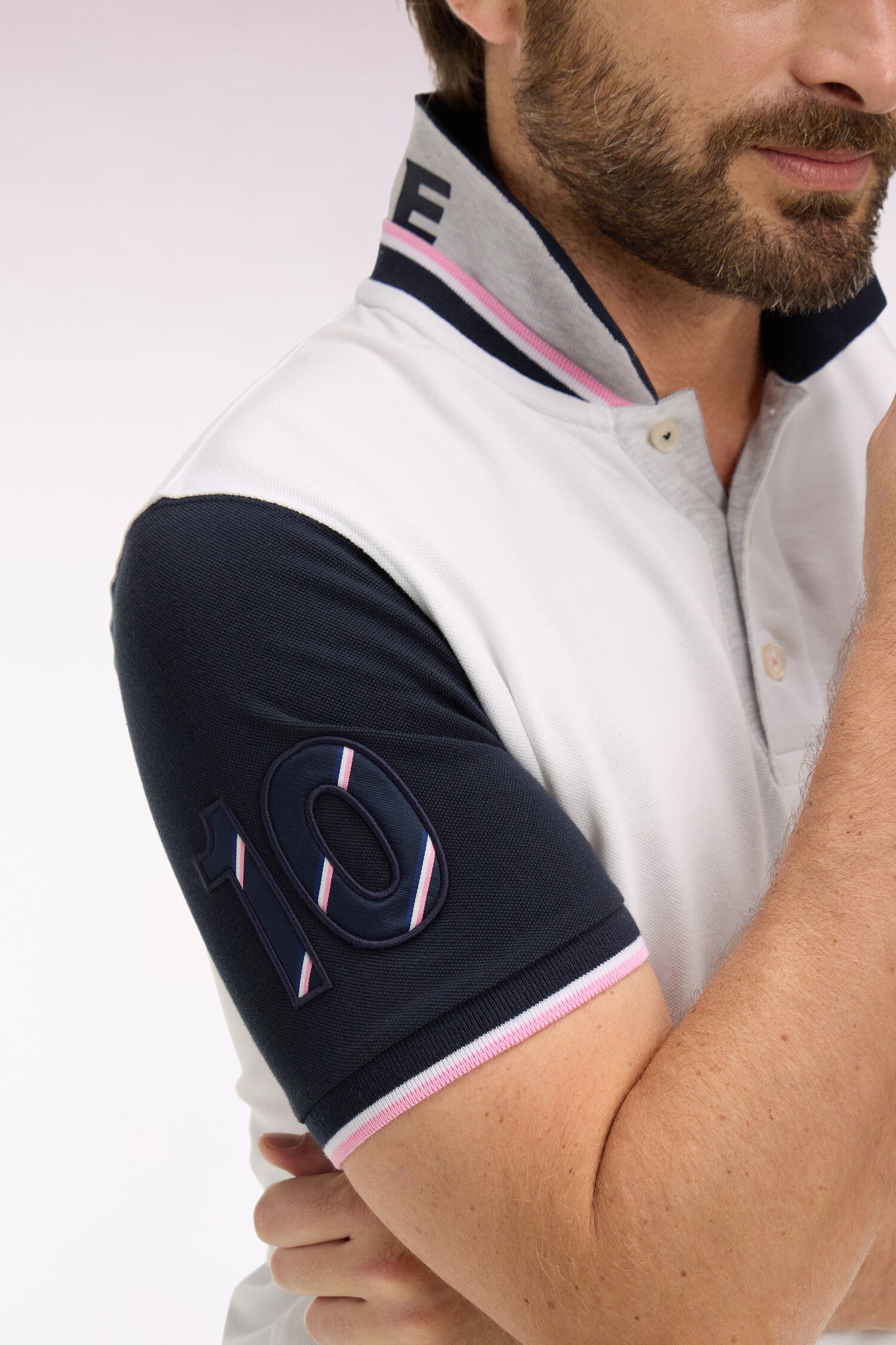 Ce polo en piqué de coton affirme un style résolument rugby grâce à son col sur lequel un tricotage jacquard affirme fièrement son attachement à la France, clin d’œil direct au XV de France. Ses manches contrastées, agrémentées d'une broderie rehaussée de notre iconique tissus cravate, et son écusson officiel FFR en font une pièce forte, pensée pour accompagner les supporters de cette équipe mythique du stade à la ville. Allure dynamique, détails identitaires et esprit sport chic se conjuguent dans ce trio de polos à manches courtes emblématiques de nos collections de mode. À associer avec un jean, un short ou pourquoi pas un chino pour une allure sport-chic.