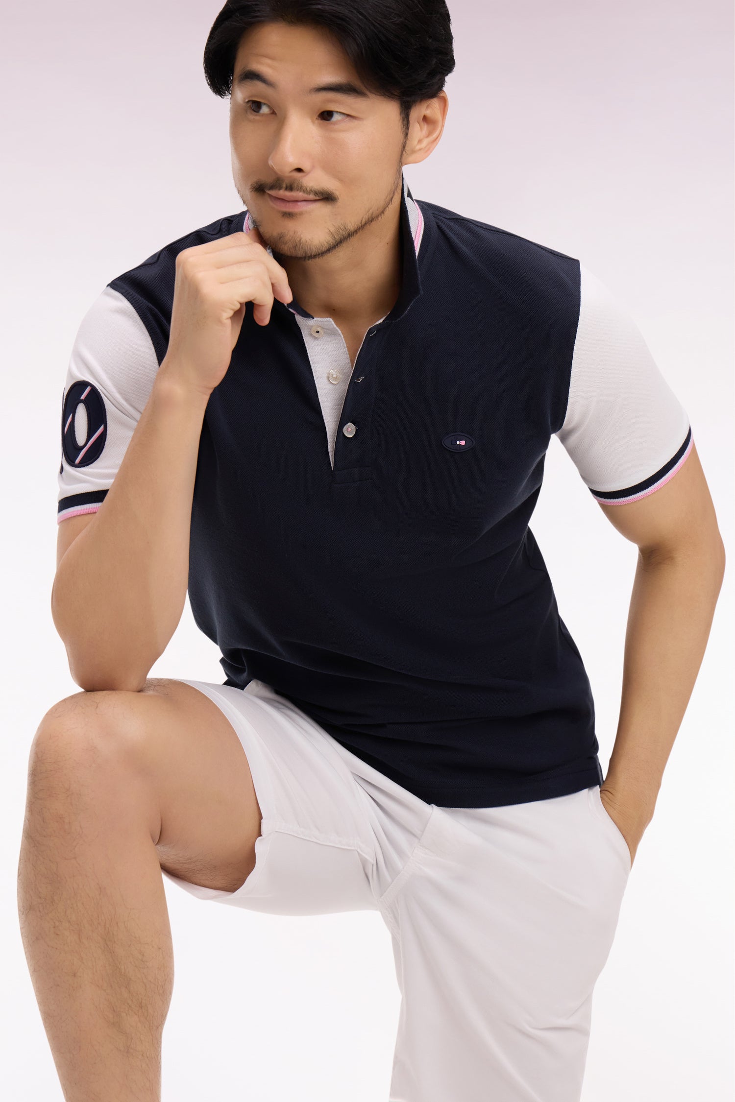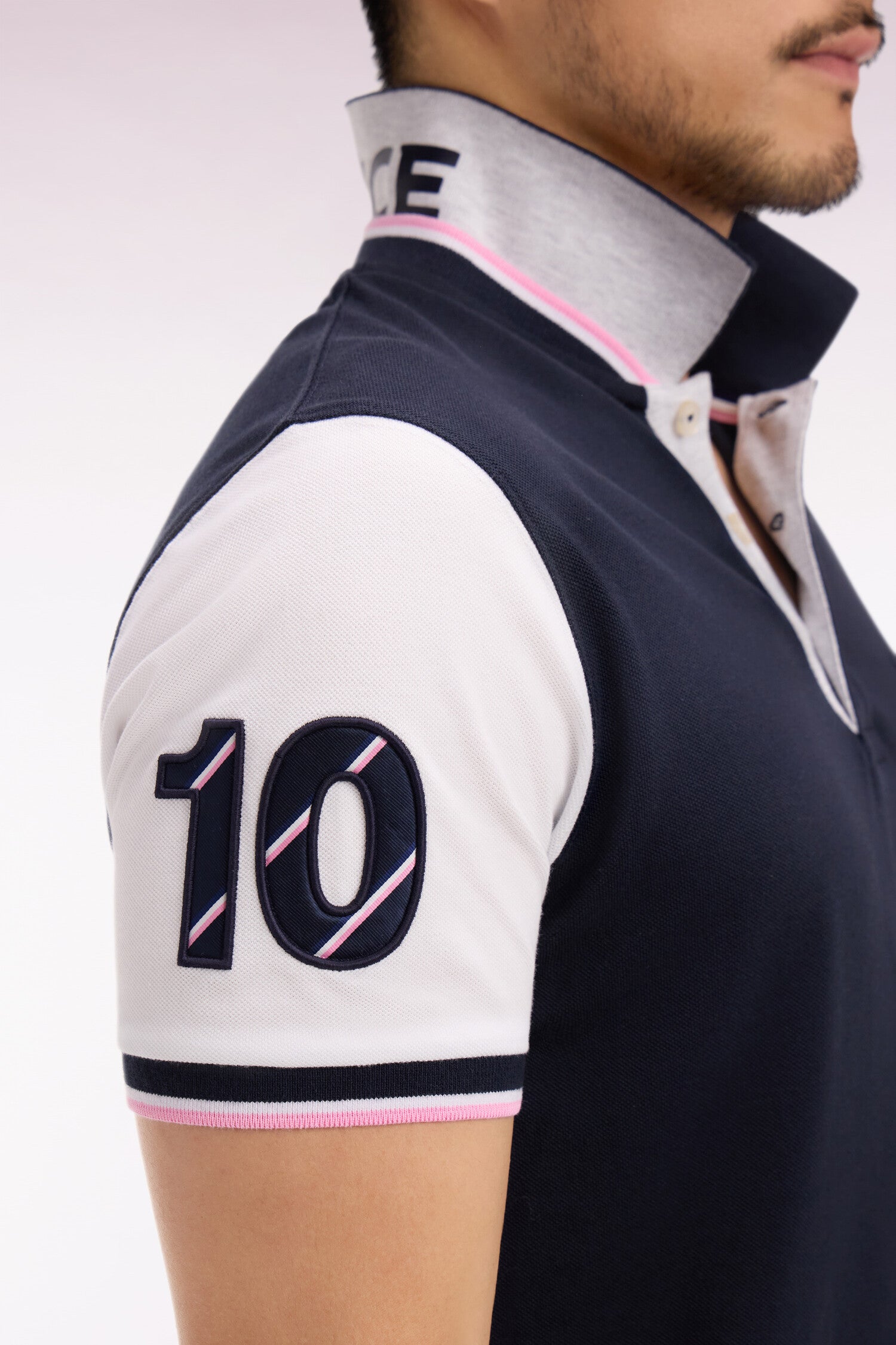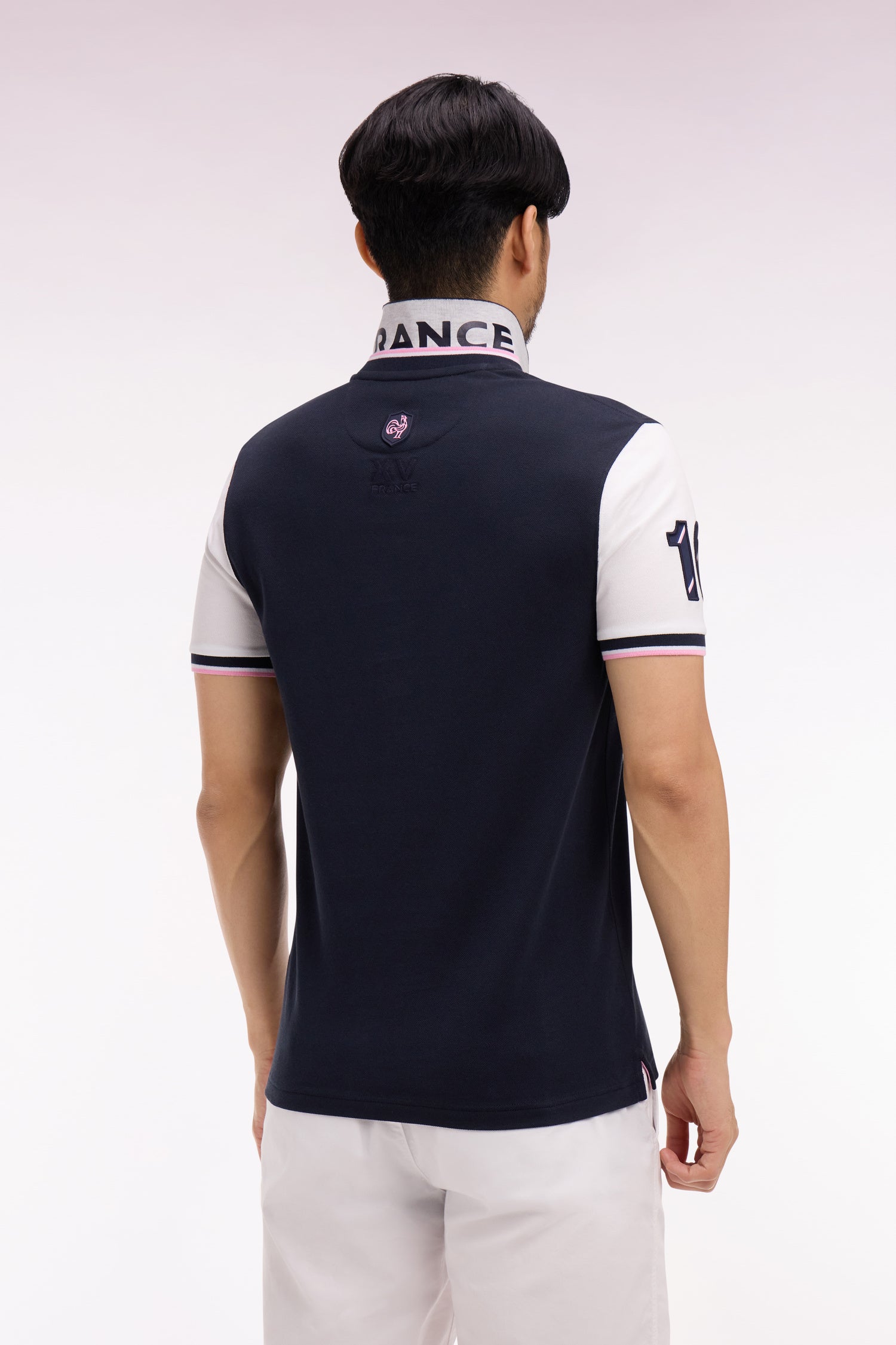 Ce polo en piqué de coton affirme un style résolument rugby grâce à son col sur lequel un tricotage jacquard affirme fièrement son attachement à la France, clin d’œil direct au XV de France. Ses manches contrastées, agrémentées d'une broderie rehaussée de notre iconique tissus cravate, et son écusson officiel FFR en font une pièce forte, pensée pour accompagner les supporters de cette équipe mythique du stade à la ville. Allure dynamique, détails identitaires et esprit sport chic se conjuguent dans ce trio de polos à manches courtes emblématiques de nos collections de mode. À associer avec un jean, un short ou pourquoi pas un chino pour une allure sport-chic.