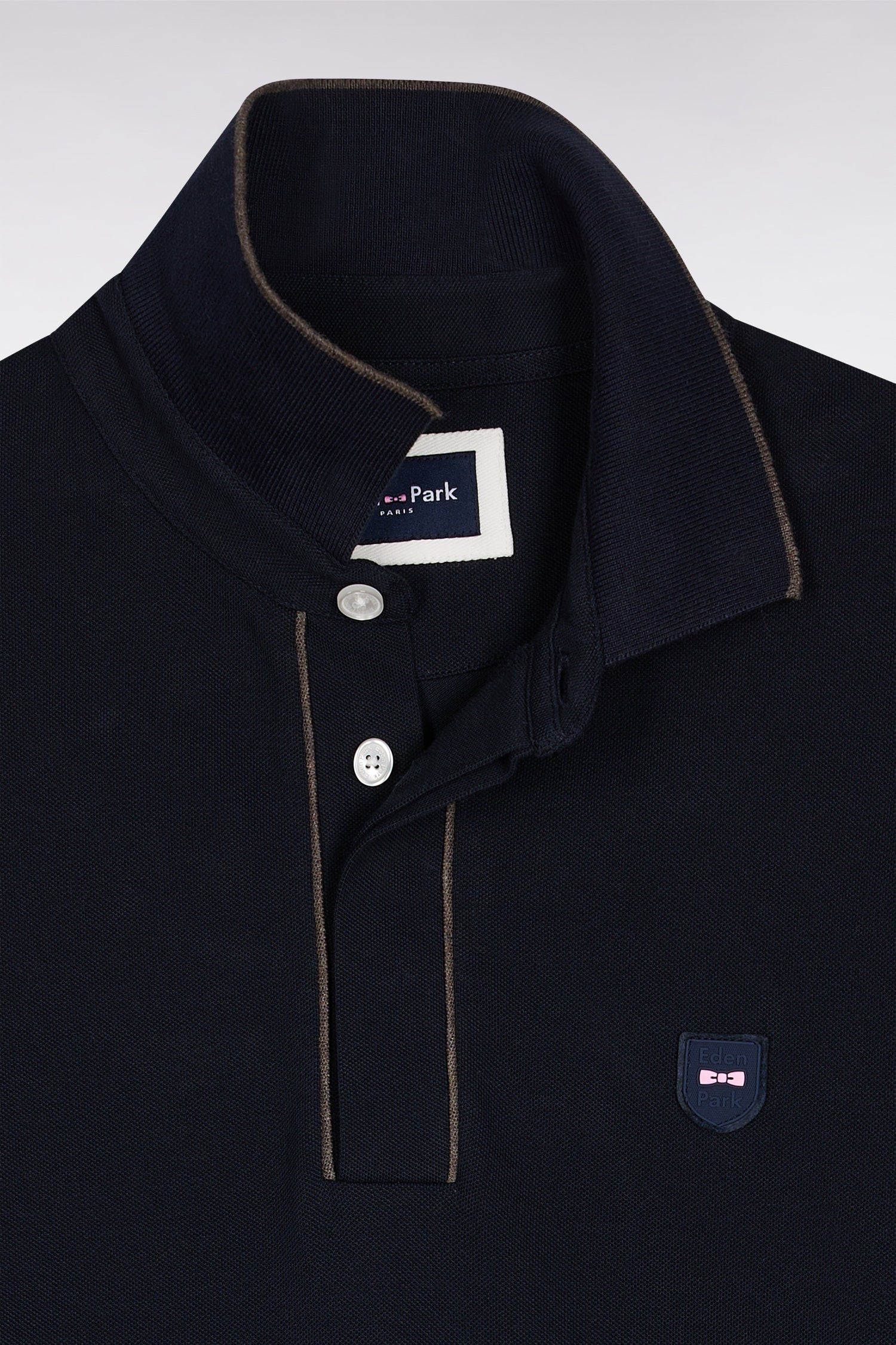 Long-sleeved polo shirt in navy stretch cotton with piping, slim fit