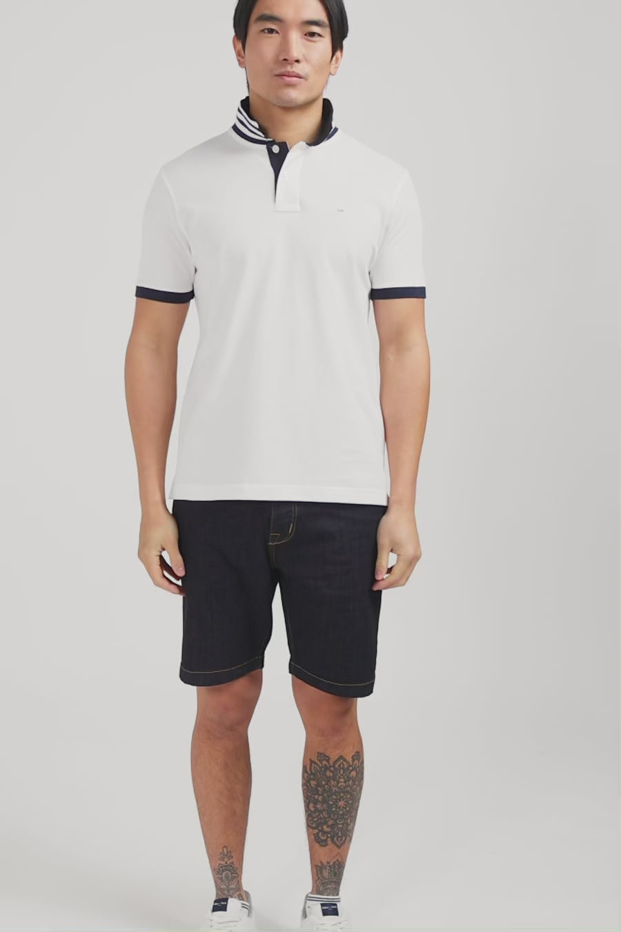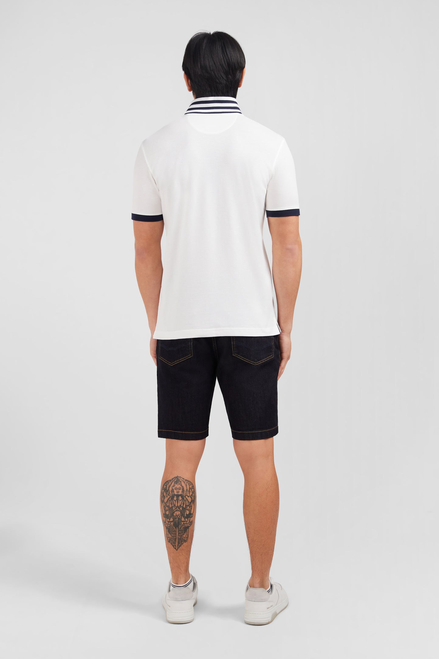 - Contrasting polo collar with striped underside