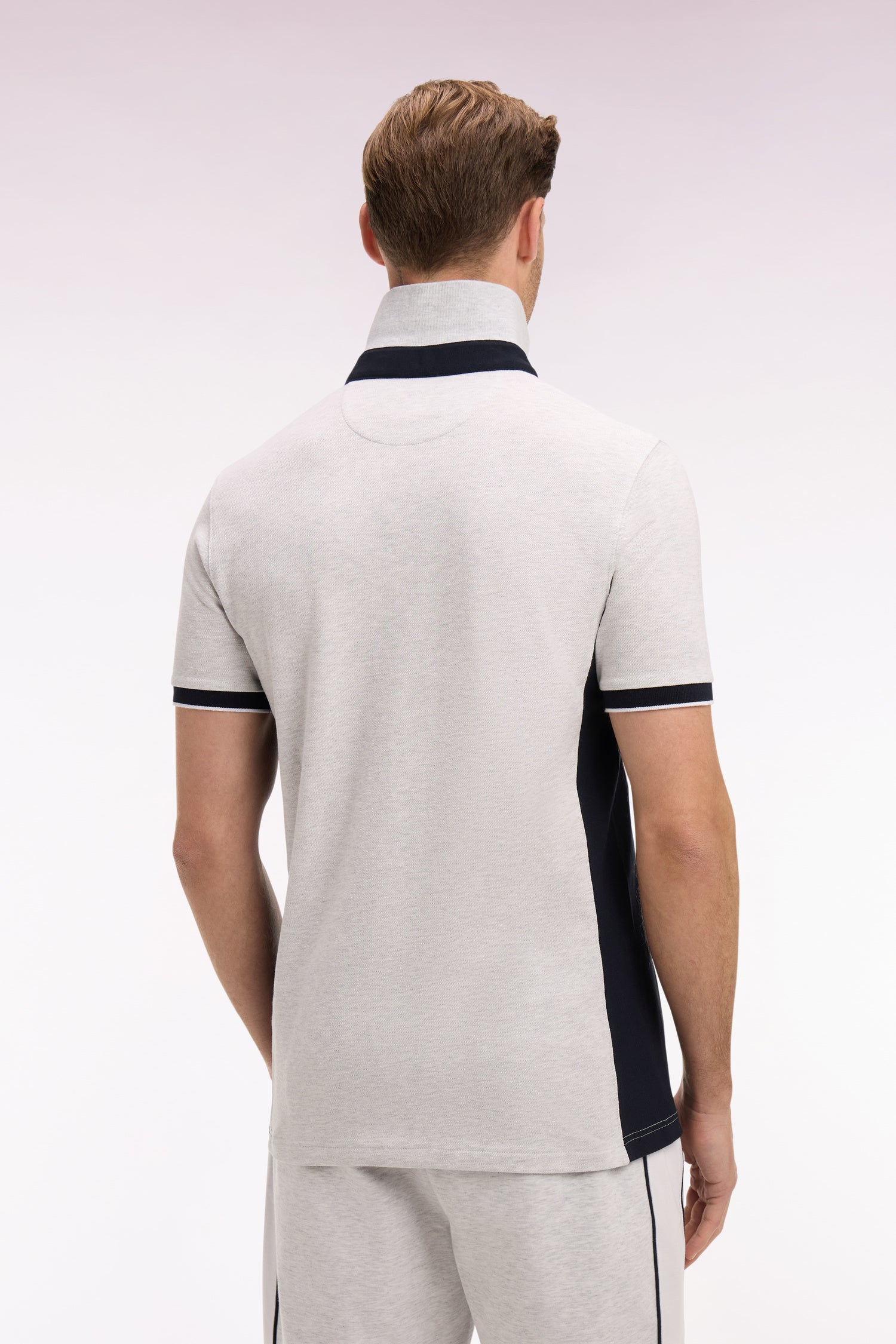 Polo manches courtes en coton gris clair et découpes marine coupe slim