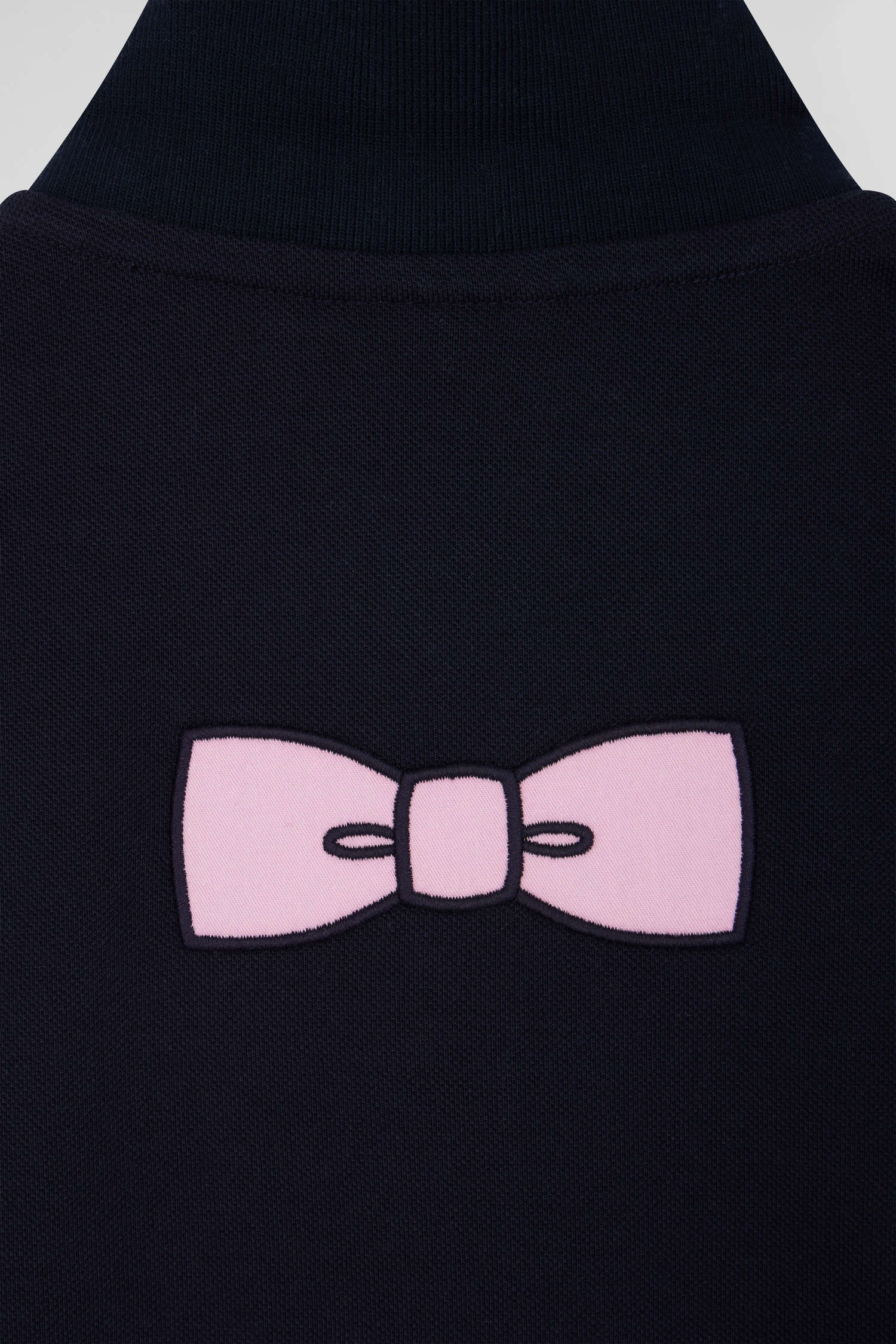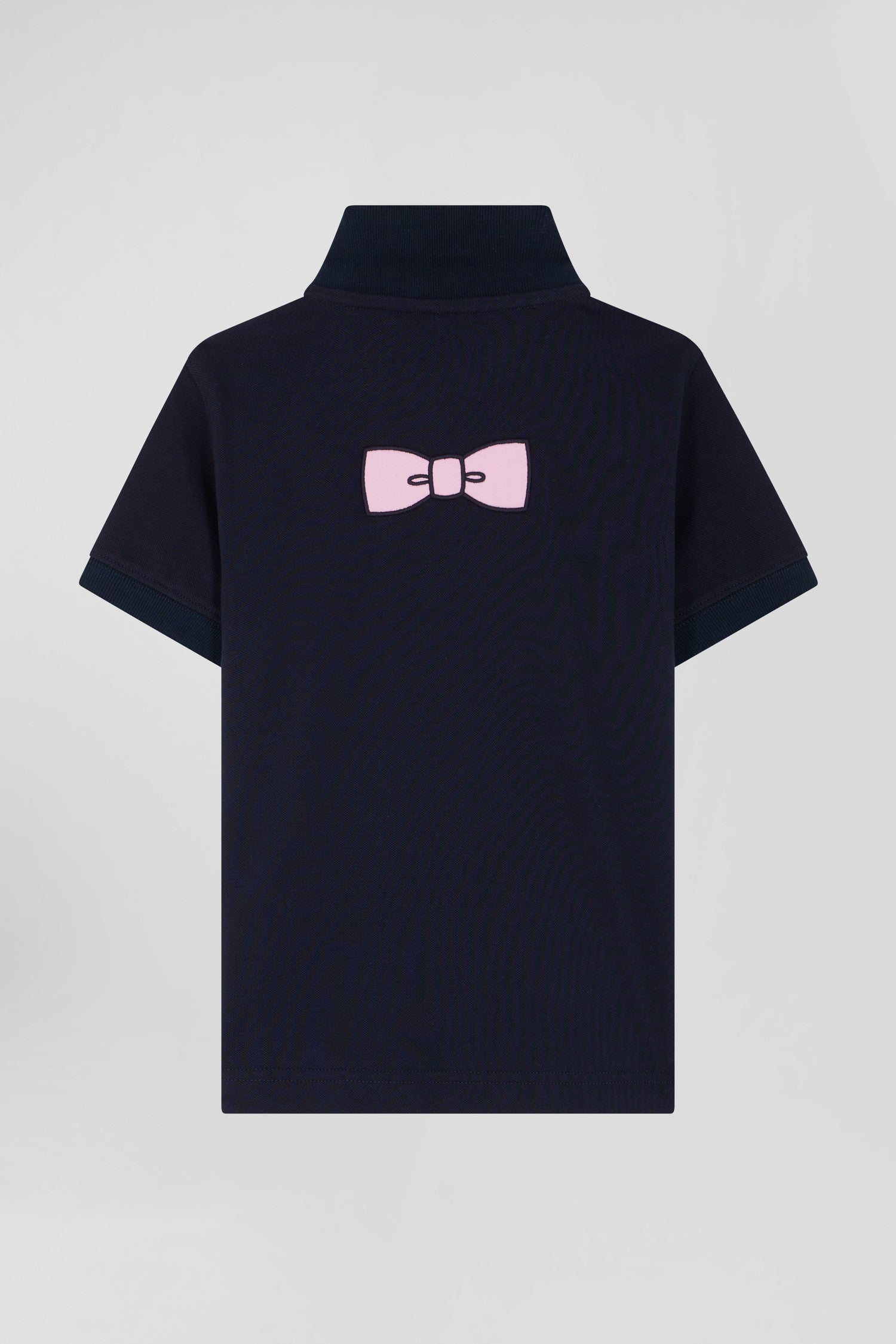 Regular navy blue short-sleeved cotton piqué polo shirt with back bow tie embroidery