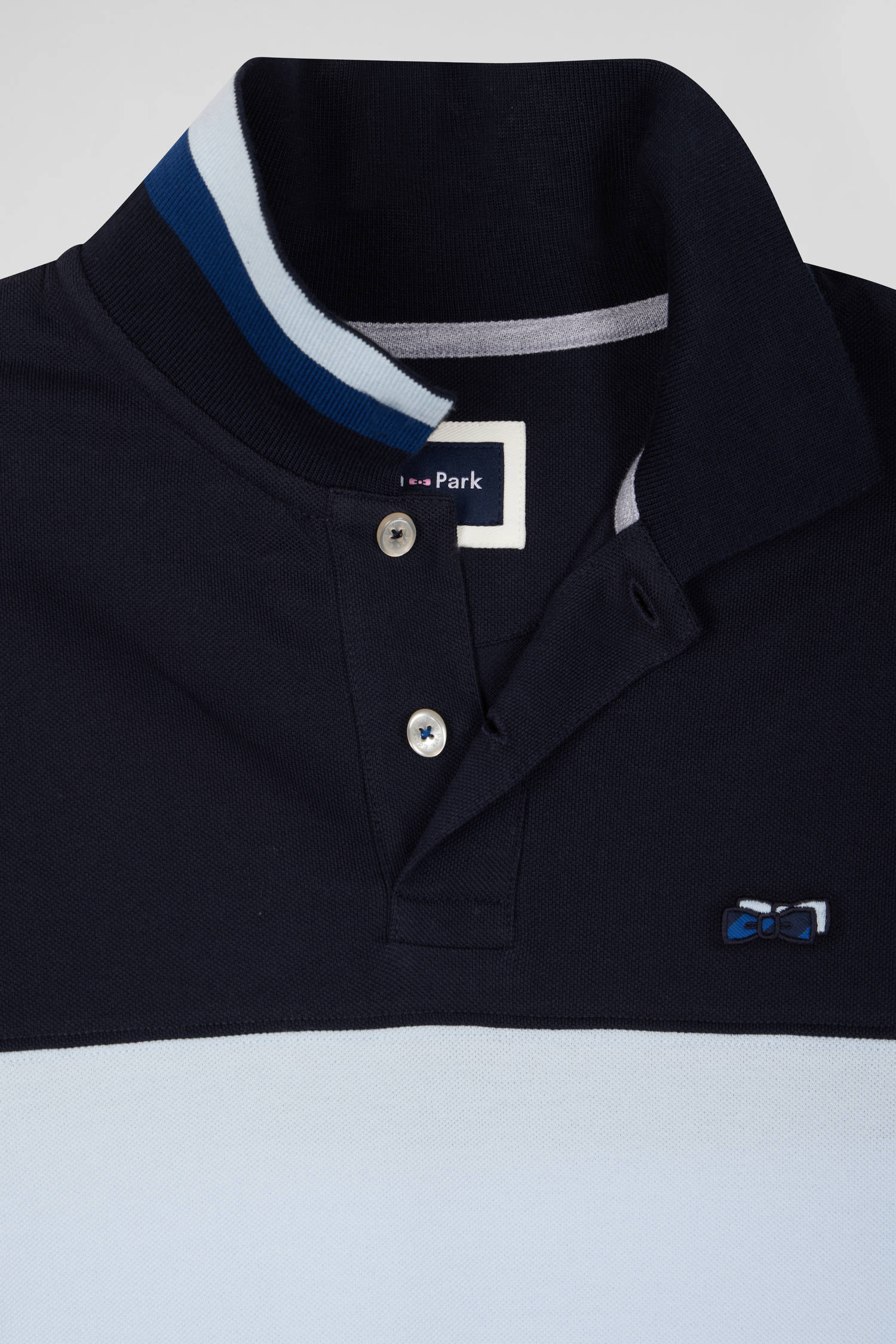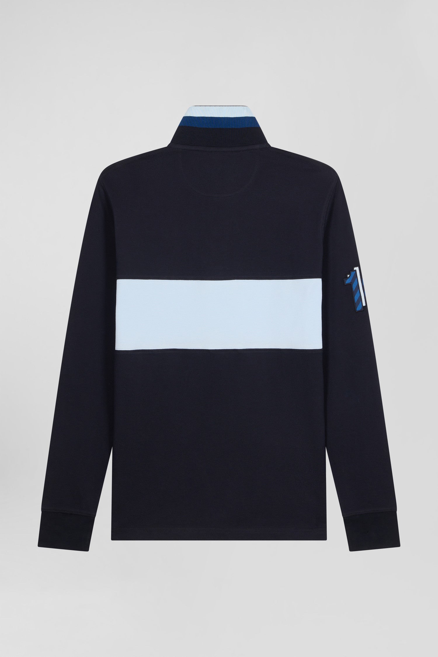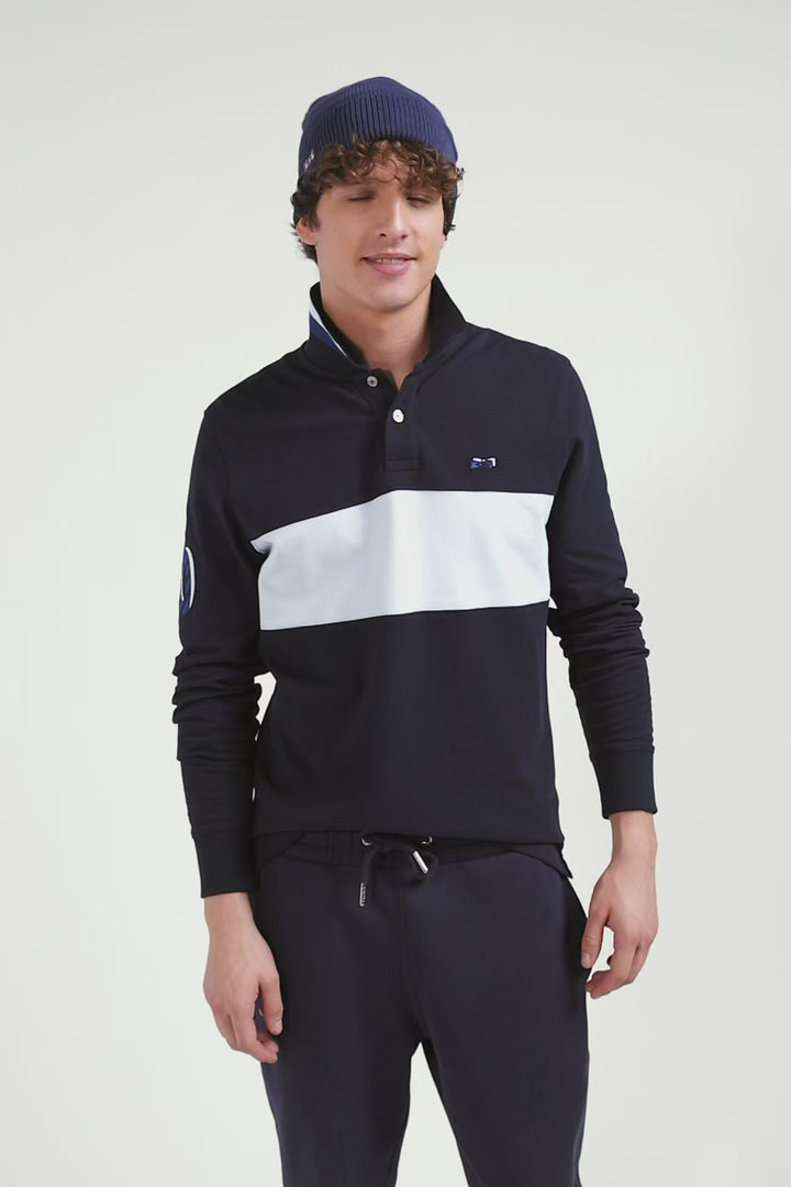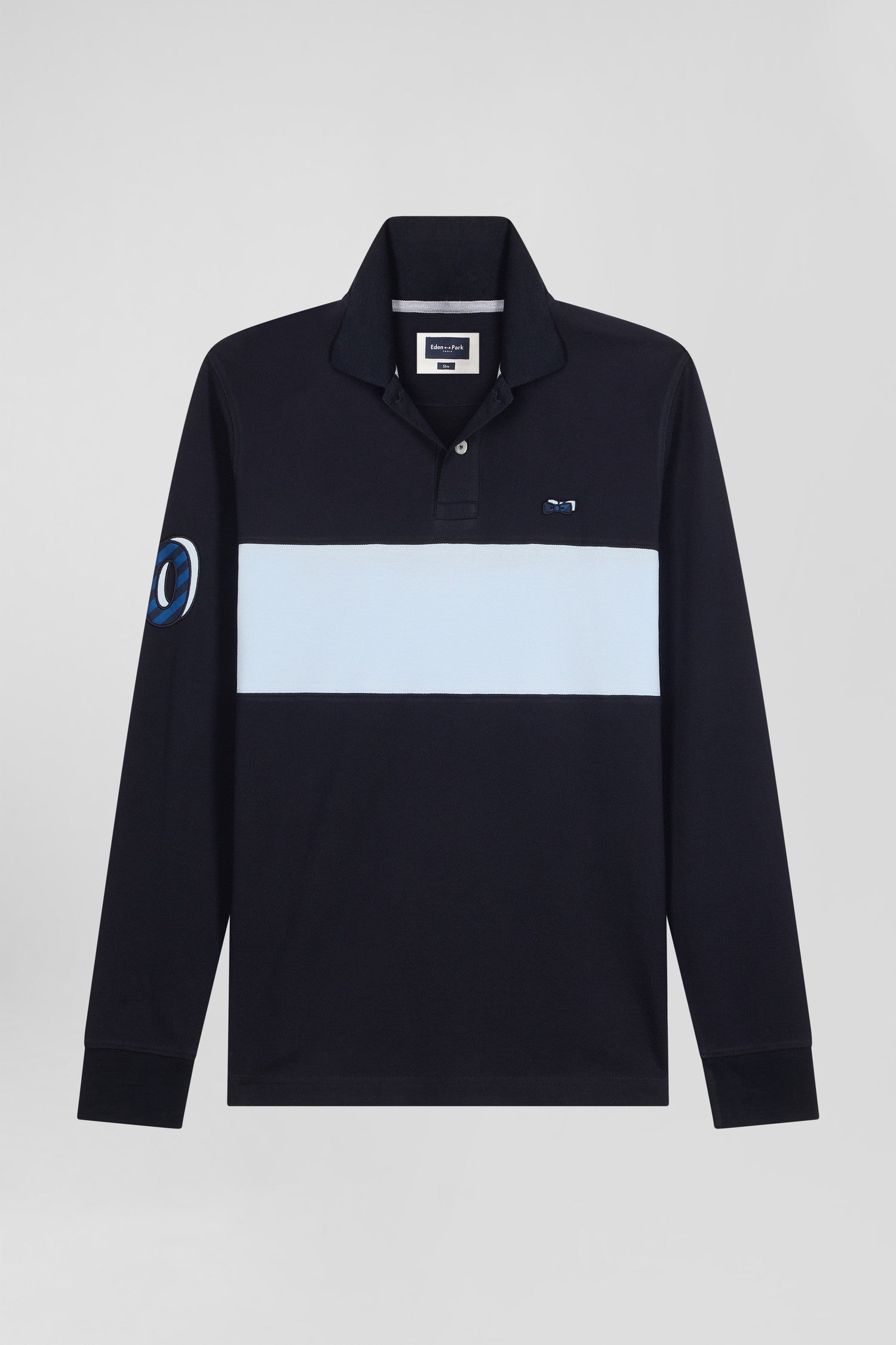 Add a sophisticated touch to your casual wardrobe with this men's long-sleeved polo shirt. Its embroidered finish with fabric tie application on the sleeve lends it a certain elegance. The number 10 shirt is no coincidence: it's the jersey worn by rugby player and Eden Park founder Franck Mesnel. The rugby-inspired oval buttons, bearing the name of our House, add to the meticulous details of this men's polo shirt, such as the knitted collar with tricolored stripes.