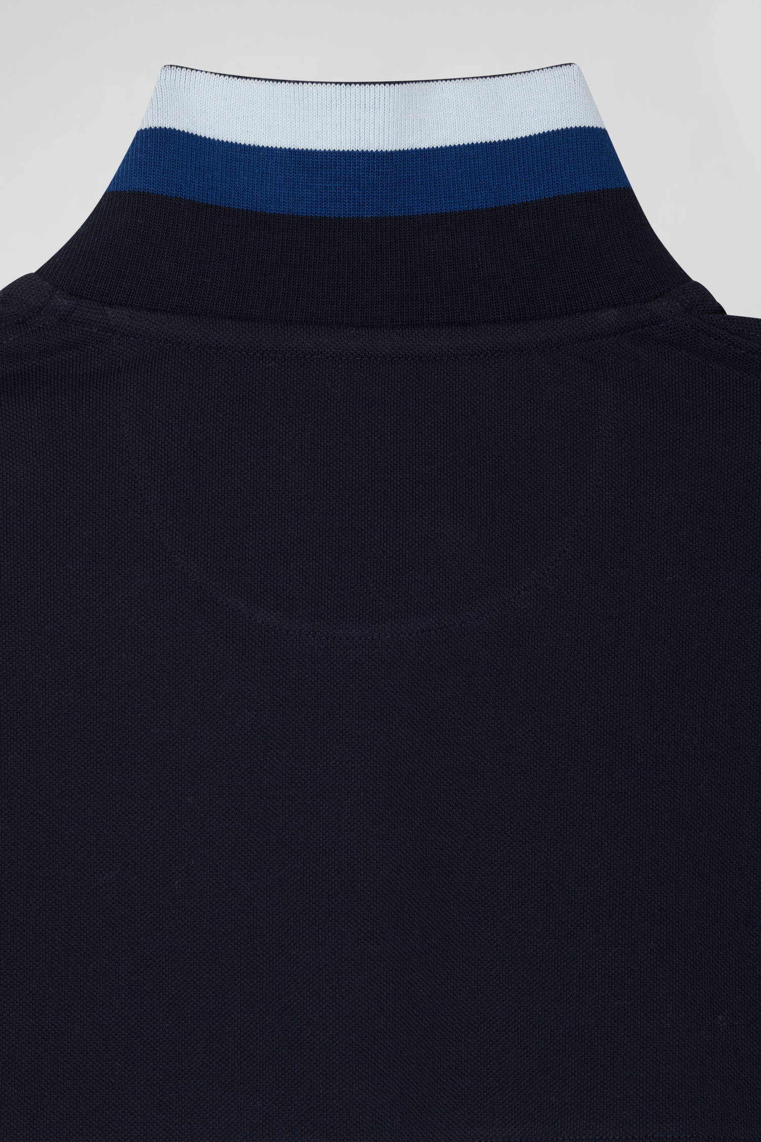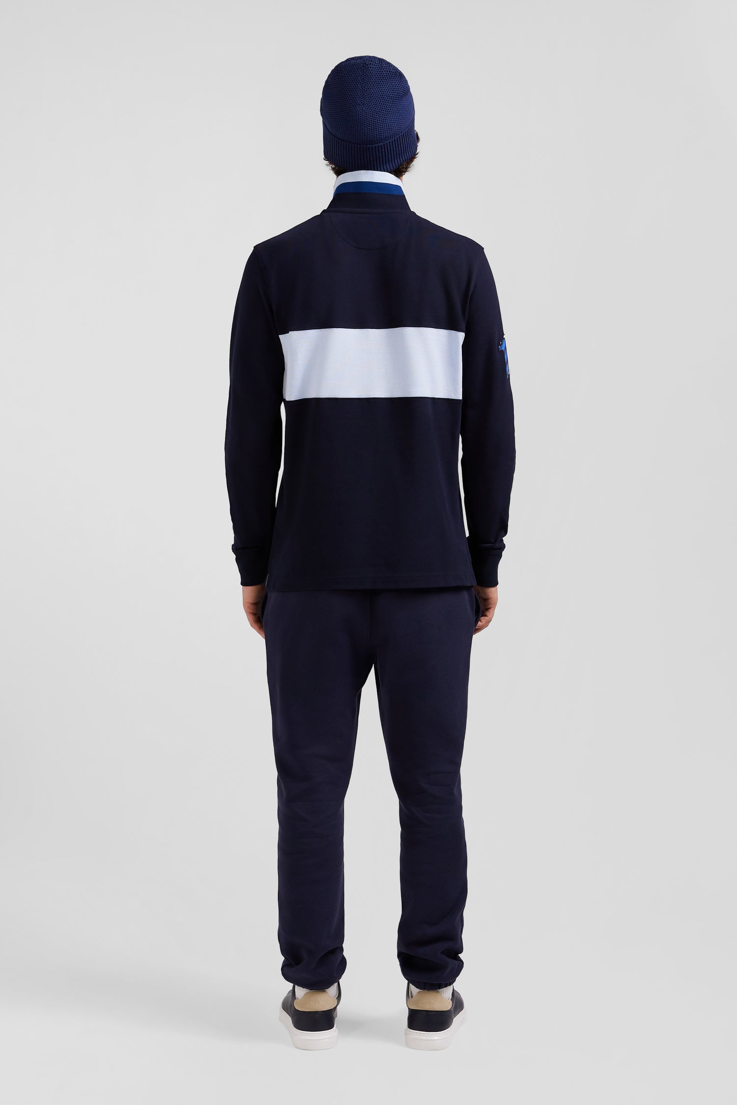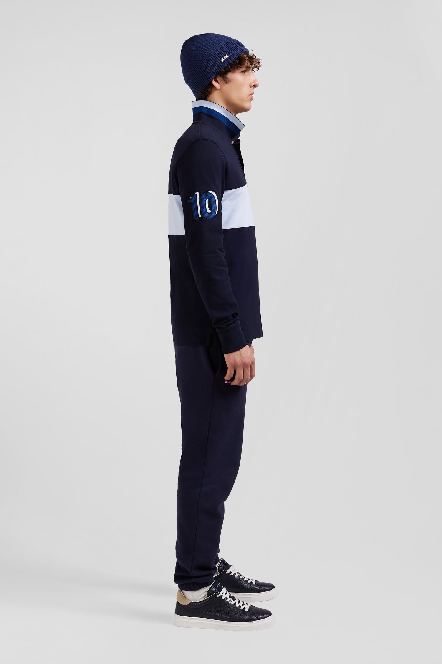 Add a sophisticated touch to your casual wardrobe with this men's long-sleeved polo shirt. Its embroidered finish with fabric tie application on the sleeve lends it a certain elegance. The number 10 shirt is no coincidence: it's the jersey worn by rugby player and Eden Park founder Franck Mesnel. The rugby-inspired oval buttons, bearing the name of our House, add to the meticulous details of this men's polo shirt, such as the knitted collar with tricolored stripes.
