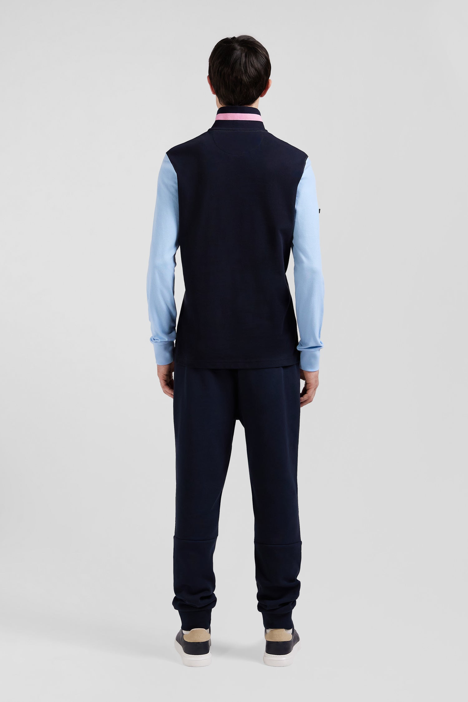 Discover French refinement with this Eden Park long-sleeved polo shirt. Made from high-quality cotton piqué, it combines softness and durability. Eden Park's bold creativity is evident in the colorful cut-outs, quilted EDEN PARK embroidery and distinctive sleeve embroidery with nylon appliqué for a sporty touch. The hooped collar and knitted neckband add a subtle elegance to this colorblock polo.