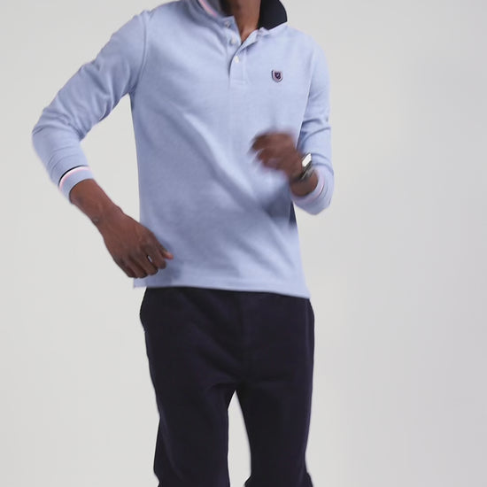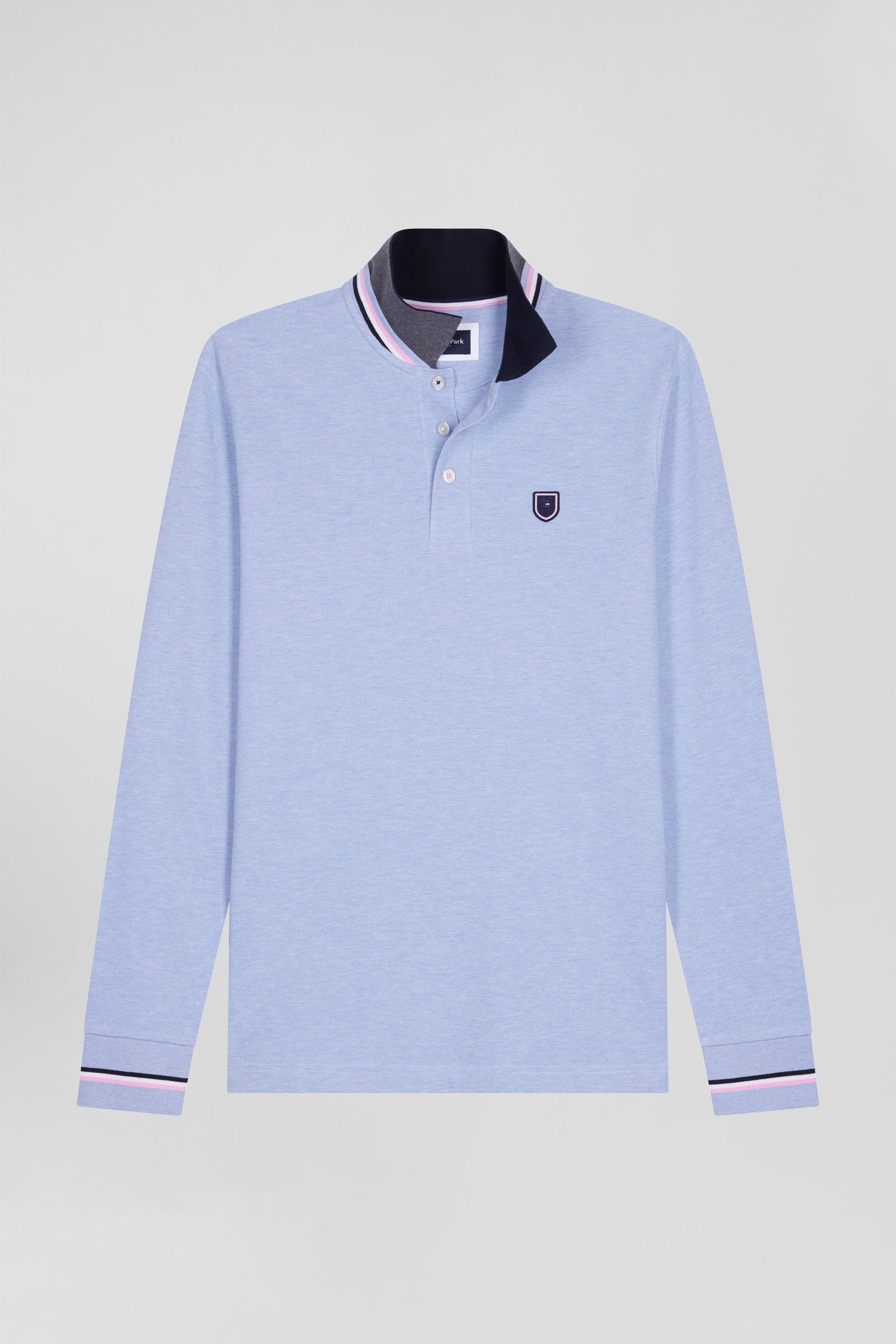 Regular sky blue long-sleeved cotton piqué polo shirt with rubber badge