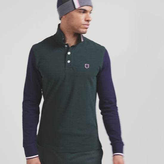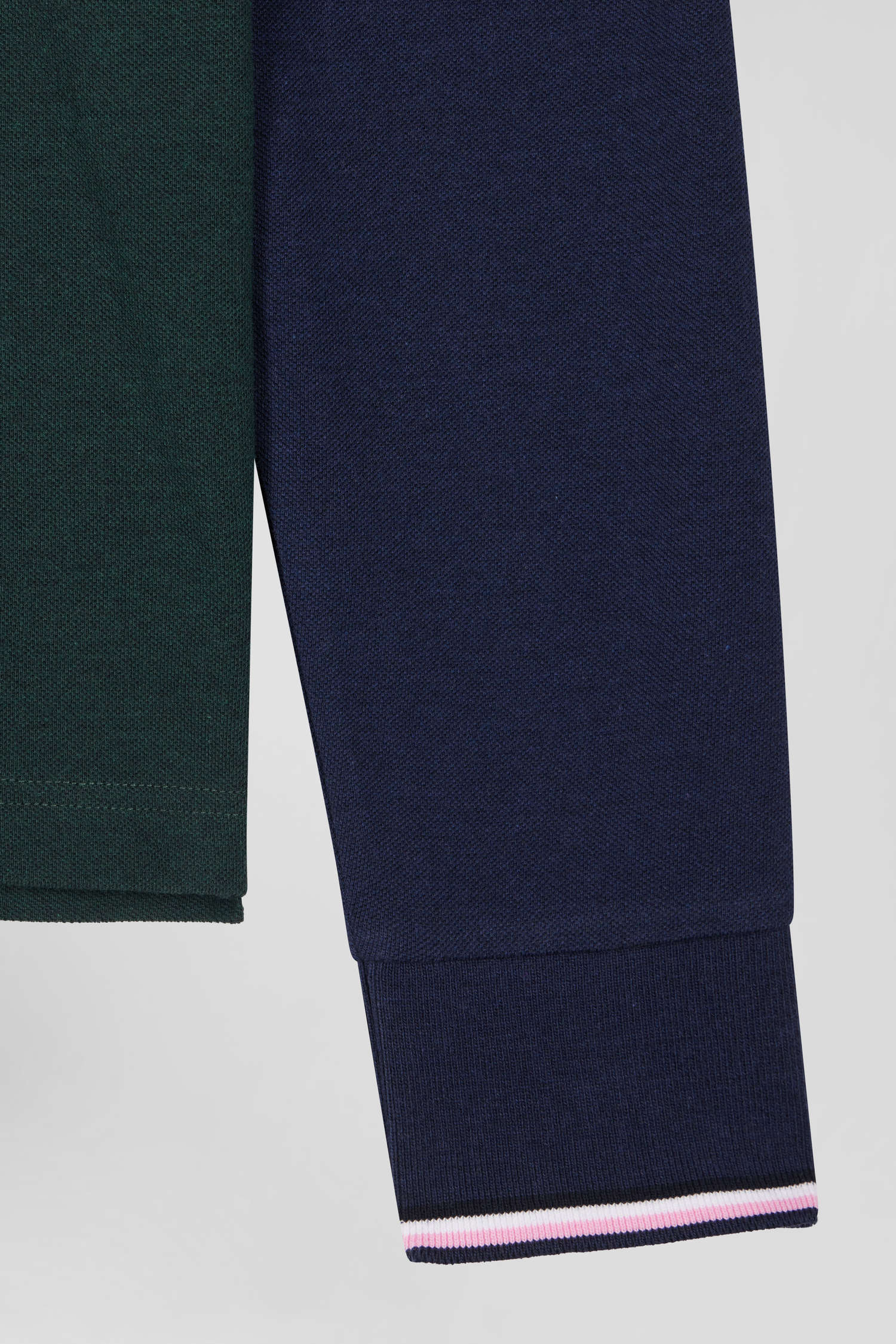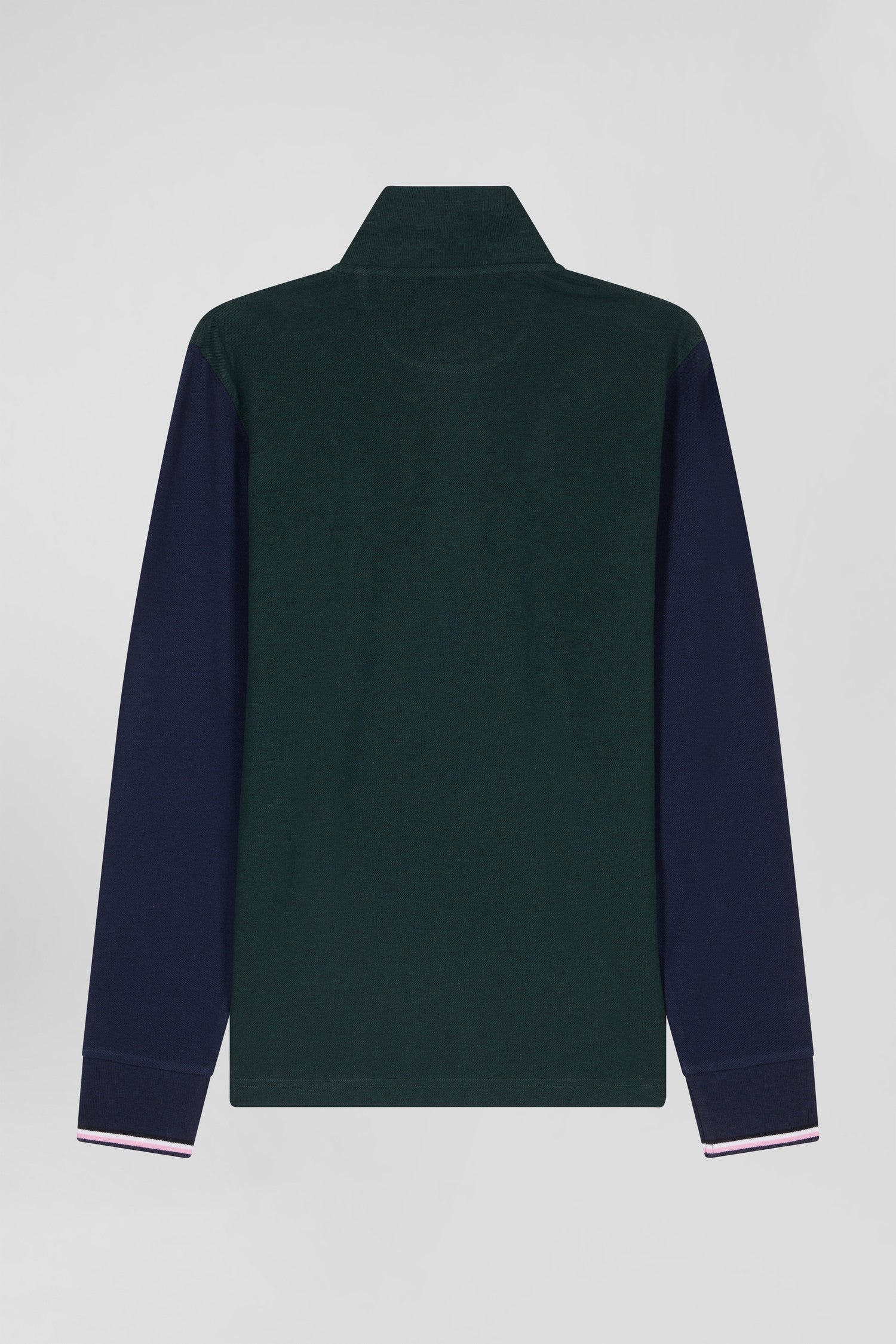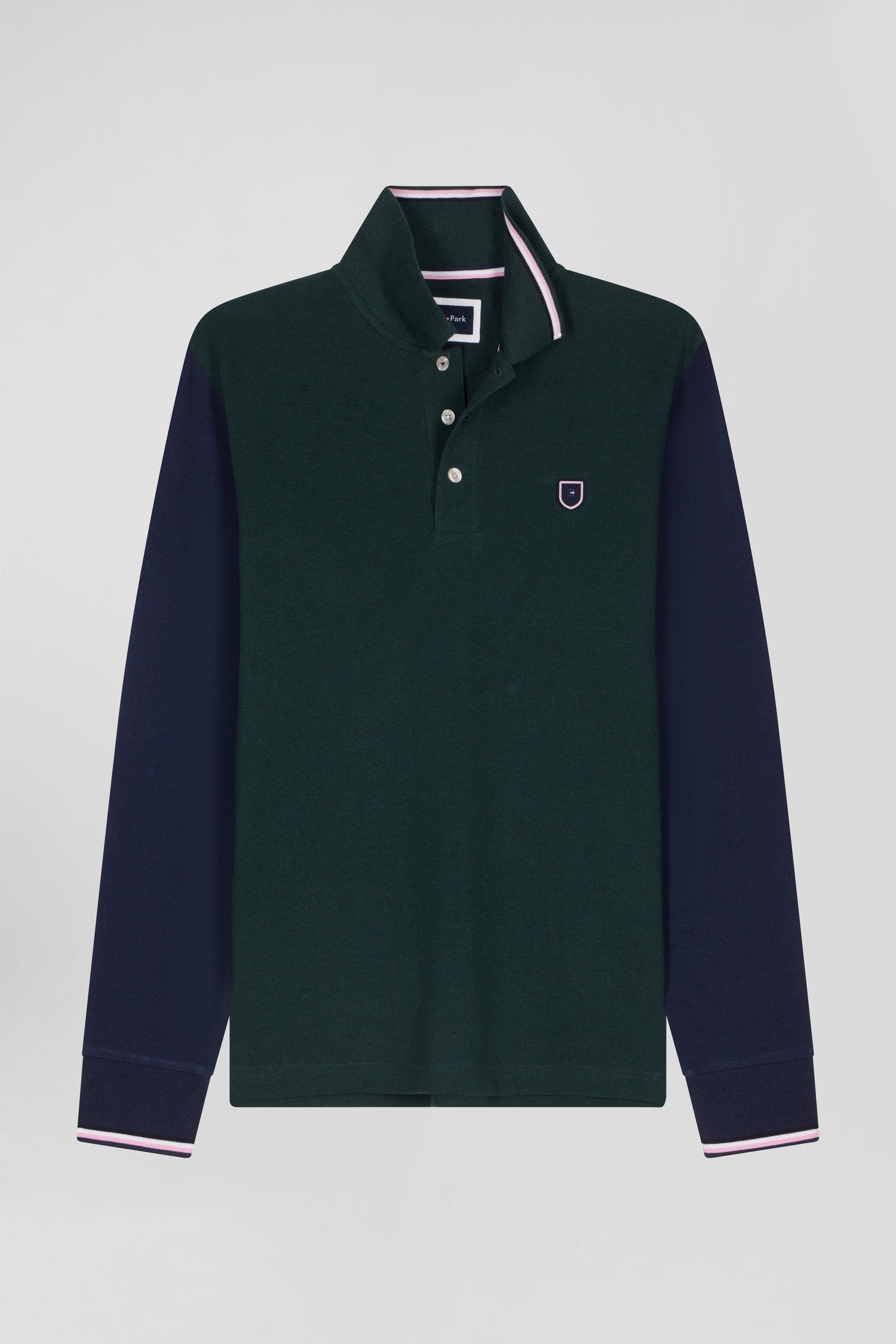 Regular green long-sleeved cotton piqué polo shirt with jacquard collar and rubber badge