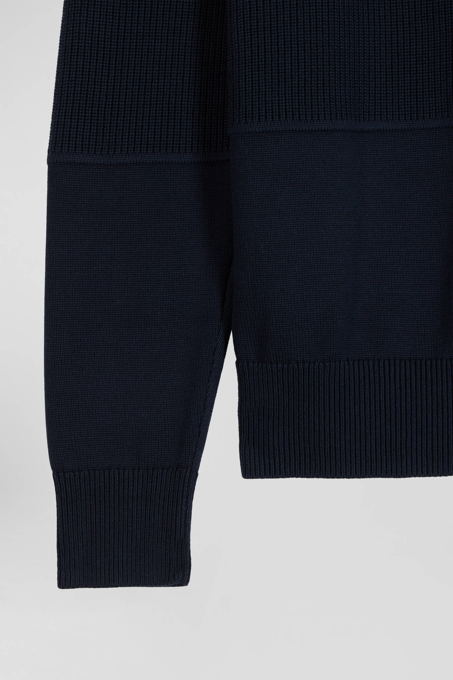 Elegance and originality merge in this zipped sweater with trucker collar. Its contrasting interior stripes and jersey half-moon are enhanced by a tricolored knitted ribbon, for a discreet touch of sophistication. The play of pearled ribbing alternating with jersey creates a striking trompe-l'oeil effect, evoking a contemporary cut-and-sew style paying homage to rugby jerseys and their distinctive tailoring. This revisited masculine essential is perfect for a refined yet casual look.