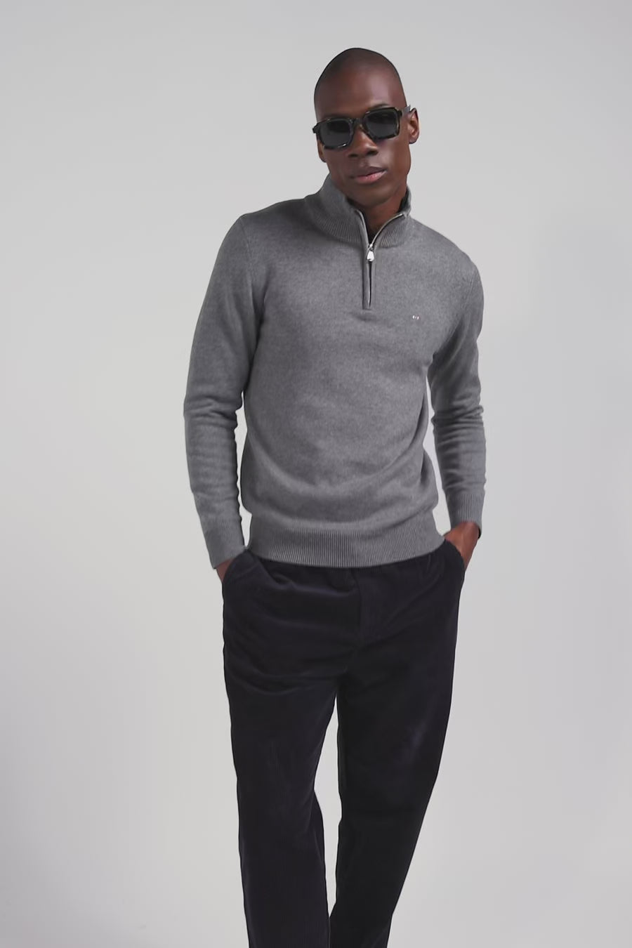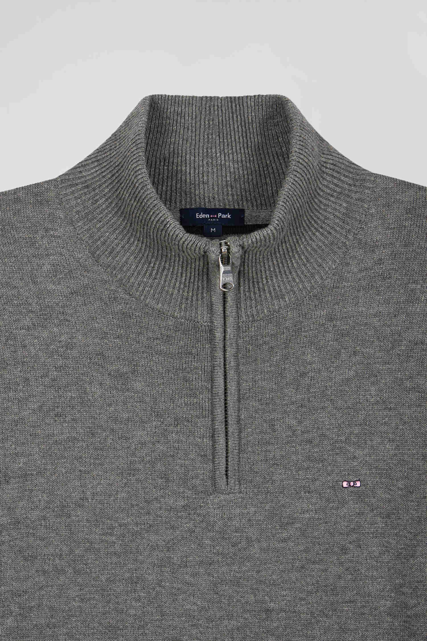 Regular light grey semi-zipped wool and cotton jumper