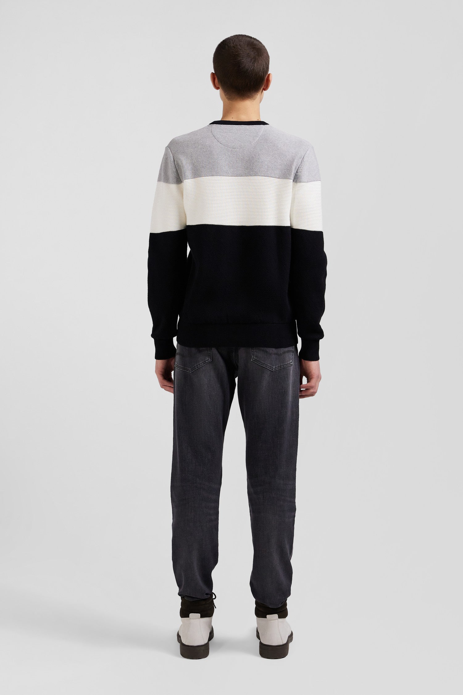 With its contrasting stitch effects achieved through alternating knits, this men's round-neck sweater adds a graphic touch to the silhouette. The cut and sewn assembly inspired by our jerseys lends a trompe-l'oeil effect to this deceptively classic tricolored sweater.