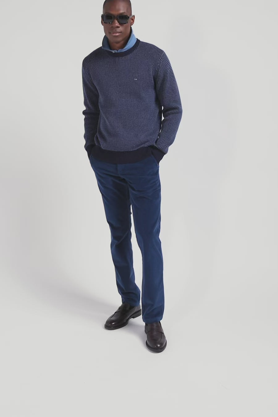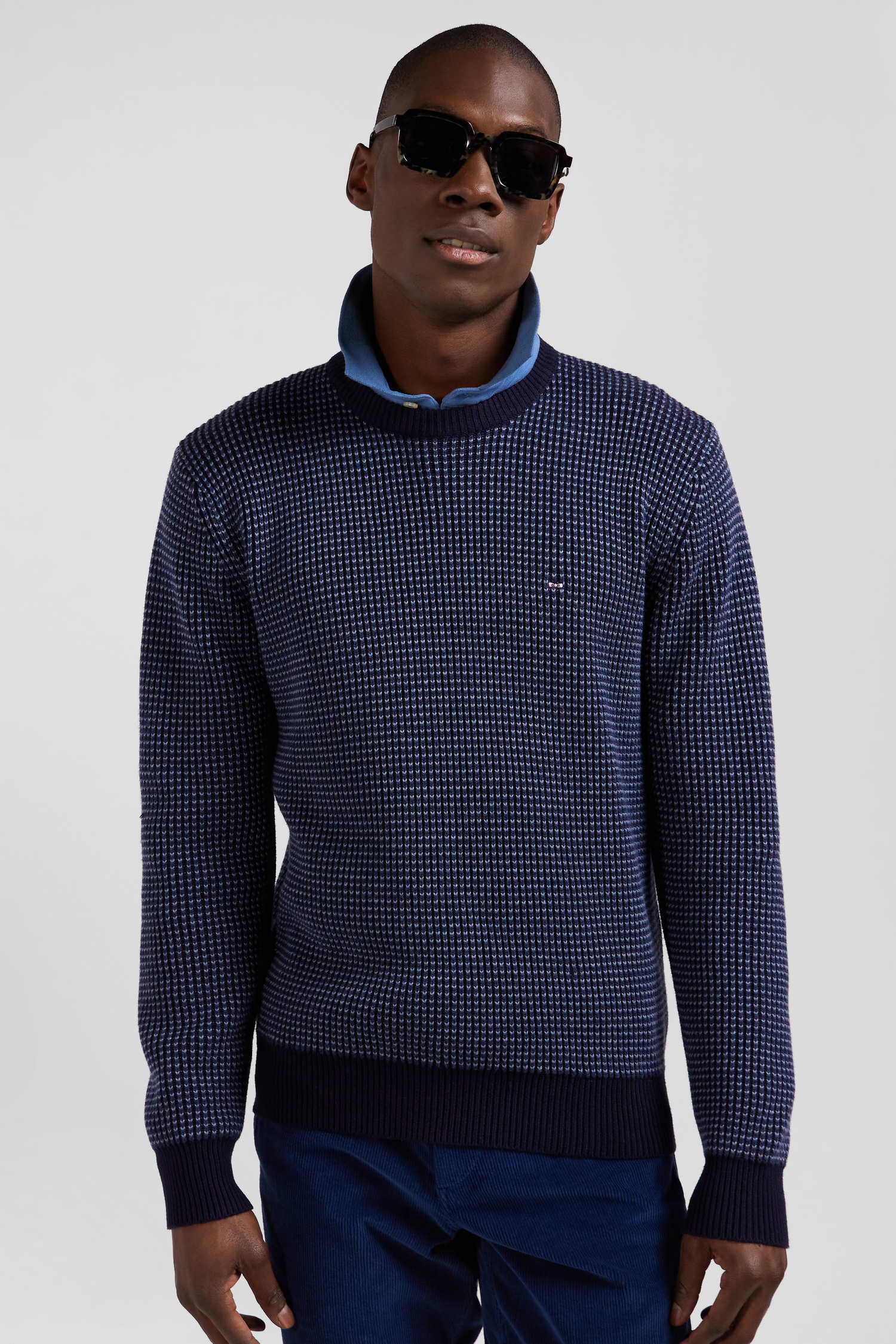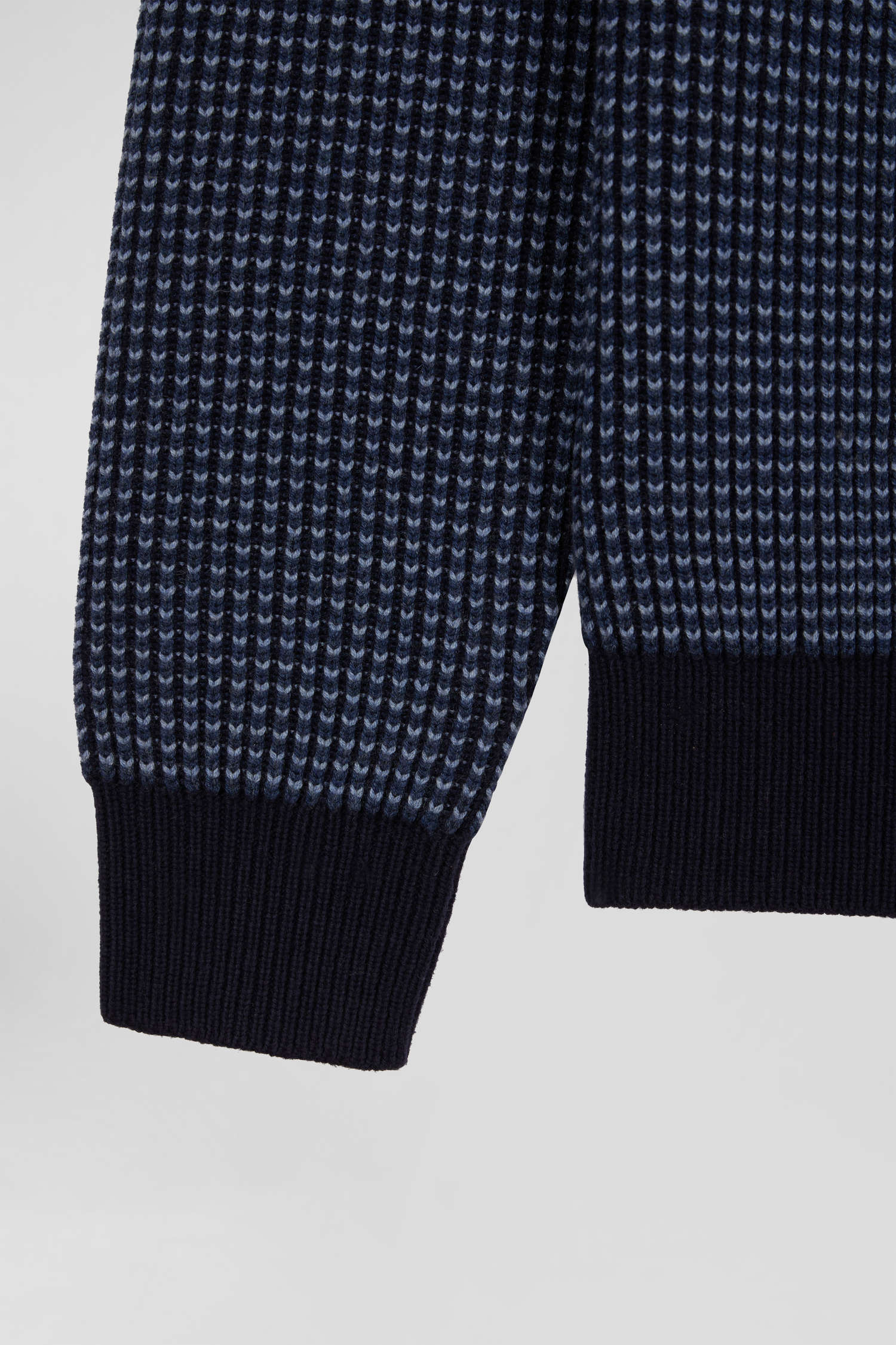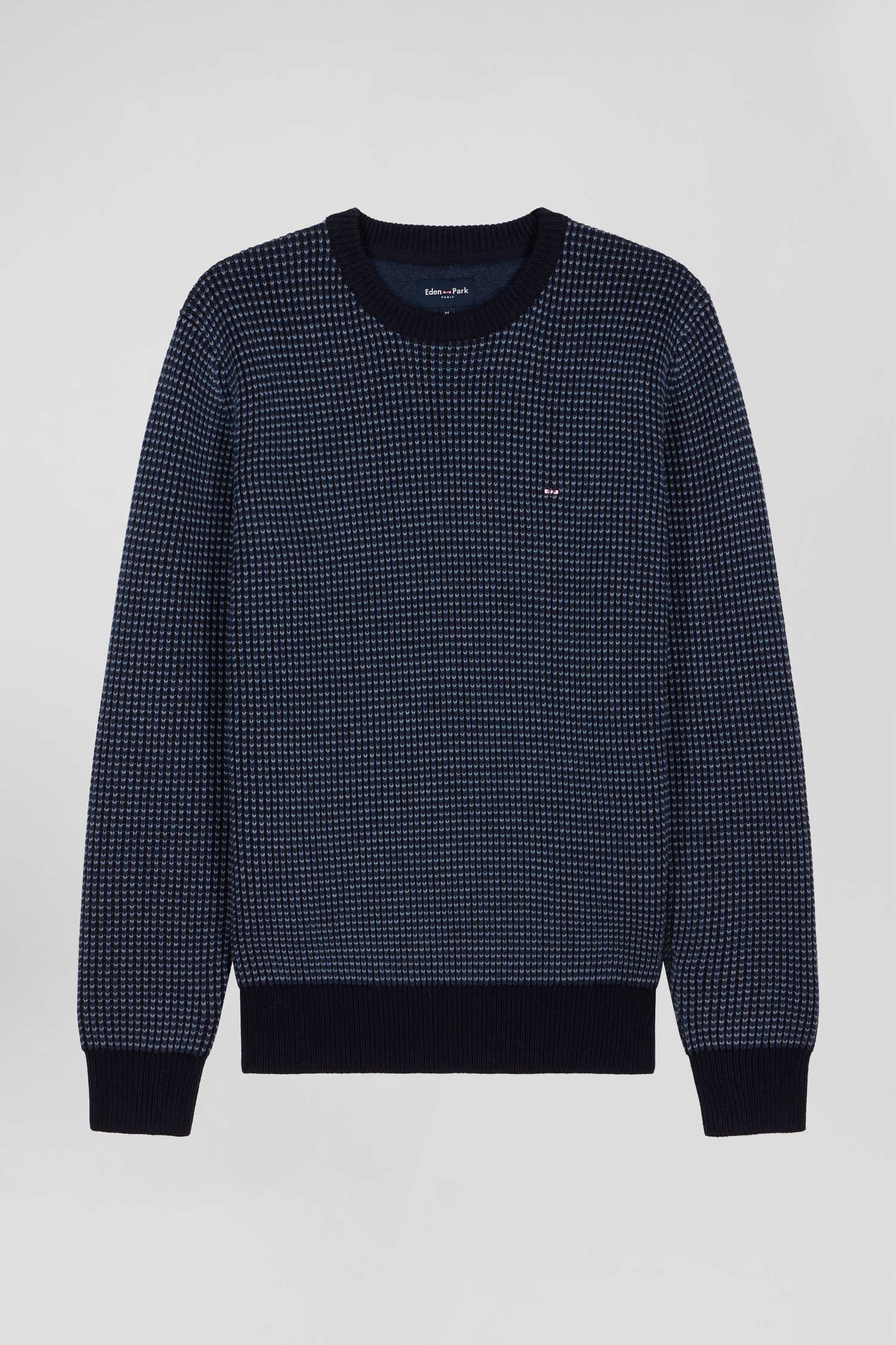 This men's round-neck sweater features contrasting knitwear with a tricolor effect. Its English rib knit gives this winter sweater a touch of originality. Perfect for adding a unique visual dimension to your outfit, this wool and cotton sweater in our timeless colors combines comfort and style with elegance.