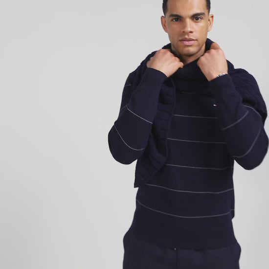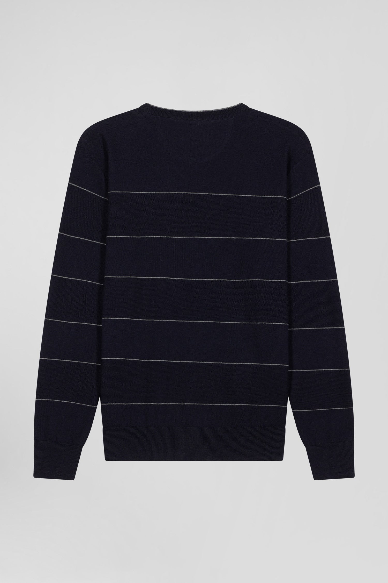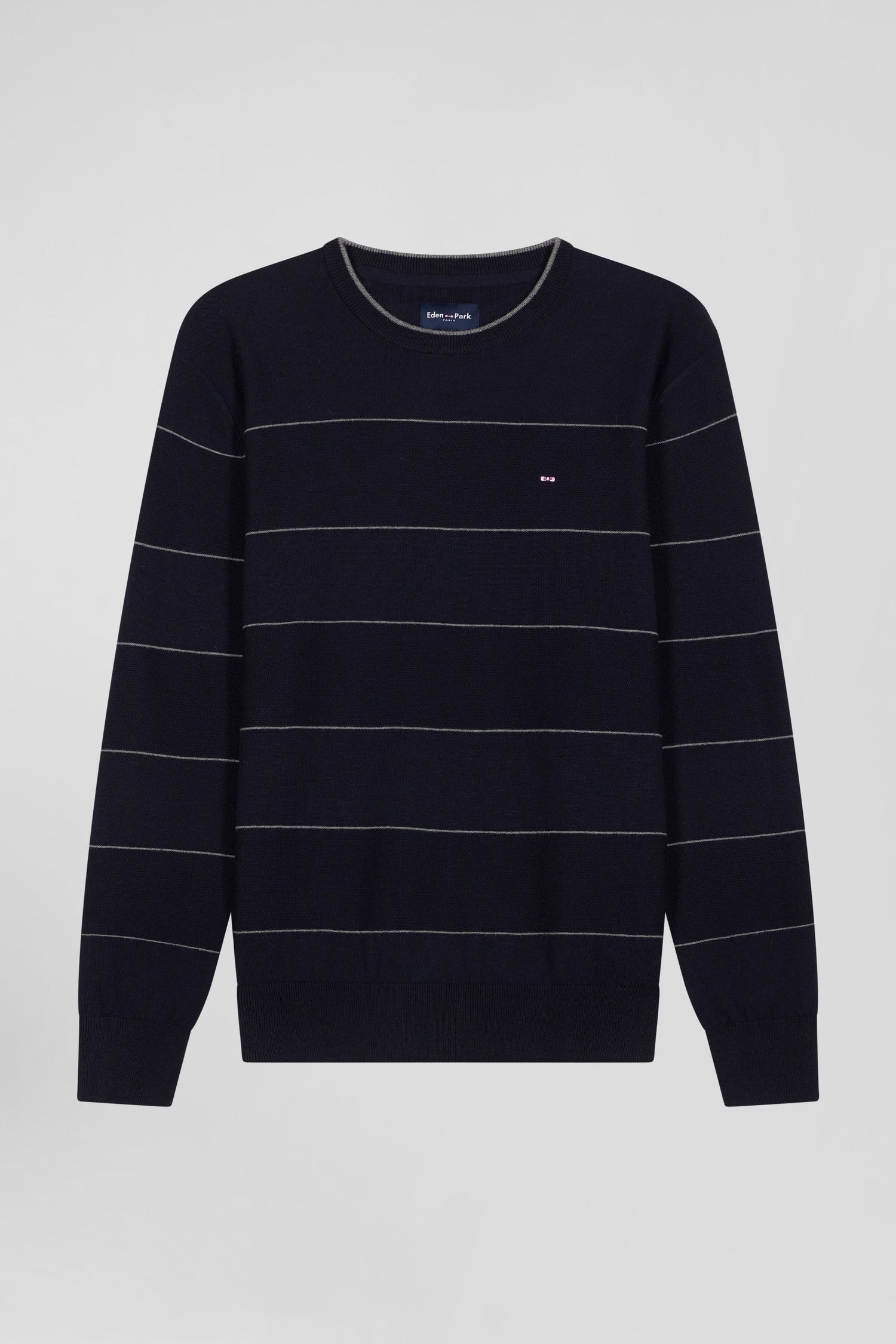 This round-neck sweater, available in shades of navy, grey or brown, features elegant contrasting piping on the collar. Its unique design features alternating stitch and jersey knitting, creating a dynamic stripe effect, with each stripe delineated by a fine contrasting border.