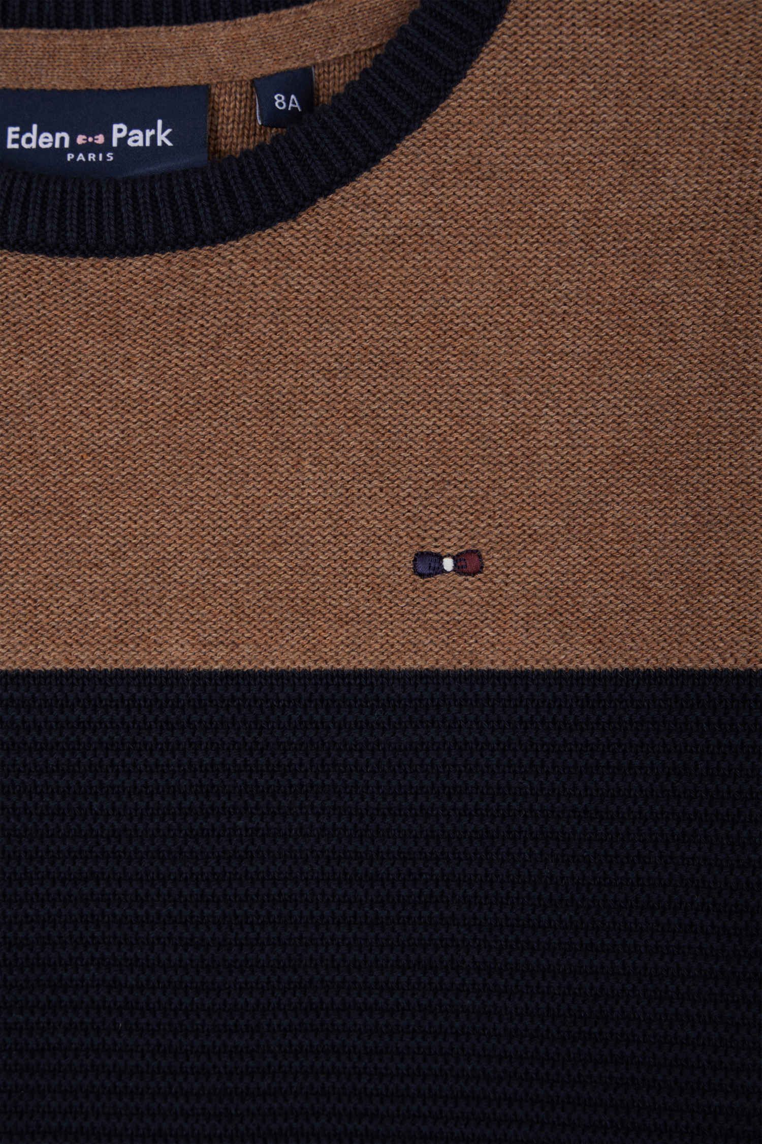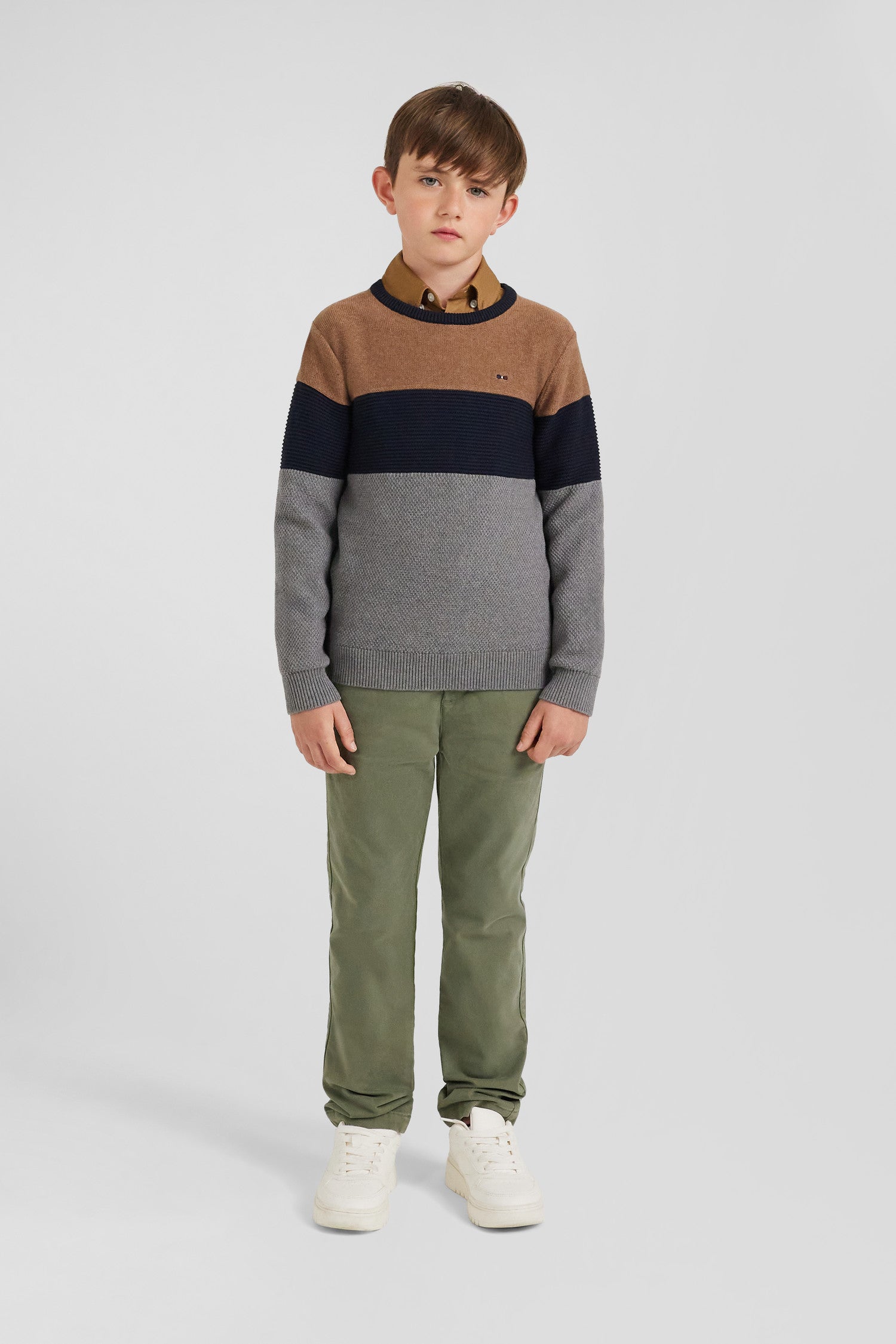 Brighten up your child's autumn-winter wardrobe with this cotton round-neck sweater. Easy to slip on and match, this sweater in soft, durable cotton fiber offers exceptional all-day comfort. Ideal for everyday adventures, this tricolor sweater features our iconic bowtie embroidery in its tricolor version.