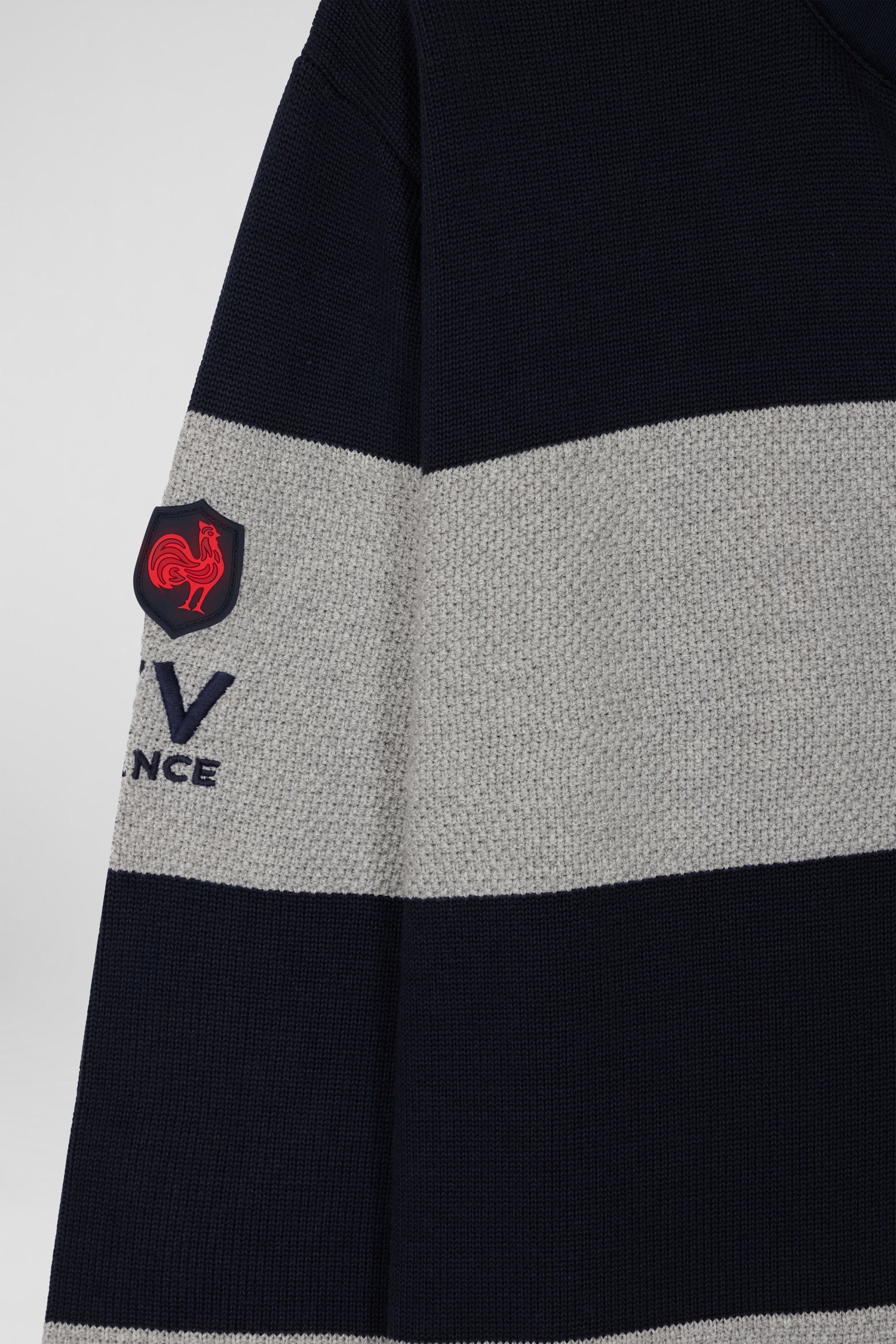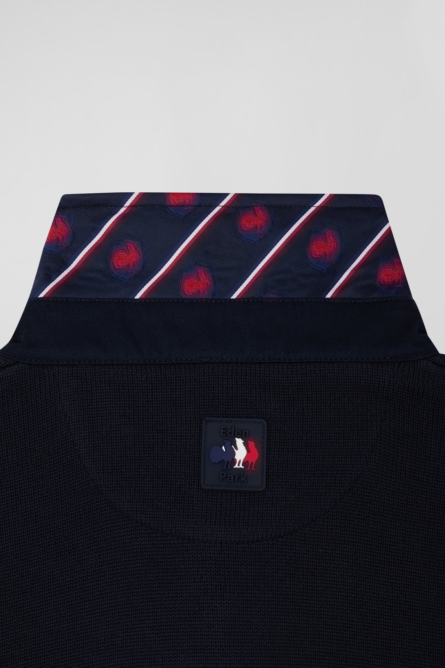 This jersey-neck sweater with hooped stripes brilliantly combines the elegance and sporting spirit of our House. The underside of the collar, adorned with a striped tie fabric, is enriched with embroidery and silicone rubber badges representing Eden Park emblems and those of the XV de France, this 100% cotton piece marries innovation and tradition.