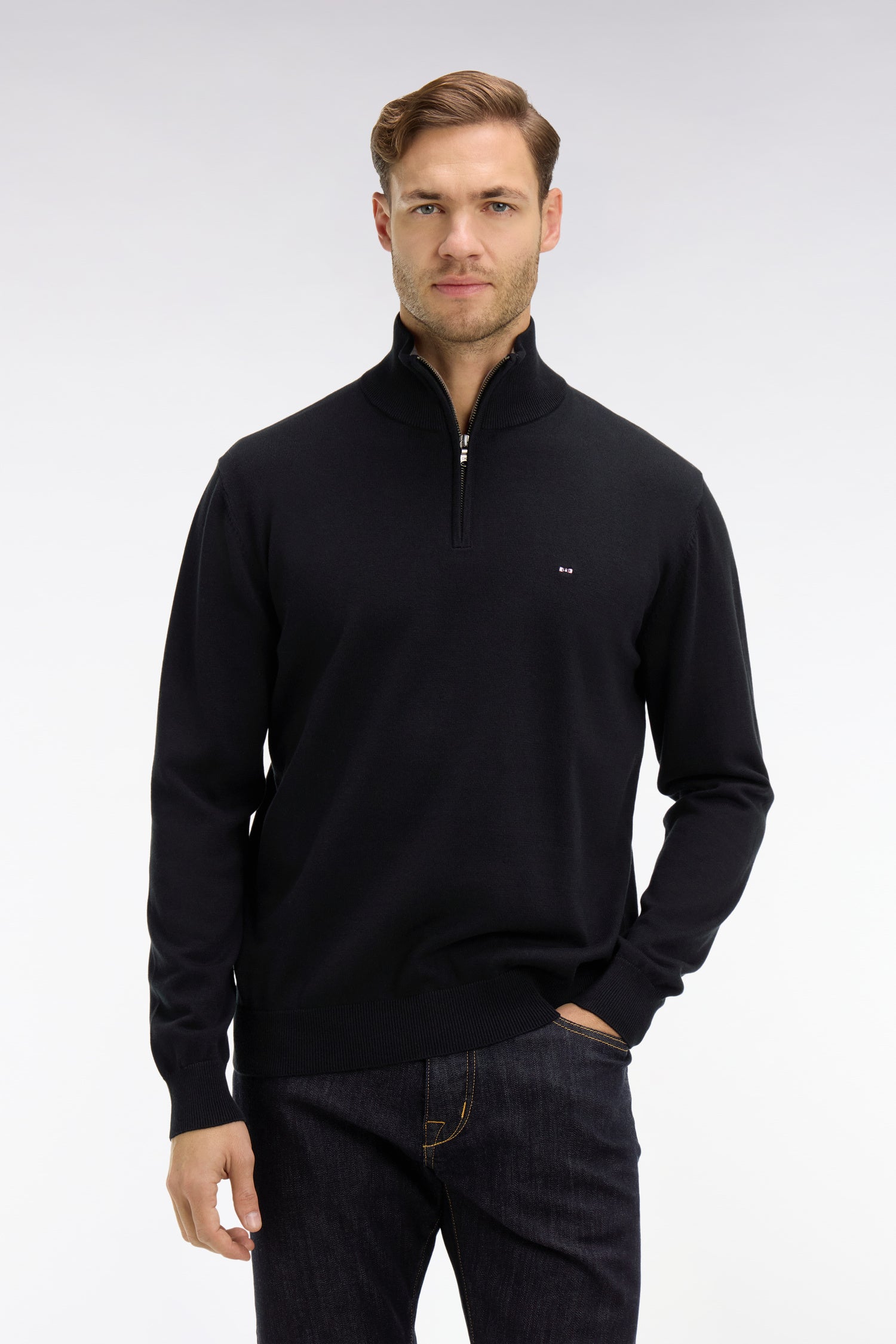 Crafted in a warm, soft cotton knit, this zip trucker neck jumper is all about simplicity. Don't miss this winter must-have, the ideal way to warm up cotton chino trousers and brown leather derbies.