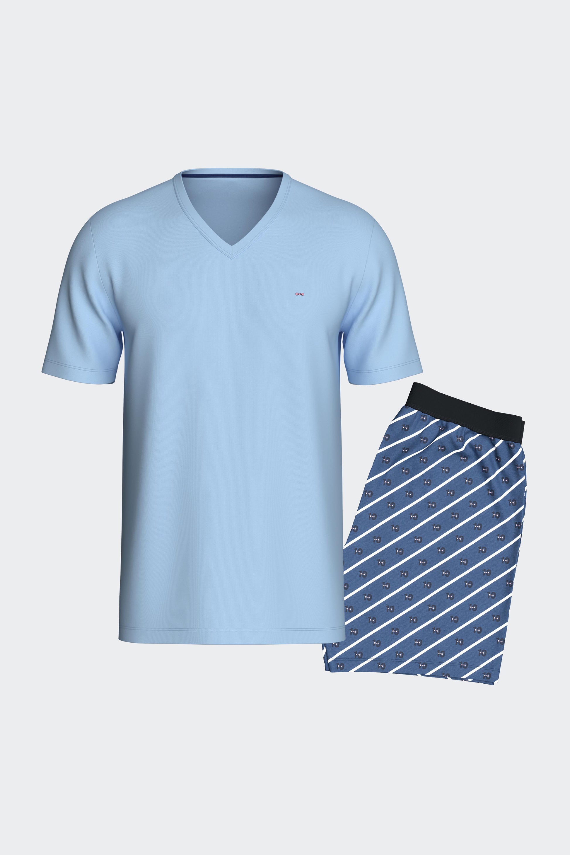 Avec son T-shirt à manches courtes col V en coton bleu et son short à taille élastique orné de micro-motifs exclusifs à notre collection, ce pyjama homme vous garantit une nuit douce tout en restant chic. Ce modèle accompagnera vos rêves toutes la saison estivale.
