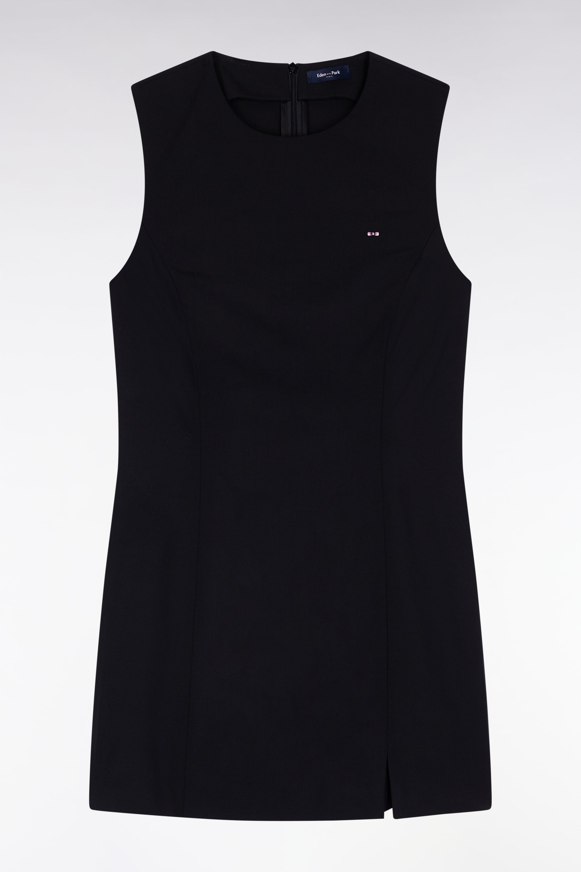 Eden Park's reinterpretation of the timeless little black dress. Crafted in luxurious Italian virgin wool for comfort and durability, this sleeveless dress is an autumn-winter favorite. Minimalist, this black stretch wool dress features a front slit and our signature bowtie embroidery. Looking for a preppy look? Layer it over a white shirt to reveal the collar, and slip a suit jacket of the same length over this short dress. The finishing touch? A pair of loafers and knee-high socks.