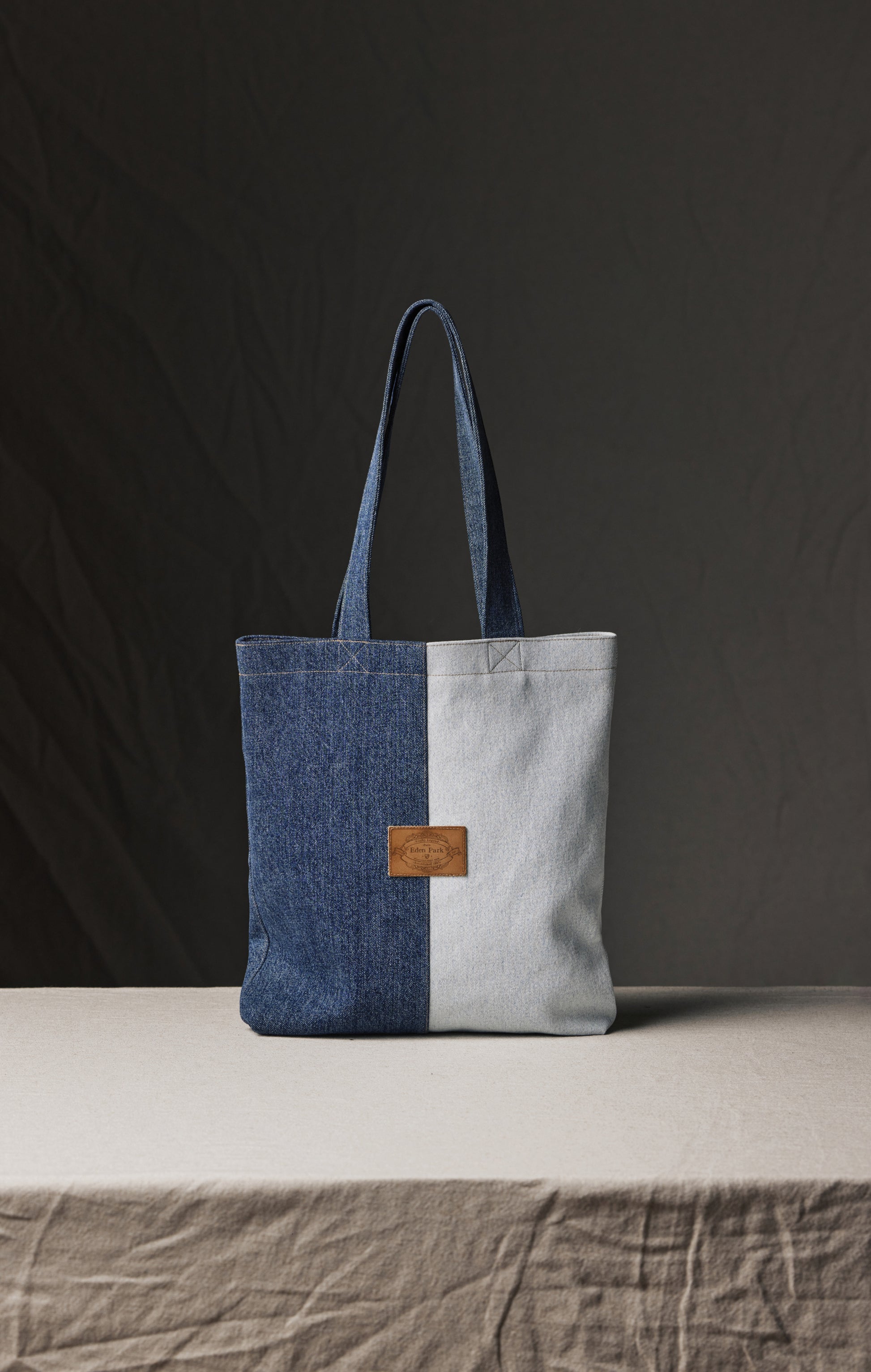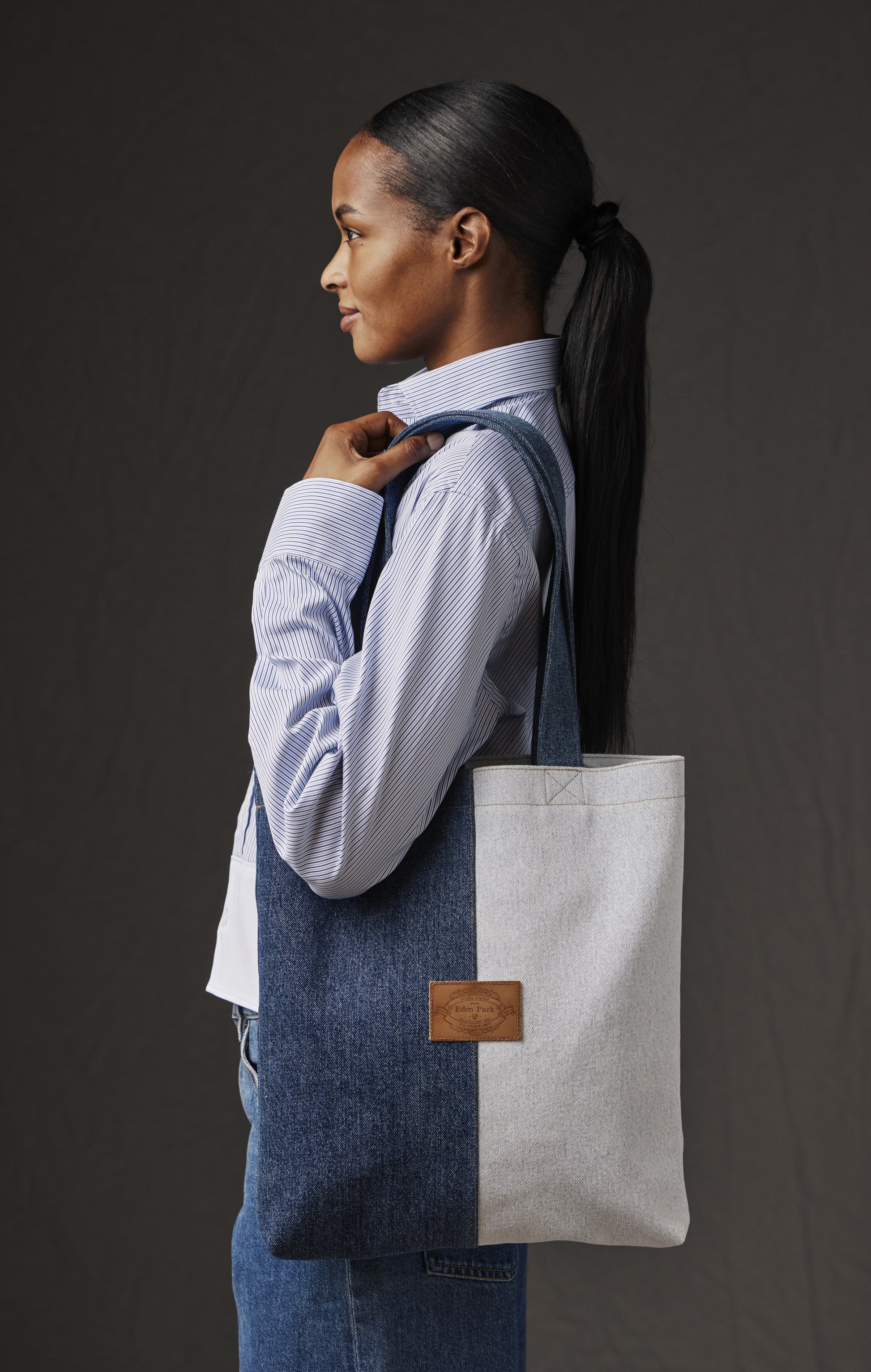 This two-tone tote bag was designed in our workshop from the same archival jeans upcycled to create the tote bag and bob for this Pap'Atelier capsule collection. Light denim and raw denim are assembled in a vertical contrast, inspired by the Japanese rugby jerseys in the Eden Park collections, and embellished with a leather label taken from a pair of jeans. Faithful to our desire to make the most of every resource, this graphic bag features a streamlined silhouette and sturdy construction. A faithful daily ally, this practical yet elegant tote bag features an interior zipped pocket, which promotes recycling, and a canvas lining also taken from our archives. This tote bag reflects creative and committed fashion, designed to give a second life to existing materials. Offered as a limited edition on our website, this model celebrates the rarity and craftsmanship of our fashion house. Dimensions: 37 cm x 40cm