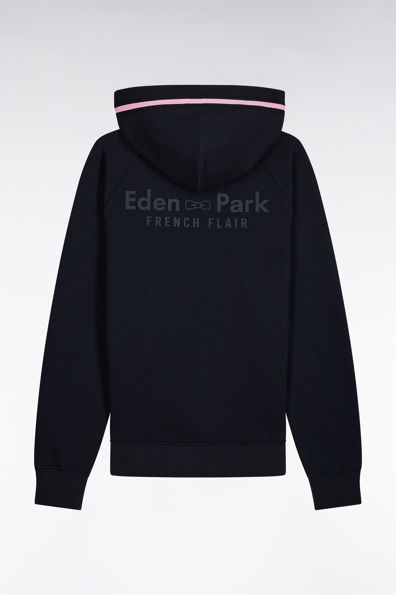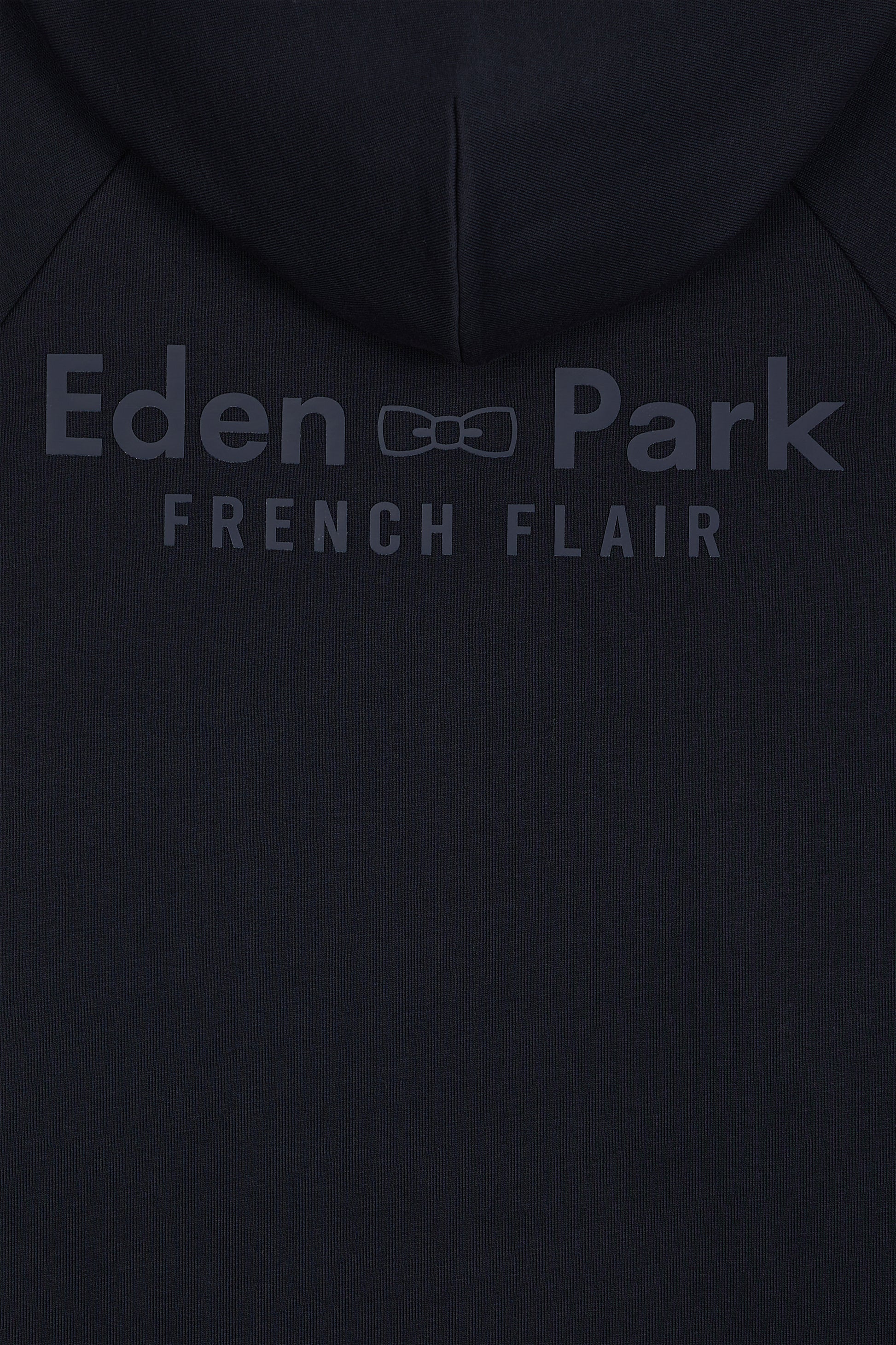 This semi-zipped hooded sweatshirt with its trucker-style collar makes a bold statement with its heavy jersey and impeccable fit. The side slits, enhanced by a striped knit ribbon, add a graphic touch, as does the contrasting hood contour. A tone-on-tone print on the back signs the piece with character. Customized drawstring with Eden Park logo and metallic trim complete this trendy urban style in a loose fit.