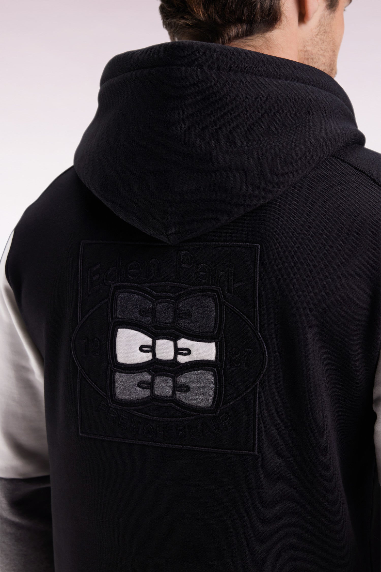 This tricolored hooded sweatshirt in brushed fleece combines comfort and graphic spirit. Its slightly thick fleece offers soft warmth ideal for everyday wear, while the contrasting cut-outs on the sleeves and the lined hood in gray or light colors energize the masculine silhouette. On the back, embroidered jersey inlays add a sporty-chic touch to this sweatshirt designed to keep pace with your lifestyle. Discreet yet distinctive codes, for those who know how to read between the lines of a sophisticated wardrobe, a perfect balance between sportiness and urban allure.