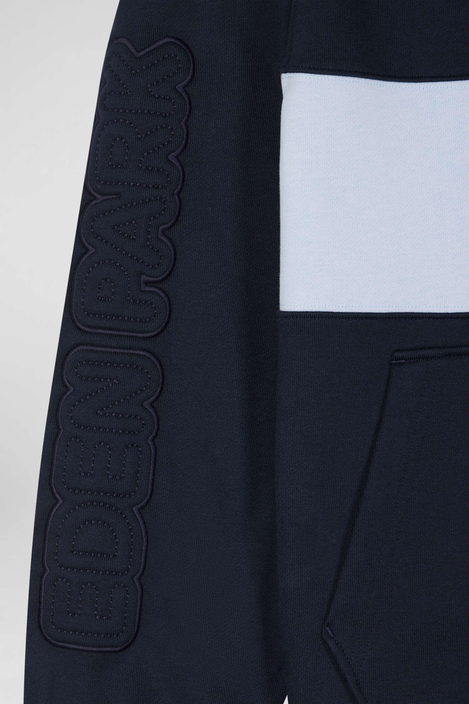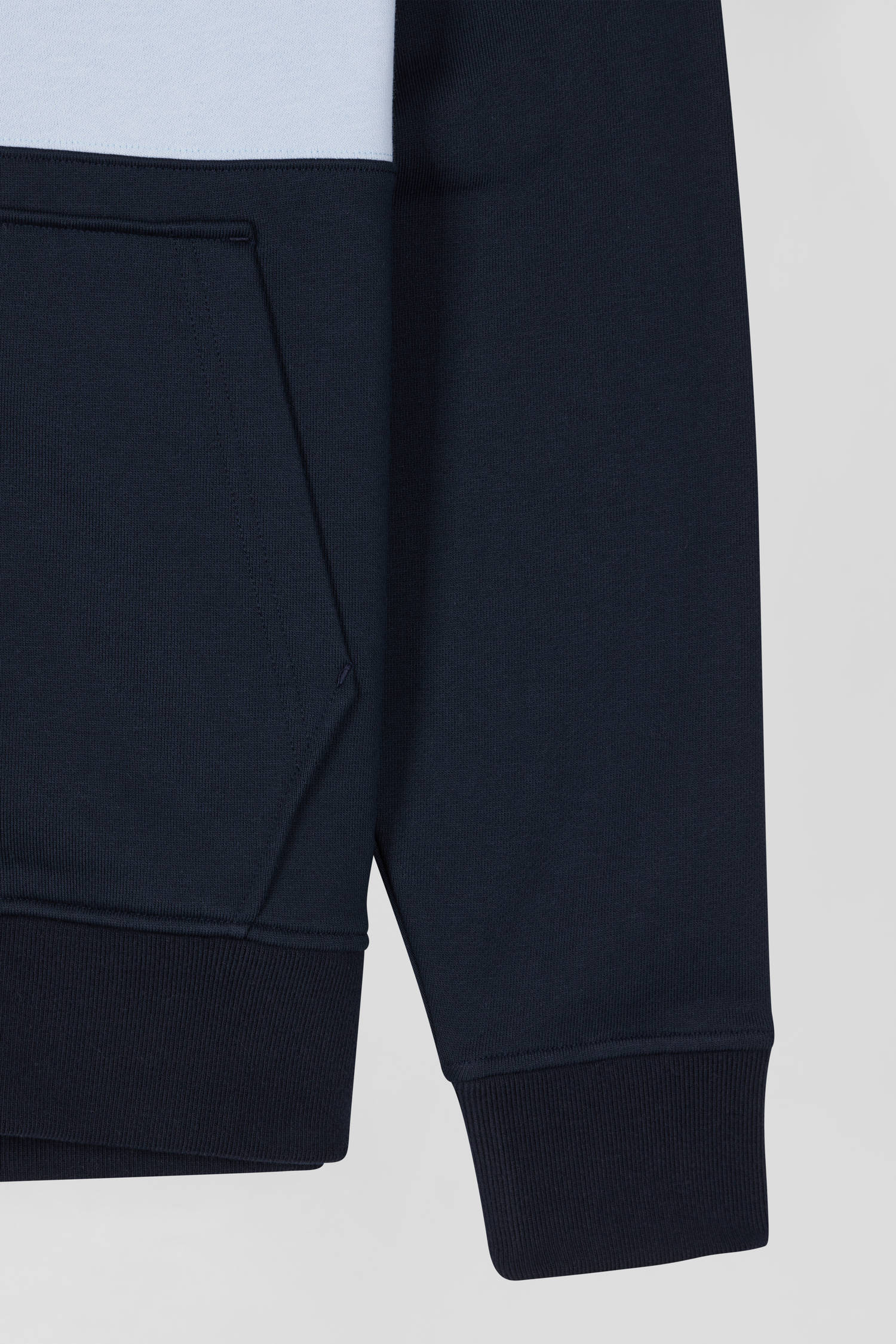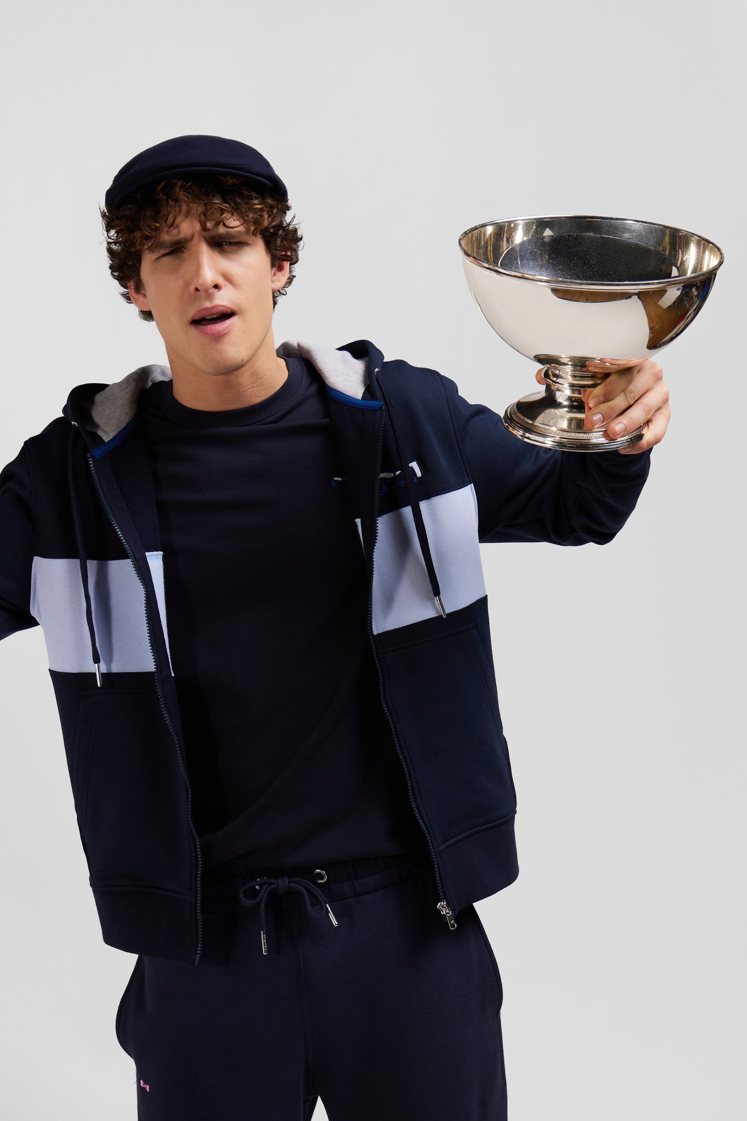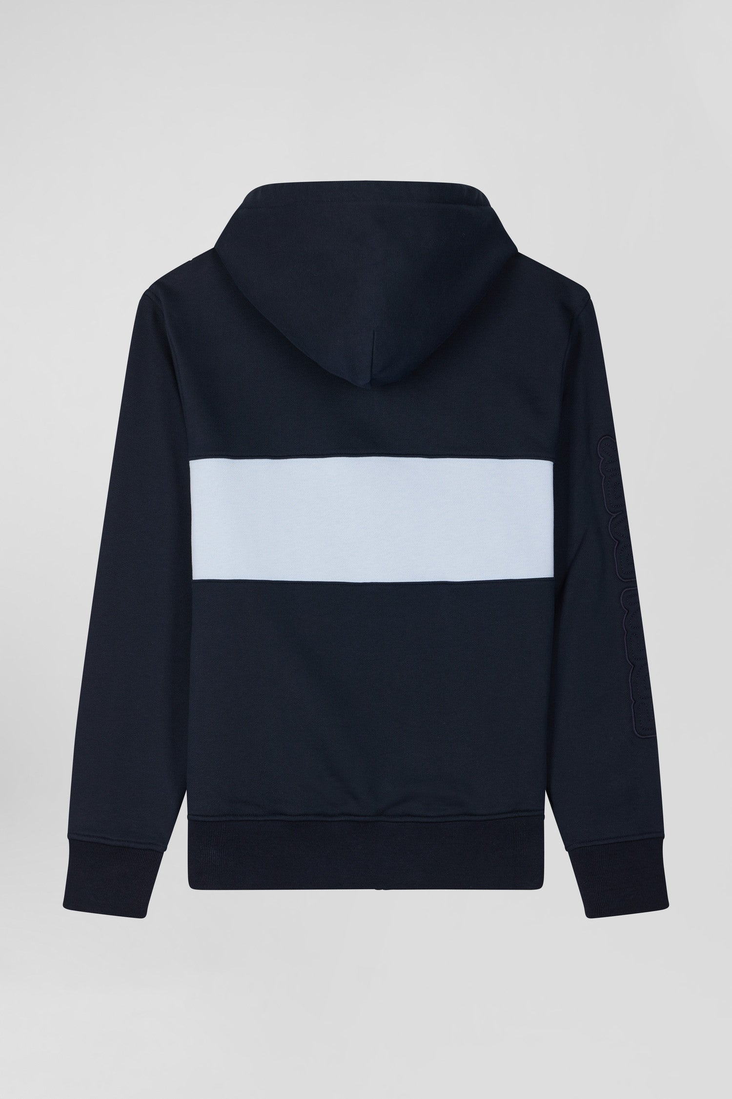 This scratch fleece zip-up hoodie combines comfort and style with its original chest band and quilted embroidery on the sleeve. The hood's mottled gray interior adds a touch of contrast, complemented by metal trim on the hood drawstrings and a colorful jersey backband for a contemporary look.